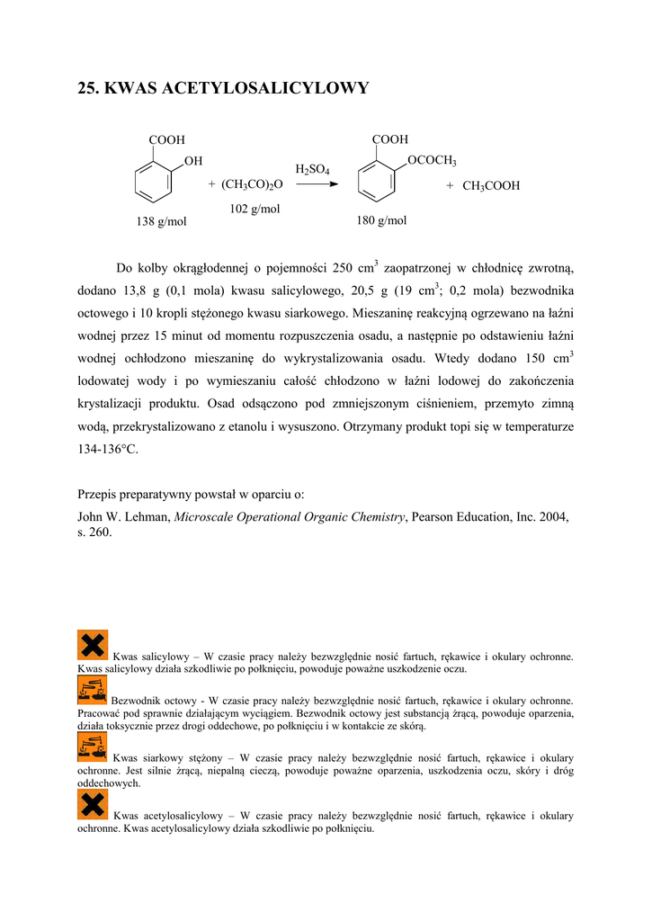 25. KWAS ACETYLOSALICYLOWY COOH COOH OH OCOCH3 H2SO4 + (CH3CO)2O + CH3COOH 102 g/mol 138 g/mol 180 g/mol Do kolby okrągłodennej o pojemności 250 cm3 zaopatrzonej w chłodnicę zwrotną, dodano 13,8 g (0,1 mola) kwasu salicylowego, 20,5 g (19 cm3; 0,2 mola) bezwodnika octowego i 10 kropli stężonego kwasu siarkowego. Mieszaninę reakcyjną ogrzewano na łaźni wodnej przez 15 minut od momentu rozpuszczenia osadu, a następnie po odstawieniu łaźni wodnej ochłodzono mieszaninę do wykrystalizowania osadu. Wtedy dodano 150 cm3 lodowatej wody i po wymieszaniu całość chłodzono w łaźni lodowej do zakończenia krystalizacji produktu. Osad odsączono pod zmniejszonym ciśnieniem, przemyto zimną wodą, przekrystalizowano z etanolu i wysuszono. Otrzymany produkt topi się w temperaturze 134-136°C. Przepis preparatywny powstał w oparciu o: John W. Lehman, Microscale Operational Organic Chemistry, Pearson Education, Inc. 2004, s. 260. Kwas salicylowy – W czasie pracy należy bezwzględnie nosić fartuch, rękawice i okulary ochronne. Kwas salicylowy działa szkodliwie po połknięciu, powoduje poważne uszkodzenie oczu. Bezwodnik octowy - W czasie pracy należy bezwzględnie nosić fartuch, rękawice i okulary ochronne. Pracować pod sprawnie działającym wyciągiem. Bezwodnik octowy jest substancją żrącą, powoduje oparzenia, działa toksycznie przez drogi oddechowe, po połknięciu i w kontakcie ze skórą. Kwas siarkowy stężony – W czasie pracy należy bezwzględnie nosić fartuch, rękawice i okulary ochronne. Jest silnie żrącą, niepalną cieczą, powoduje poważne oparzenia, uszkodzenia oczu, skóry i dróg oddechowych. Kwas acetylosalicylowy – W czasie pracy należy bezwzględnie nosić fartuch, rękawice i okulary ochronne. Kwas acetylosalicylowy działa szkodliwie po połknięciu.