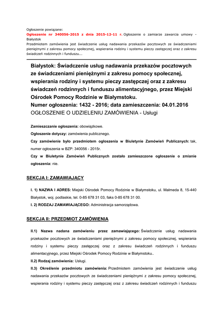 Ogłoszenie powiązane: Ogłoszenie nr 340056-2015 z dnia 2015-12-11 r. Ogłoszenie o zamiarze zawarcia umowy Białystok Przedmiotem zamówienia jest świadczenie usług nadawania przekazów pocztowych ze świadczeniami pieniężnymi z zakresu pomocy społecznej, wspierania rodziny i systemu pieczy zastępczej oraz z zakresu świadczeń rodzinnych i funduszu... Białystok: Świadczenie usług nadawania przekazów pocztowych ze świadczeniami pieniężnymi z zakresu pomocy społecznej, wspierania rodziny i systemu pieczy zastępczej oraz z zakresu świadczeń rodzinnych i funduszu alimentacyjnego, przez Miejski Ośrodek Pomocy Rodzinie w Białymstoku. Numer ogłoszenia: 1432 - 2016; data zamieszczenia: 04.01.2016 OGŁOSZENIE O UDZIELENIU ZAMÓWIENIA - Usługi Zamieszczanie ogłoszenia: obowiązkowe. Ogłoszenie dotyczy: zamówienia publicznego. Czy zamówienie było przedmiotem ogłoszenia w Biuletynie Zamówień Publicznych: tak, numer ogłoszenia w BZP: 340056 - 2015r. Czy w Biuletynie Zamówień Publicznych zostało zamieszczone ogłoszenie o zmianie ogłoszenia: nie. SEKCJA I: ZAMAWIAJĄCY I. 1) NAZWA I ADRES: Miejski Ośrodek Pomocy Rodzinie w Białymstoku, ul. Malmeda 8, 15-440 Białystok, woj. podlaskie, tel. 0-85 678 31 03, faks 0-85 678 31 00. I. 2) RODZAJ ZAMAWIAJĄCEGO: Administracja samorządowa. SEKCJA II: PRZEDMIOT ZAMÓWIENIA II.1) Nazwa nadana zamówieniu przez zamawiającego: Świadczenie usług nadawania przekazów pocztowych ze świadczeniami pieniężnymi z zakresu pomocy społecznej, wspierania rodziny i systemu pieczy zastępczej oraz z zakresu świadczeń rodzinnych i funduszu alimentacyjnego, przez Miejski Ośrodek Pomocy Rodzinie w Białymstoku.. II.2) Rodzaj zamówienia: Usługi. II.3) Określenie przedmiotu zamówienia: Przedmiotem zamówienia jest świadczenie usług nadawania przekazów pocztowych ze świadczeniami pieniężnymi z zakresu pomocy społecznej, wspierania rodziny i systemu pieczy zastępczej oraz z zakresu świadczeń rodzinnych i funduszu alimentacyjnego, przez Miejski Ośrodek Pomocy Rodzinie w Białymstoku w roku 2016, za pośrednictwem strony internetowej wykonawcy.. II.4) Wspólny Słownik Zamówień (CPV): 64.11.00.00-0. SEKCJA III: PROCEDURA III.1) TRYB UDZIELENIA ZAMÓWIENIA: Zamówienie z wolnej ręki III.2) INFORMACJE ADMINISTRACYJNE Zamówienie dotyczy projektu/programu finansowanego ze środków Unii Europejskiej: nie • SEKCJA IV: UDZIELENIE ZAMÓWIENIA IV.1) DATA UDZIELENIA ZAMÓWIENIA: 30.12.2015. IV.2) LICZBA OTRZYMANYCH OFERT: 1. IV.3) LICZBA ODRZUCONYCH OFERT: 0. IV.4) NAZWA I ADRES WYKONAWCY, KTÓREMU UDZIELONO ZAMÓWIENIA: Poczta Polska Spółka Akcyjna, ul. Rodziny Hiszpańskich 8, 00-940 Warszawa, kraj/woj. • mazowieckie. IV.5) Szacunkowa wartość zamówienia (bez VAT): 78334,08 PLN. IV.6) INFORMACJA O CENIE WYBRANEJ OFERTY ORAZ O OFERTACH Z NAJNIŻSZĄ I NAJWYŻSZĄ CENĄ • Cena wybranej oferty: 94000,90 • Oferta z najniższą ceną: 94000,90 / Oferta z najwyższą ceną: 94000,90 • Waluta: PLN . ZAŁĄCZNIK I Uzasadnienie udzielenia zamówienia w trybie negocjacji bez ogłoszenia, zamówienia z wolnej ręki albo zapytania o cenę • 1. Podstawa prawna Postępowanie prowadzone jest w trybie zamówienie z wolnej ręki na podstawie art. 67 ust. 1 pkt 1 lit. b ustawy z dnia 29 stycznia 2004r. - Prawo zamówień publicznych. • 2. Uzasadnienia wyboru trybu Należy podać uzasadnienie faktyczne i prawne wyboru trybu oraz wyjaśnić, dlaczego udzielenie zamówienia jest zgodne z przepisami. Zamawiający może udzielić zamówienia w trybie z wolnej ręki, jeżeli z przyczyn związanych z ochroną praw wyłącznych, wynikających z odrębnych przepisów, usługi mogą być świadczone przez jednego wykonawcę. Przedmiotem zamówienia są usługi pocztowe obejmujące realizację przekazów pocztowych w obrocie krajowym, poprzez doręczanie kwot świadczeń pieniężnych z zakresu pomocy społecznej, wspierania rodziny i systemu pieczy zastępczej oraz z zakresu świadczeń rodzinnych i funduszu alimentacyjnego, w wysokościach określonych w przekazach pocztowych, adresatom-podopiecznym Miejskiego Ośrodka Pomocy Rodzinie w Białymstoku, w miejscach wskazanych przez Zamawiającego (miejscach zamieszkania adresatów) oraz zwrot przekazów pocztowych do Zamawiającego, po wyczerpaniu możliwości ich doręczenia adresatowi, w roku 2016. Zgodnie z art. 15 ustawy z dnia Ustawy z dnia 23 listopada 2012 roku Prawo Pocztowe ( Dz. U. z 2012r. poz. 1529), do przyjmowania przekazów pocztowych ze świadczeniami z ubezpieczeń społecznych, w tym emerytalnymi i rentowymi oraz świadczeniami z pomocy społecznej, a także przekazów pocztowych na tereny wiejskie jest uprawniony wyłącznie operator wyznaczony, którym z mocy ustawy jest Poczta Polska S.A. Z uwagi na powyższe Poczta Polska S.A. jest jedynym uprawnionym wykonawcą do świadczenia usług będących przedmiotem niniejszego zamówienia. Poczta Polska S.A. zapewnia doręczanie ww. świadczeń wszystkim klientom MOPR, także tym nieposiadającym konta bankowego lub posiadającym je, ale pragnącym skorzystać z drogi pocztowej zapewniającej doręczenie pod wskazany adres, co jest istotne szczególnie w przypadku osób starszych i schorowanych. Istotnym jest również fakt, iż Miejski Ośrodek Pomocy Rodzinie w Białymstoku, zobowiązany do stosowania przepisów kodeksu postępowania administracyjnego, na mocy art. 17 ustawy Prawo pocztowe, otrzymuje gwarancję, że potwierdzenie nadania przekazu pocztowego ma moc dokumentu urzędowego. W świetle powyższego usługi pocztowe, polegające na realizacji przekazów pocztowych na rzecz Miejskiego Ośrodka Pomocy Rodzinie w Białymstoku, mogą być świadczone wyłącznie przez Pocztę Polska S.A.