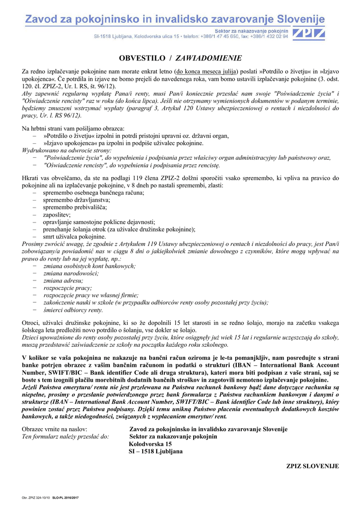 OBVESTILO / ZAWIADOMIENIE Za redno izplačevanje pokojnine nam morate enkrat letno (do konca meseca julija) poslati »Potrdilo o živetju« in »Izjavo upokojenca«. Če potrdila in izjave ne bomo prejeli do navedenega roka, vam bomo ustavili izplačevanje pokojnine (3. odst. 120. čl. ZPIZ-2, Ur. l. RS, št. 96/12). Aby zapewnić regularną wypłatę Pana/i renty, musi Pan/i koniecznie przesłać nam swoje "Poświadczenie życia" i "Oświadczenie rencisty" raz w roku (do końca lipca). Jeśli nie otrzymamy wymienionych dokumentów w podanym terminie, będziemy zmuszeni wstrzymać wypłaty (paragraf 3, Artykuł 120 Ustawy ubezpieczeniowej o rentach i niezdolności do pracy, Ur. l. RS 96/12). Na hrbtni strani vam pošiljamo obrazca: – »Potrdilo o živetju« izpolni in potrdi pristojni upravni oz. državni organ, – »Izjavo upokojenca« pa izpolni in podpiše uživalec pokojnine. Wydrukowano na odwrocie strony: − "Poświadczenie życia", do wypełnienia i podpisania przez właściwy organ administracyjny lub państwowy oraz, − "Oświadczenie rencisty", do wypełnienia i podpisania przez rencistę. Hkrati vas obveščamo, da ste na podlagi 119 člena ZPIZ-2 dolžni sporočiti vsako spremembo, ki vpliva na pravico do pokojnine ali na izplačevanje pokojnine, v 8 dneh po nastali spremembi, zlasti: – spremembo osebnega bančnega računa; – spremembo državljanstva; – spremembo prebivališča; – zaposlitev; – opravljanje samostojne poklicne dejavnosti; – prenehanje šolanja otrok (za uživalce družinske pokojnine); – smrt uživalca pokojnine. Prosimy zwrócić uwagę, że zgodnie z Artykułem 119 Ustawy ubezpieczeniowej o rentach i niezdolności do pracy, jest Pan/i zobowiązany/a powiadomić nas w ciągu 8 dni o jakiejkolwiek zmianie dowolnego z czynników, które mogą wpływać na prawo do renty lub na jej wypłatę, np.: − zmiana osobistych kont bankowych; − zmiana narodowości; − zmiana adresu; − rozpoczęcie pracy; − rozpoczęcie pracy we własnej firmie; − zakończenie nauki w szkole (w przypadku odbiorców renty osoby pozostałej przy życiu); − śmierci odbiorcy renty. Otroci, uživalci družinske pokojnine, ki so že dopolnili 15 let starosti in se redno šolajo, morajo na začetku vsakega šolskega leta predložiti novo potrdilo o šolanju, vse dokler se šolajo. Dzieci upoważnione do renty osoby pozostałej przy życiu, które osiągnęły już wiek 15 lat i regularnie uczęszczają do szkoły, muszą przedstawić zaświadczenie ze szkoły na początku każdego roku szkolnego. V kolikor se vaša pokojnina ne nakazuje na bančni račun oziroma je le-ta pomanjkljiv, nam posredujte s strani banke potrjen obrazec z vašim bančnim računom in podatki o strukturi (IBAN – International Bank Account Number, SWIFT/BIC – Bank identifier Code ali druga struktura), kateri mora biti podpisan z vaše strani, saj se boste s tem izognili plačilu morebitnih dodatnih bančnih stroškov in zagotovili nemoteno izplačevanje pokojnine. Jeżeli Państwa emerytura/ renta nie jest przelewana na Państwa rachunek bankowy bądź dane dotyczące rachunku są niepełne, prosimy o przesłanie potwierdzonego przez bank formularza z Państwa rachunkiem bankowym i danymi o strukturze (IBAN – International Bank Account Number, SWIFT/BIC – Bank identifier Code lub inne struktury), który powinien zostać przez Państwa podpisany. Dzięki temu unikną Państwo płacenia ewentualnych dodatkowych kosztów bankowych, a także niedogodności, związanych z wypłacaniem emerytur/ rent. Obrazec vrnite na naslov: Ten formularz należy przesłać do: Zavod za pokojninsko in invalidsko zavarovanje Slovenije Sektor za nakazovanje pokojnin Kolodvorska 15 SI – 1518 Ljubljana ZPIZ SLOVENIJE Obr. ZPIZ 324-10/10 SLO-PL 2016/2017 POTRDILO O ŽIVETJU / POŚWIADCZENIE ŻYCIA Številka upravičenca / Numer upoważnionego do świadczeń S tem potrjujemo: Niniejszym poświadcza się: da uživalec (-ka) pokojnine: że rencista _______________________ _______________________ ________________________________ ime / imię priimek / nazwisko ___________________________ očetovo ime / imię ojca ___________________________ dekliški priimek / nazwisko panieńskie v rojen (-a) / data urodzenia ______________________________________, w kraj rojstva / miejsce urodzenia državljan (-ka) ____________________________, rezident države ___________________________________________ narodowość rezydent państwa stanujoč (-a) ______________________________________________________________________________________ adres kraj, ulica, hišna številka, pošta, številka pošte, občina / miejscowość, ulica, nr domu, poczta, kod pocztowy, gmina še živi. / nadal żyje. V / Miejscowość ____________________, dne / data __________________________ Žig in podpis pristojnega upravnega oz. državnega organa Pieczęć urzędowa i podpis właściwego organu administracyjnego lub państwowego ---------------------------------------------------------------------------------------------------------------------- ------------------------------------ IZJAVA UPOKOJENCA / OŚWIADCZENIE RENCISTY Podpisani / Ja, niżej podpisany/a:__________________________________________________________________________ priimek in ime / nazwisko i imię Izjavljam, da / niniejszym oświadczam, że prejemam tudi pokojnino iz države / również otrzymuję rentę z _______________________________________________ prejemam le slovensko pokojnino / odbieram rentę tylko ze Słowenii. Izjavljam, da / Oświadczam, że sem / jestem nisem / nie jestem opravljam / pracuję ne opravljam / nie pracuję vpišite državo / podać kraj zaposlen (-a) / zatrudniony/a. samostojno (-e) dejavnost (-i) / we własnej firmie. Izjavljam, da uveljavljam ugodnosti po mednarodni pogodbi o izogibanju dvojnega obdavčevanja. / Oświadczam, że korzystam z prawa do udogodnień na podstawie międzynarodowej umowy o wystrzeganiu się podwójnego opodatkowania. V / Miejs