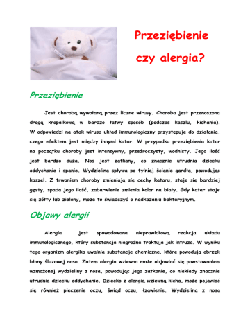 Przeziębienie czy alergia? Przeziębienie Jest chorobą wywołaną przez liczne wirusy. Choroba jest przenoszona drogą kropelkową w bardzo łatwy sposób (podczas kaszlu, kichania). W odpowiedzi na atak wirusa układ immunologiczny przystępuje do działania, czego efektem jest między innymi katar. W przypadku przeziębienia katar na początku choroby jest intensywny, przeźroczysty, wodnisty. Jego ilość jest bardzo duża. Nos jest zatkany, co znacznie utrudnia dziecku oddychanie i spanie. Wydzielina spływa po tylniej ścianie gardła, powodując kaszel. Z trwaniem choroby zmieniają się cechy kataru, staje się bardziej gęsty, spada jego ilość, zabarwienie zmienia kolor na biały. Gdy katar staje się żółty lub zielony, może to świadczyć o nadkażeniu bakteryjnym. Objawy alergii Alergia jest spowodowana nieprawidłową reakcja układu immunologicznego, który substancje niegroźne traktuje jak intruza. W wyniku tego organizm alergika uwalnia substancje chemiczne, które powodują obrzęk błony śluzowej nosa. Zatem alergia wziewna może objawiać się powstawaniem wzmożonej wydzieliny z nosa, powodując jego zatkanie, co niekiedy znacznie utrudnia dziecku oddychanie. Dziecko z alergią wziewną kicha, może pojawiać się również pieczenie oczu, świąd oczu, łzawienie. Wydzielina z nosa w przebiegu alergii zazwyczaj jest wodnista, przeźroczysta, obfita. Może występować napadowe kichanie. Różnice pomiędzy alergią a przeziębieniem Przeziębienie Alergia  Trwa kilka dni, zazwyczaj od  Trwa tak długo, jak dziecko 3 do 14 dni  Najczęściej pojawia się jesienią i zimą  Występują objawy dodatkowe – stany podgorączkowe, bóle gardła, głowy, rozbicie  W otoczeniu maluszka więcej osób może borykać się z chorobą narażone jest na alergen (nawet cały rok)  Najczęściej pojawia się wiosną i latem  Objawom często towarzyszy pieczenie oczu, łzawienie, drapanie w gardle  Nie występują stany podgorączkowe ani gorączka  U dzieci rodziców chorujących na alergię istnieje zwiększona predyspozycja na zachorowanie