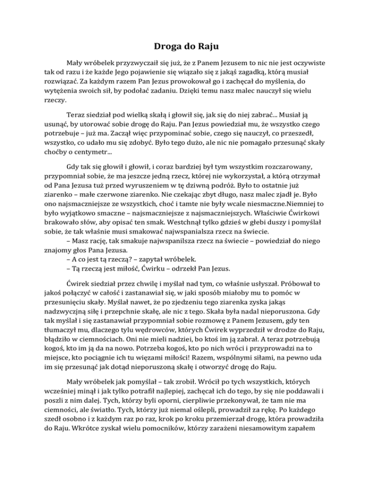 Droga do Raju Mały wróbelek przyzwyczaił się już, że z Panem Jezusem to nic nie jest oczywiste tak od razu i że każde Jego pojawienie się wiązało się z jakąś zagadką, którą musiał rozwiązać. Za każdym razem Pan Jezus prowokował go i zachęcał do myślenia, do wytężenia swoich sił, by podołać zadaniu. Dzięki temu nasz malec nauczył się wielu rzeczy. Teraz siedział pod wielką skałą i głowił się, jak się do niej zabrać... Musiał ją usunąć, by utorować sobie drogę do Raju. Pan Jezus powiedział mu, że wszystko czego potrzebuje – już ma. Zaczął więc przypominać sobie, czego się nauczył, co przeszedł, wszystko, co udało mu się zdobyć. Było tego dużo, ale nic nie pomagało przesunąć skały choćby o centymetr... Gdy tak się głowił i głowił, i coraz bardziej był tym wszystkim rozczarowany, przypomniał sobie, że ma jeszcze jedną rzecz, której nie wykorzystał, a którą otrzymał od Pana Jezusa tuż przed wyruszeniem w tę dziwną podróż. Było to ostatnie już ziarenko – małe czerwone ziarenko. Nie czekając zbyt długo, nasz malec zjadł je. Było ono najsmaczniejsze ze wszystkich, choć i tamte nie były wcale niesmaczne.Niemniej to było wyjątkowo smaczne – najsmaczniejsze z najsmaczniejszych. Właściwie Ćwirkowi brakowało słów, aby opisać ten smak. Westchnął tylko gdzieś w głebi duszy i pomyślał sobie, że tak właśnie musi smakować najwspanialsza rzecz na świecie. – Masz rację, tak smakuje najwspanilsza rzecz na świecie – powiedział do niego znajomy głos Pana Jezusa. – A co jest tą rzeczą? – zapytał wróbelek. – Tą rzeczą jest miłość, Ćwirku – odrzekł Pan Jezus. Ćwirek siedział przez chwilę i myślał nad tym, co właśnie usłyszał. Próbował to jakoś połączyć w całość i zastanawiał się, w jaki sposób miałoby mu to pomóc w przesunięciu skały. Myślał nawet, że po zjedzeniu tego ziarenka zyska jakąs nadzwyczjną siłę i przepchnie skałę, ale nic z tego. Skała była nadal nieporuszona. Gdy tak myślał i się zastanawiał przypomniał sobie rozmowę z Panem Jezusem, gdy ten tłumaczył mu, dlaczego tylu wędrowców, których Ćwirek wyprzedził w drodze do Raju, błądziło w ciemnościach. Oni nie mieli nadziei, bo ktoś im ją zabrał. A teraz potrzebują kogoś, kto im ją da na nowo. Potrzeba kogoś, kto po nich wróci i przyprowadzi na to miejsce, kto pociągnie ich tu więzami miłości! Razem, wspólnymi siłami, na pewno uda im się przesunąć jak dotąd nieporuszoną skałę i otworzyć drogę do Raju. Mały wróbelek jak pomyślał – tak zrobił. Wrócił po tych wszystkich, których wcześniej minął i jak tylko potrafił najlepiej, zachęcał ich do tego, by się nie poddawali i poszli z nim dalej. Tych, którzy byli oporni, cierpliwie przekonywał, że tam nie ma ciemności, ale światło. Tych, którzy już niemal oślepli, prowadził za rękę. Po każdego szedł osobno i z każdym raz po raz, krok po kroku przemierzał drogę, która prowadziła do Raju. Wkrótce zyskał wielu pomocników, którzy zarażeni niesamowitym zapałem Ćwirka, pragnęli mu pomóc. Tym sposobem pod skałą gromadziło się coraz więcej i więcej wędrówców, którzy odkrywali, że miłość rozprasza ciemności i daje światło, by zobaczyć jak wiele można zrobić wspólnie i jak wielką to daje radość. Każdy mógł zasmakować tego, co najsmaczniejsze z najsmaczniejszych – miłości, która ze wszystkich czyniła jedną wielką i szczęśliwą rodzinę. W końcu wędrowców było tak dużo, że byli w stanie ruszyć skałę, która zagradzała im drogę do Raju. Wszyscy zebrali się w sobie i ile tylko mieli sił zaczęli pchać olbrzyma, który powoli odsłąniał upragnioną ścieżkę. Lecz, ku wielkiemu zaskoczeniu wszystkich, gdy skała została odsunięta okazało się, że za nią nic nie ma! – Jak to możliwe? – pomyślał oniemiały wróbelek. – Przecież miała tu być droga do Raju! Przecież tak mi mówił Pan Jezus, a On nigdy mnie nie okłamał... Wszyscy stali jak wmurowani i nie wiedzieli, co się dzieje. – Czyżby to wszystko było na nic? – zastanawiało się wielu. Wszyscy wpatrywali się w miejsce, gdzie dotychczas była skała, ale za nią nie było drogi, której się wszyscy spodziewali. Po chwili jednak pojawiła się znajoma postać Pana Jezusa. Uśmiechnął się i otworzył szeroko ramiona, jakby witając wszystkich. – To już koniec waszej drogi – powiedział Pan Jezus. – Koniec? To Raj jest już tutaj? – zapytał wróbelek. – Tak, dokładnie – odpowiedział Pan Jezus, uśmiechając się serdecznie. – Nie musimy już iść dalej? – dopytywał ciągle malec z niedowierzaniem. – Nie, nie musicie. Wyruszyliście w tę drogę, bo uwierzyliście. Mając nadzieję, nie zwątpiliście w jej sens i nie zniechęciliście się trudnościmi, choć było ich wiele. A na koniec odkryliście, że droga, którą przebyliście jest drogą miłości, która prowadzi do prawdziwego szczęscia, które można dzielić z każdym. Siłą miłości usunęliście skałę, by zobaczyć źródło miłości, czyli mnie, bo Ja jestem Miłością. Rajem jest przebywanie ze Mną i smakowanie każdego dnia miłości, która jako jedyna jest w stanie zaspokoić wszystkie wasze pragnienia i która nigdy się nie kończy. Gdy tylko Pan Jezus skończył mówić, wszystko nagle zniknęło, a nasz malec znalazł się na powrót we własnym łóżku. Powoli otworzył oczy i zobaczył nad sobą przyglądające się mu z wielką uwagą twarze rodziców. – Czemu mi się tak przyglądacie? – zapytał wróbelek. – Masz jakąś dziwnie rozpromienioną twarz dziś rano – odpowiedziała mama. – To pewno dlatego, że miałem wspaniały sen... Taki jeden jedyny w swoim rodzaju, w którym spotkałem Pana Jezusa i przeżyłem niesamowitą przygodę i odkryłem co jest najważniejsze w życiu! – To rzeczywiście musiał by