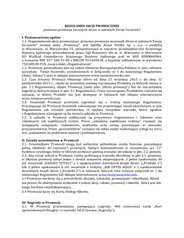 REGULAMIN AKCJI PROMOCYJNEJ „Jesienna promocja soczewek Alcon w salonach Twoje Soczewki” I. Postanowienia ogólne 1.1. Organizatorem akcji promocyjnej „Jesienna promocja soczewek Alcon w salonach Twoje Soczewki” zwanej dalej „Promocją”, jest Spółka Alcon Polska Sp. z o.o. z siedzibą w Warszawie, ul. Marynarska 15, zarejestrowana w rejestrze przedsiębiorców Krajowego Rejestru Sądowego prowadzonym przez Sąd Rejonowy dla m. st. Warszawy w Warszawie XII Wydział Gospodarczy Krajowego Rejestru Sądowego pod nr KRS 0000060964, o numerze NIP 527-109-31-05 i REGON 011429418, o kapitale zakładowym w wysokości 750.000,00 PLN, zwana dalej „Organizatorem”. 1.2. Promocja prowadzona jest na całym obszarze Rzeczpospolitej Polskiej w sieci salonów sprzedaży Twoje Soczewki, wymienionych w Załączniku nr 1 do niniejszego Regulaminu (dalej „Salony”) oraz w sklepie internetowym www.twojesoczewki.com 1.3. Czas trwania Promocji obejmuje okres od dnia 21 września 2015 r. do dnia 31 października 2015 r.., chyba że wcześniej zostaną wyczerpane Produkty (o których mowa w pkt. 2.2 Regulaminu), objęte Promocją (dalej jako „Okres promocji”) lub do wyczerpania nagród (o których mowa w pkt. 3.1 Regulaminu). Przez wyczerpanie Produktów rozumie się sytuację, w której Produkt nie jest dostępny w Salonach lub sklepie internetowym www.twojesoczewki.com. 1.4. Uczestnik Promocji powinien zapoznać się z treścią niniejszego Regulaminu. Przystępując do Promocji Uczestnik zobowiązuje się przestrzegać zasad określonych w tym Regulaminie, jak również potwierdza, iż spełnia wszystkie warunki, które zgodnie z Regulaminem wymagane są do wzięcia udziału w Promocji. 1.5. Z udziału w Promocji wykluczeni są pracownicy Organizatora i Salonów oraz członkowie ich najbliższych rodzin. Przez „członków najbliższej rodziny” rozumie się wstępnych, zstępnych, rodzeństwo, małżonka oraz osoby pozostające w stosunku przysposobienia. Przez „pracowników” rozumie się także osoby wykonujące usługi na rzecz ww. podmiotów na podstawie umowy cywilnoprawnej. II. Zasady uczestnictwa w Promocji 2.1. Uczestnikami Promocji mogą być wyłącznie pełnoletnie osoby fizyczne, posiadające pełną zdolność do czynności prawnych, będące konsumentami w rozumieniu art. 22¹ Kodeksu cywilnego, które w Okresie promocji spełnią warunki określone w pkt. 2.2. poniżej. 2.2. Aby wziąć udział w Promocji, osoba spełniająca warunki określone w pkt 2.1. powinna, w Okresie promocji nabyć jeden z dwóch zestawów obejmujących: 2 pełne opakowania 30 szt. soczewek „DAILIES TOTAL1” z 1 opakowaniem dowolnych kropli Alcon („Produkt 1”) lub 2 pełne opakowania 6 szt. soczewek z rodziny „AIR OPTIX AQUA” z 1 opakowaniem dowolnych kropli Alcon („Produkt 2”) w Salonach, których lista stanowi załącznik nr 1 do niniejszego Regulaminu lub sklepie internetowym www.twojesoczewki.com. 2.3 Promocja nie łączy się z pozostałymi akcjami, rabatami, promocjami i obniżkami. Klient ma prawo do skorzystania wyłącznie z jednej akcji, rabatu, promocji i obniżki, która jest dla niego bardziej satysfakcjonująca. 2.4 Promocja łączy się Kartą Stałego Klienta. III. Nagrody w Promocji 3.1. W Promocji przewidziano następujące nagrody: 400 (czterysta) sztuk „Kart upominkowych Douglas” o wartości 50 zł (zwana „Nagrodą”). 3.2. Nagroda nie podlega wymianie na równowartość w pieniądzu ani na nagrody innego rodzaju. 3.3. Nagroda jest elektronicznym bonem towarowym wydanym na okaziciela, uprawniającym jej posiadacza do jej realizacji w perfumeriach Douglas lub w sklepie internetowym Douglas.pl, zgodnie ze szczegółowymi zasadami określonymi w Regulaminie Karty Upominkowej Douglas dostępnym na stronie: https://www.douglas.pl/douglas/index_c009202.html. IV. Wydawanie nagród w Promocji 4.1. W ramach Promocji, czterystu (400) Uczestników, którzy jako pierwsi spełnią wymagania określone w pkt. 2.2 niniejszego Regulaminu zostaną wydane Nagrody. O pierwszeństwie nabycia prawa do otrzymania Nagrody decyduje chwila zapłaty za Produkty. Wydanie Nagród, z zastrzeżeniem pkt. 3.2., nastąpi niezwłocznie w Salonie, w którym Uczestnik nabył Produkty określone w pkt. 2.2. lub sklepie internetowym poprzez dołączenie Nagrody do zakupionych Produktów. V. Postępowanie reklamacyjne i przedawnienie roszczeń 5.1. Wszelkie reklamacje dotyczące sposobu przeprowadzenia Promocji Uczestnicy powinni zgłaszać na piśmie nie później niż w terminie do dnia 30 listopada 2015 r. O zachowaniu terminu do wniesienia reklamacji decyduje data stempla pocztowego. 5.2. Pisemna reklamacja powinna zawierać: imię, nazwisko i dokładny adres Uczestnika, datę i miejsce zdarzenia, którego dotyczy roszczenie, treść żądania oraz dokładny opis i powód reklamacji. Reklamacje powinny być zgłaszane na adres Organizatora z dopiskiem „Jesienna promocja soczewek Alcon w salonach Twoje soczewki - reklamacja”, jednak dopisek ten nie jest obowiązkowy. 5.3. Reklamacje rozpatrywane są w terminie 14 dni od dnia ich otrzymania przez Organizatora. 5.4. Reklamacje Organizator rozpatruje na podstawie niniejszego Regulaminu. 5.5. Uczestnik jest powiadamiany o decyzji Organizatora listem poleconym wysłanym na adres podany w reklamacji w terminie 7 dni od daty rozpatrzenia reklamacji. W przypadku nieuwzględnienia reklamacji przez Organizatora, Uczestnik ma prawo dochodzić swojego roszczenia na drodze sądowej, zgodnie z pkt. 6.1. VI. Postanowienia końcowe 6.1. Uczestnikowi przysługuje prawo dochodzenia wszelkich roszczeń mogących powstać w związku z niniejszą Promocją przed właściwym sądem powszechnym. 6.2. W kwestiach nieuregulowanych niniejszym Regulaminem stosuje się przepisy Kodeksu cywilnego. 6.3. Zasady przeprowadzania Promocji określa niniejszy Regulamin. Wszelkie materiały promocyjno-reklamowe mają charakter informacyjny i pomocniczy. Wizerunek prz