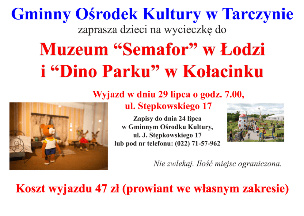 Gminny Ośrodek Kultury w Tarczynie zaprasza dzieci na wycieczkę do Muzeum “Semafor” w Łodzi i “Dino Parku” w Kołacinku Wyjazd w dniu 29 lipca o godz. 7.00, ul. Stępkowskiego 17 Zapisy do dnia 24 lipca w Gminnym Ośrodku Kultury, ul. J. Stępkowskiego 17 lub pod nr telefonu: (022) 71-57-962 Nie zwlekaj. Ilość miejsc ograniczona. Koszt wyjazdu 47 zł (prowiant we własnym zakresie)