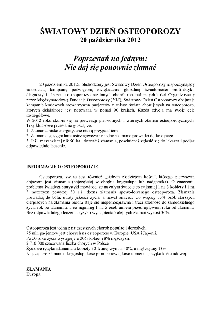 ŚWIATOWY DZIEŃ OSTEOPOROZY 20 października 2012 Poprzestań na jednym: Nie daj się ponownie złamać 20 października 2012r. obchodzony jest Światowy Dzień Osteoporozy rozpoczynający całoroczną kampanię poświęconą zwiększaniu globalnej świadomości profilaktyki, diagnostyki i leczenia osteoporozy oraz innych chorób metabolicznych kości. Organizowany przez Międzynarodową Fundację Osteoporozy (IOF), Światowy Dzień Osteoporozy obejmuje kampanie krajowych stowarzyszeń pacjentów z całego świata chorujących na osteoporozę, których działalność jest notowana w ponad 90 krajach. Każda edycja ma swoje cele szczegółowe. W 2012 roku skupia się na prewencji pierwotnych i wtórnych złamań osteoporotycznych. Trzy kluczowe przesłania głoszą, że: 1. Złamania niskoenergetyczne nie są przypadkiem. 2. Złamania są sygnałami ostrzegawczymi: jedno złamanie prowadzi do kolejnego. 3. Jeśli masz więcej niż 50 lat i doznałeś złamania, powinieneś zgłosić się do lekarza i podjąć odpowiednie leczenie. INFORMACJE O OSTEOPOROZIE Osteoporoza, zwana jest również „cichym złodziejem kości”, którego pierwszym objawem jest złamanie (najczęściej w obrębie kręgosłupa lub nadgarstka). O znaczeniu problemu świadczą statystyki mówiące, że na całym świecie co najmniej 1 na 3 kobiety i 1 na 5 mężczyzn powyżej 50 r.ż. dozna złamania spowodowanego osteoporozą. Złamania prowadzą do bólu, utraty jakości życia, a nawet śmierci. Co więcej, 33% osób starszych cierpiących na złamania biodra staje się niepełnosprawna i traci zdolność do samodzielnego życia rok po złamaniu, a co najmniej 1 na 5 osób umiera przed upływem roku od złamania. Bez odpowiedniego leczenia ryzyko wystąpienia kolejnych złamań wynosi 50%. Osteoporoza jest jedną z najczęstszych chorób populacji dorosłych. 75 mln pacjentów jest chorych na osteoporozę w Europie, USA i Japonii. Po 50 roku życia występuje u 30% kobiet i 8% mężczyzn. 2.710.000 szacowana liczba chorych w Polsce Życiowe ryzyko złamania u kobiety 50-letniej wynosi 40%, a mężczyzny 13%. Najczęstsze złamania: kręgosłup, kość promieniowa, kość ramienna, szyjka kości udowej. ZŁAMANIA Europa W Europie w 2000 roku wystąpiło 3.119 000 złamań, w tym: 620 tys. w obrębie kręgosłupa, 574 tys. kości promieniowej, 490 tys. szyjki kości udowej, a 369 tys. stanowiły pozostałe złamania osteoporotyczne. Co 30 sekund następuje jedno złamanie. Świat Szacuje się, że w 2000r. w świecie doszło do 9 mln złamań osteoporotycznych, z czego liczba złamań szyjki kości udowej wynosiła 1,6 mln. W roku 2050 liczba ta może wzrosnąć nawet do 6,3 mln i stan ten określa się już epidemią złamań. Polska Szacunkowa liczba osób po 50 r.ż. ze złamaniami osteoporotycznymi w Polsce w 2010 – 2,7 mln, w tym: kobiety 2 247 tys., mężczyźni 463 tys. Szacunkowa liczba nowych złamań rocznie wynosi 150 tys. Prognozy Starzenie się społeczeństwa powoduje, że liczba osób ze złamaniem osteoporotycznym wyniesie w Polsce w roku 2025 ok. 3,23 mln, co oznacza wzrost o 32,8% w stosunku do 2008r., a w 2035 – 4,1 mln złamań (u kobiet i mężczyzn). Skutki złamań – ryzyko kalectwa lub śmierci Najcięższym powikłaniem osteoporozy jest złamanie szyjki kości udowej. W ciągu roku od złamania skutkiem powikłań umiera: - 20% kobiet, - 25% mężczyzn. Niepełnosprawność: - 25% wymaga długotrwałego leczenia, - 50% z tych osób, które przeżyją staje się niepełnosprawna. Źródła: www.osteoporoza.pl http://worldosteoporosisday.org http://www.facebook.com/worldosteoporosisday 07_naukowe\01_czerwinski\2012\50.01_IOF_Dzien_osteoporozy_2012.10.20\Dzien_osteoporozy_informacja_(05)_2012-08-02.doc