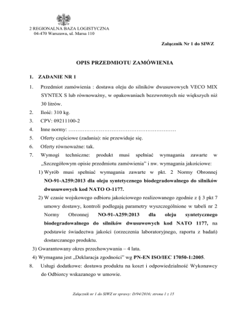 2 REGIONALNA BAZA LOGISTYCZNA 04-470 Warszawa, ul. Marsa 110 Załącznik Nr 1 do SIWZ OPIS PRZEDMIOTU ZAMÓWIENIA 1. ZADANIE NR 1 1. Przedmiot zamówienia : dostawa oleju do silników dwusuwowych VECO MIX SYNTEX S lub równoważny, w opakowaniach bezzwrotnych nie większych niż 30 litrów. 2. Ilość: 310 kg. 3. CPV: 09211100-2 4. Inne normy: …………………………………………………… 5. Oferty częściowe (zadania): nie przewiduje się. 6. Oferty równoważne: tak. 7. Wymogi techniczne: produkt musi spełniać wymagania zawarte w „Szczegółowym opisie przedmiotu zamówienia” i nw. wymagania jakościowe: 1) Wyrób musi spełniać wymagania zawarte w pkt. 2 Normy Obronnej NO-91-A259:2013 dla oleju syntetycznego biodegradowalnego do silników dwusuwowych kod NATO O-1177. 2) W czasie wojskowego odbioru jakościowego realizowanego zgodnie z § 3 pkt 7 umowy dostawy, kontroli podlegają parametry wyszczególnione w tabeli nr 2 Normy Obronnej NO-91-A259:2013 dla oleju syntetycznego biodegradowalnego do silników dwusuwowych kod NATO 1177, na podstawie świadectwa jakości (orzeczenia laboratoryjnego, raportu z badań) dostarczanego produktu. 3) Gwarantowany okres przechowywania – 4 lata. 4) Wymagana jest „Deklaracja zgodności” wg PN-EN ISO/IEC 17050-1:2005. 8. Usługi dodatkowe: dostawa produktu na koszt i odpowiedzialność Wykonawcy do Odbiorcy wskazanego w umowie. Załącznik nr 1 do SIWZ nr sprawy: D/94/2016; strona 1 z 15 2. ZADANIE NR 2 Przedmiot zamówienia : dostawa oleju silnikowego CASTROL EDGE 5W/30 1. lub równoważny, w opakowaniach bezzwrotnych nie większych niż 220 litrów. Ilość: 1 980 kg. 2. gwarantowana – 1 440 kg; opcjonalna – 540 kg; razem (gwarantowana + opcjonalna) – 1 980 kg. 3. CPV: 09211100-2 4. Inne normy: …………………………………………………… 5. Oferty częściowe (zadania): nie przewiduje się. 6. Oferty równoważne: tak. 7. Wymogi techniczne: produkt musi spełniać wymagania zawarte w „Szczegółowym opisie przedmiotu zamówienia” i nw. wymagania jakościowe: Lp. Rodzaj wymagania J.m. Wymagania Metoda badania - jednorodny, przezroczysty, bez zawiesin wzrokowo ASTM D 4052 lub PN-EN ISO 12185:2002 1 Wygląd zewnętrzny 2 Gęstość w temperaturze 15 0C kg/m3 podawać wynik 3 Lepkość kinematyczna, - w temperaturze 100 0C - w temperaturze 40 0C mm2/s od 9,3 do 12,5 podawać wynik - nie niższy niż 154 mPa s nie wyższa niż 6 600 mPa s nie niższa niż 3,4 4 Wskaźnik lepkości 5 6 Lepkość strukturalna w temperaturze minus 30 0C Lepkość dynamiczna HTHS, w temperaturze 150 0C i przy prędkości ścinania 106s-1 7 Temperatura płynięcia 8 9 10 11 Odporność na pienienie: skłonność do pienienia/trwałość piany, - sekwencja I 0 C nie wyższa niż -35 Zawartość wody Temperatura zapłonu % (m/m) 0 C nie więcej niż 0,03 nie niższa niż 210 Popiół siarczanowy % (m/m) nie więcej niż 2,0 ml nie większa niż 10/0 Załącznik nr 1 do SIWZ nr sprawy: D/37/2016; strona 2 z 15 PN-EN ISO 3104:2004 lub ASTM D 445 ASTM D 2270 lub PN-C-04013:1979 lub PN-ISO 2909:2009 PN-C-04150:2004 lub ASTM D 5293 ASTM D 4741 ASTM D 4624 PN-ISO 3016:2005 ASTM D 5950 ASTM D 5985 PN-ISO 3733:20081) PN-EN ISO 2592:2008 PN-C-04077:1982 lub PN-ISO 3987:2005 PN-ISO 6247:2009 lub ASTM D 892 12 13 14 15 - sekwencja II - sekwencja III Działanie korodujące w temperaturze 100 0C, w ciągu 3 h, na płytkach z miedzi Liczba zasadowa Odporność na ścinanie, lepkość kinematyczna w temperaturze 100 0C po 30 cyklach ścinania Zawartość części lotnych metodą Noacka 1) 50/0 10/0 stopień korozji nie wyższy niż 1 PN-EN ISO 2160:2004 mg KOH/g podawać wynik PN-C-04163:1976 lub ASTM D 2896 mm2/s nie niższa niż 9,3 PN-EN ISO 20844:2009 % (m/m) nie wyższa niż 13,0 PN-C-04124:2000 Przy badaniu oleju należy stosować rozpuszczalnik naftowy 1) Olej musi spełniać specyfikację: ACEA C3, VW 503 01, VW 504 00/ 507 00, MB-Approval 229.31/ 229.51. 2) W czasie wojskowego odbioru jakościowego realizowanego zgodnie z § 3 pkt 7 umowy dostawy, kontroli podlegają wszystkie parametry wyszczególnione w powyższej tabeli, na podstawie świadectwa jakości (orzeczenia laboratoryjnego, raportu z badań) dostarczanego produktu. 3) Gwarantowany okres przechowywania – 4 lata. 4) Wymagana jest „Deklaracja zgodności" wg PN - EN ISO/IEC 17050-1:2005. Usługi dodatkowe: dostawa produktu na koszt i odpowiedzialność Wykonawcy 8. do Odbiorcy wskazanego w umowie. 3. ZADANIE NR 3 Przedmiot zamówienia : dostawa oleju parafinowego OMNIS 22 lub 1. równoważny, w opakowaniach bezzwrotnych nie większych niż 220 litrów. Ilość: 2. gwarantowana – 1 100 kg; opcjonalna – 2 400 kg; razem (gwarantowana + opcjonalna) – 3 500 kg. 3. CPV: 09211720-4 4. Inne normy: …………………………………………………… 5. Oferty częściowe (zadania): nie przewiduje się. Załącznik nr 1 do SIWZ nr sprawy: D/37/2016; strona 3 z 15 6. Oferty równoważne: tak. 7. Wymogi techniczne: produkt musi spełniać wymagania zawarte w „Szczegółowym opisie przedmiotu zamówienia” i nw. wymagania jakościowe: Lp. Rodzaj wymagania J.m. Wymagania Metoda badania 1. Gęstość w temperaturze 150C 2. Lepkość kinematyczna, kg/m3 nie niższa niż 830 ASTM D 1298 mm2/s podawać wynik od 19,8 do 24,2 ASTM D 445 - nie niższy niż 90 0 C nie wyższa niż -9 0 nie niższa niż 170 3. 4. 5. - w temperaturze 100 0C - w temperaturze 40 0C Wskaźnik lepkości Temperatura płynięcia 6. Temperatura zapłonu C ASTM D 2270 lub PN-C-04013:1979 lub PN-ISO 2909:2009 PN-ISO 3016:2005 ASTM D 5950 ASTM D 5985 ASTM D 92 1) W czasie wojskowego odbioru jakościowego realizowanego zgodnie z § 3 pkt 7 umowy dostawy, kontroli podlegają wszystkie parametry wyszczególnione w powyższej tabeli, na podstawie świadectwa jakości (orzeczenia laboratoryjnego, raportu z badań) dostarczanego produktu. 2) Gwarantowany okres przechowywania – 2 lata. 3) Wymagana jest 