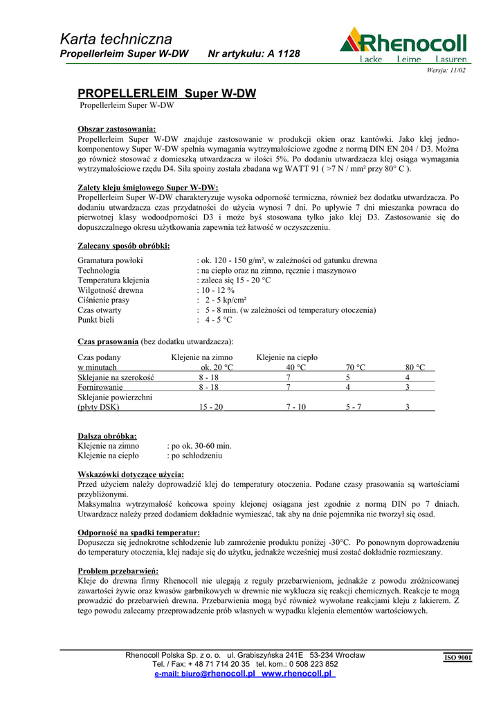 Karta techniczna Propellerleim Super W-DW Nr artykułu: A 1128 Wersja: 11/02 PROPELLERLEIM Super W-DW Propellerleim Super W-DW Obszar zastosowania: Propellerleim Super W-DW znajduje zastosowanie w produkcji okien oraz kantówki. Jako klej jednokomponentowy Super W-DW spełnia wymagania wytrzymałościowe zgodne z normą DIN EN 204 / D3. Można go również stosować z domieszką utwardzacza w ilości 5%. Po dodaniu utwardzacza klej osiąga wymagania wytrzymałościowe rzędu D4. Siła spoiny została zbadana wg WATT 91 ( >7 N / mm² przy 80° C ). Zalety kleju śmigłowego Super W-DW: Propellerleim Super W-DW charakteryzuje wysoka odporność termiczna, również bez dodatku utwardzacza. Po dodaniu utwardzacza czas przydatności do użycia wynosi 7 dni. Po upływie 7 dni mieszanka powraca do pierwotnej klasy wodoodporności D3 i może byś stosowana tylko jako klej D3. Zastosowanie się do dopuszczalnego okresu użytkowania zapewnia też łatwość w oczyszczeniu. Zalecany sposób obróbki: Gramatura powłoki Technologia Temperatura klejenia Wilgotność drewna Ciśnienie prasy Czas otwarty Punkt bieli : ok. 120 - 150 g/m², w zależności od gatunku drewna : na ciepło oraz na zimno, ręcznie i maszynowo : zaleca się 15 - 20 °C : 10 - 12 % : 2 - 5 kp/cm² : 5 - 8 min. (w zależności od temperatury otoczenia) : 4 - 5 °C Czas prasowania (bez dodatku utwardzacza): Czas podany w minutach Sklejanie na szerokość Fornirowanie Sklejanie powierzchni (płyty DSK) Dalsza obróbka: Klejenie na zimno Klejenie na ciepło Klejenie na zimno ok. 20 °C 8 - 18 8 - 18 15 - 20 Klejenie na ciepło 40 °C 7 7 7 - 10 70 °C 5 4 80 °C 4 3 5-7 3 : po ok. 30-60 min. : po schłodzeniu Wskazówki dotyczące użycia: Przed użyciem należy doprowadzić klej do temperatury otoczenia. Podane czasy prasowania są wartościami przybliżonymi. Maksymalna wytrzymałość końcowa spoiny klejonej osiągana jest zgodnie z normą DIN po 7 dniach. Utwardzacz należy przed dodaniem dokładnie wymieszać, tak aby na dnie pojemnika nie tworzył się osad. Odporność na spadki temperatur: Dopuszcza się jednokrotne schłodzenie lub zamrożenie produktu poniżej -30°C. Po ponownym doprowadzeniu do temperatury otoczenia, klej nadaje się do użytku, jednakże wcześniej musi zostać dokładnie rozmieszany. Problem przebarwień: Kleje do drewna firmy Rhenocoll nie ulegają z reguły przebarwieniom, jednakże z powodu zróżnicowanej zawartości żywic oraz kwasów garbnikowych w drewnie nie wyklucza się reakcji chemicznych. Reakcje te mogą prowadzić do przebarwień drewna. Przebarwienia mogą być również wywołane reakcjami kleju z lakierem. Z tego powodu zalecamy przeprowadzenie prób własnych w wypadku klejenia elementów wartościowych. Rhenocoll Polska Sp. z o. o. ul. Grabiszyńska 241E 53-234 Wrocław Tel. / Fax: + 48 71 714 20 35 tel. kom.: 0 508 223 852 e-mail: [email protected] www.rhenocoll.pl ISO 9001 Karta techniczna Propellerleim Super W-DW Nr artykułu: A 1128 Wersja: 11/02 Składowanie: 12 miesięcy, nie dopuszczać do kontaktu z żelazem, chronić przed mrozem Klasa zagrożenia: Nie dotyczy. Opakowania: 12 kg opakowanie 32 kg opakowanie 150 kg opakowanie 1000 kg opakowanie Serwis: Nasz serwis techniczny jest o każdej porze niezobowiązująco do Państwa dyspozycji; Tel./Fax: Tel. kom.: E-Mail: + 48 71 714 20 35 0 508 223 853 [email protected] Niniejsze dane są niezobowiązujące, opierają się na praktycznych doświadczeniach, jak również na przeprowadzonych u nas próbach oraz są niewiążące w myśl najnowszej jurysdykcji kodeksu cywilnego. Ze względu na różnorodność czynników, na które nie mamy wpływu, zalecamy w każdym przypadku przeprowadzenie własnych prób. Dane odbiegające od tych zawartych w kartach technicznych wymagają pisemnego potwierdzenia placówki w Mannheim‘ie. W każdym przypadku obowiązują nasze ogólne warunki handlowe. Z chwilą ukazania się niniejszej instrukcji wszystkie wcześniejsze wydania tracą swoją ważność. Rhenocoll Polska Sp. z o. o. ul. Grabiszyńska 241E 53-234 Wrocław Tel. / Fax: + 48 71 714 20 35 tel. kom.: 0 508 223 852 e-mail: [email protected] www.rhenocoll.pl ISO 9001