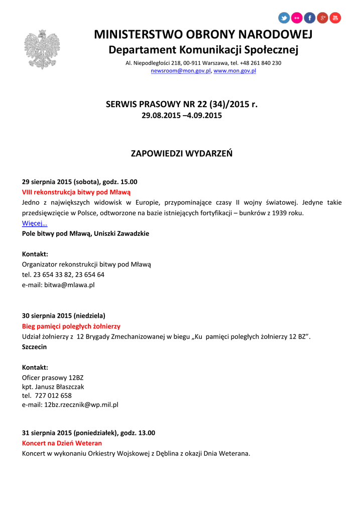 MINISTERSTWO OBRONY NARODOWEJ Departament Komunikacji Społecznej Al. Niepodległości 218, 00-911 Warszawa, tel. +48 261 840 230 [email protected], www.mon.gov.pl SERWIS PRASOWY NR 22 (34)/2015 r. 29.08.2015 –4.09.2015 ZAPOWIEDZI WYDARZEŃ 29 sierpnia 2015 (sobota), godz. 15.00 VIII rekonstrukcja bitwy pod Mławą Jedno z największych widowisk w Europie, przypominające czasy II wojny światowej. Jedyne takie przedsięwzięcie w Polsce, odtworzone na bazie istniejących fortyfikacji – bunkrów z 1939 roku. Więcej… Pole bitwy pod Mławą, Uniszki Zawadzkie Kontakt: Organizator rekonstrukcji bitwy pod Mławą tel. 23 654 33 82, 23 654 64 e-mail: [email protected] 30 sierpnia 2015 (niedziela) Bieg pamięci poległych żołnierzy Udział żołnierzy z 12 Brygady Zmechanizowanej w biegu „Ku pamięci poległych żołnierzy 12 BZ”. Szczecin Kontakt: Oficer prasowy 12BZ kpt. Janusz Błaszczak tel. 727 012 658 e-mail: [email protected] 31 sierpnia 2015 (poniedziałek), godz. 13.00 Koncert na Dzień Weteran Koncert w wykonaniu Orkiestry Wojskowej z Dęblina z okazji Dnia Weterana. Uroczystości towarzyszyć będzie wystawa pt. Polskie lotnictwo wojskowe w II wojnie światowej, w 75. rocznicę Bitwy o Anglię. Warszawa, Centralna Biblioteka Wojskowa (ul. Ostrobramska 109) Kontakt: CBW tel. 261 817 394, 261 817 348 e-mail: [email protected] 1 września 2015 (wtorek) 76. rocznica wybuchu II wojny światowej W garnizonach na terenie całego kraju, z udziałem władz państwowych i samorządowych, odbędą się uroczystości z okazji obchodów 76. rocznicy wybuchu II wojny światowej. Szczegóły w oddzielnym komunikacie. Terytorium RP Kontakt: Departament Komunikacji Społecznej MON tel. + 48 261 840 230 e-mail: [email protected] 1 września 2015 (wtorek) Pożegnanie X zmiany PKW EUFOR/MTT Uroczyste pożegnanie żołnierzy wyjeżdżających, w ramach X zmiany PKW EUFOR/MTT, do Bośni i Hercegowiny. Słupsk Kontakt: 7BOW kpt. Karolina Krzewina – Hyc tel. 721 890 408 e-mail:[email protected] 1 września 2015 (wtorek) Kształcenie muzyków wojskowych Wcielenie i rozpoczęcie szkolenia kadetów kierunku muzycy orkiestr wojskowych (16 kadetów i 2 słuchaczy, szkolenie do marca 2016 roku). Poznań Kontakt: SPWL Marcin Szubert tel. 261 575 349, kom. 663-663-083; e-mail: [email protected] lub e-mail: [email protected] 1 - 2 września 2015 (wtorek - środa) Służba przygotowawcza do NSR Wcielenie żołnierzy w ramach III turnusu służby przygotowawczej do Narodowych Sił Rezerwowych. Węgorzewo, Poznań, Zegrze, Złocieniec Kontakt: 11 Mazurski Pułk Artylerii st. chor. sztab. Robert Kopiczko kom. 603 620 622 CSŁiI Zegrze kpt. Krzysztof Baran tel. 261 883 378, kom. 722 380 054 e-mail: [email protected] CSWLąd Poznań kpt. Piotr Wójcik tel. 261 575 227, kom. 785 402 919 e-mail: [email protected] Oficer prasowy 2BZ kpt. Sebastian Stawiński tel. 727 012 810 e-mail: [email protected] 1 - 4 września 2015 (wtorek - piątek) XXIII Międzynarodowy Salon Przemysłu Obronnego Nadchodząca edycja Międzynarodowego Salonu Przemysłu Obronnego, jak co roku, będzie niosła ze sobą prezentacje najnowszych zdobyczy technologii w służbie obronności. Więcej… Kielce Kontakt: Biuro prasowe targów: Joanna Massalska e-mail: [email protected] tel. 41 365 13 29 (poza dniami targowymi) Barbara Sipa e-mail: [email protected] tel. 41 365 12 55 (Biuro prasowe - czynne w czasie targów) lub 41 365 12 51 (poza dniami targowymi) Patrycja Pawlik e-mail: [email protected] tel. 41 365 12 55 (Biuro prasowe - czynne w czasie targów) lub 518 322 107 (poza dniami targowymi) 1 - 4 września 2015 (wtorek - piątek) Szef SG WP w Chinach Wizyta szefa Sztabu Generalnego WP generała Mieczysława Gocuła w Chinach. Chiny Kontakt: Rzecznik prasowy SG WP płk Tomasz Szulejko tel. +48 261 870 807 kom. 602 431 294 e-mail: [email protected] 1 - 4 września 2015 (wtorek - piątek) Szkolenie skoczków spadochronowych Szkolenie spadochronowo – desantowe żołnierzy z 2 Pułku Rozpoznawczego. Zamość Kontakt: 2 Pułk Rozpoznawczy mjr Andrzej Kołodziej tel. 501502195 Szkolenia poligonowe 1-18 września (wtorek - piątek) Szkolenie poligonowe batalionu czołgów (34 Brygada Kawalerii Pancernej). Żagań Kontakt: 34BKPanc kpt. Rafał Nowak tel. 693 719 535 e-mail: [email protected] 2-26 września (środa- sobota) Szkolenie poligonowe pododdziałów 7 Brygady Obrony Wybrzeża. Centrum Szkolenia Wojsk Lądowych, Drawsko Kontakt: 7 BOW kpt. Karolina Krzewina – Hyc tel. 721 890 408 e-mail:[email protected] 2 - 10 września 2015 (wtorek - czwartek) Tumak-15 Ćwiczenie taktyczne z wojskami pod kryptonimem „Tumak-15”. Bemowo, Orzysz Kontakt: mjr Zbigniew Tuszyński tel. 55 230 22 31, kom. 693 168 261, e-mail: [email protected] 3 - 28 września 2015 (czwartek - poniedziałek) Ćwiczenia rotacyjne NSR Szkolenie rotacyjne w ramach Narodowych Sił Rezerwowych. Świnoujście, Dziwnów Kontakt: 8FOW kmdr ppor. Jacek Kwiatkowski tel. 661 417 739 e-mail: [email protected] 4 września 2015 (piątek) Święta jednostek wojskowych Święto 2 Mazowieckiego Pułku Saperów. Kazuń Nowy Kontakt: 2 Mazowiecki Pułk Saperów mjr Dariusz Urban tel. 782 933 860 e-mail:[email protected] Uroczyste obchody 58. rocznicy sformowania 3 Sandomierskiego Batalionu Radiotechnicznego. Sandomierz Kontakt: Sandomierski Batalion Radiotechniczny kpt. Tomasz Słotwiński tel. 519 038 777 e-mail: [email protected] wrzesień 2015 Zajęcia III turnusu służby przygotowawczej Zajęcia programowe żołnierzy III turnusu służby przygotowawczej, słuchaczy Szkoły Podoficerskiej Wojsk Lądowych. Zajęcia: taktyka, zajęcia ogniowe, inżynieryjno-saperskie – zajęcia dynamiczne z wykorzystaniem środków bojowych, pozoracji pola walki. Centrum Szkolenia Wojsk Lądowych Poznań, Szkoła Podoficerska Wojsk Lądowych w Poznaniu Kontakt: CSWL kpt. Piotr Wójcik tel. 261 575 227, kom. 785 402 919 e-mail:[email protected] SPWL Marcin Szubert tel. 261 575 349, kom. 663 663