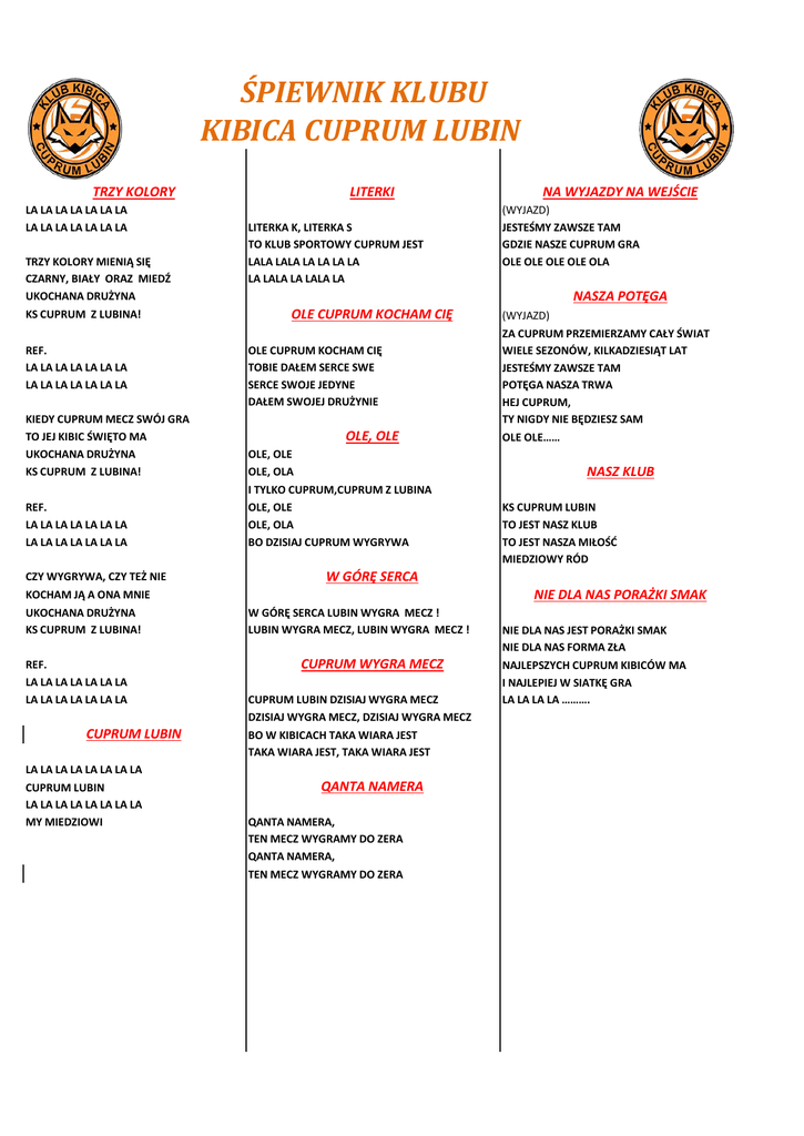 ŚPIEWNIK KLUBU KIBICA CUPRUM LUBIN TRZY KOLORY LA LA LA LA LA LA LA LA LA LA LA LA LA LA TRZY KOLORY MIENIĄ SIĘ CZARNY, BIAŁY ORAZ MIEDŹ UKOCHANA DRUŻYNA KS CUPRUM Z LUBINA! REF. LA LA LA LA LA LA LA LA LA LA LA LA LA LA KIEDY CUPRUM MECZ SWÓJ GRA TO JEJ KIBIC ŚWIĘTO MA UKOCHANA DRUŻYNA KS CUPRUM Z LUBINA! REF. LA LA LA LA LA LA LA LA LA LA LA LA LA LA CZY WYGRYWA, CZY TEŻ NIE KOCHAM JĄ A ONA MNIE UKOCHANA DRUŻYNA KS CUPRUM Z LUBINA! REF. LA LA LA LA LA LA LA LA LA LA LA LA LA LA CUPRUM LUBIN LITERKI LITERKA K, LITERKA S TO KLUB SPORTOWY CUPRUM JEST LALA LALA LA LA LA LA LA LALA LA LALA LA NASZA POTĘGA OLE CUPRUM KOCHAM CIĘ OLE CUPRUM KOCHAM CIĘ TOBIE DAŁEM SERCE SWE SERCE SWOJE JEDYNE DAŁEM SWOJEJ DRUŻYNIE OLE, OLE OLE, OLE OLE, OLA I TYLKO CUPRUM,CUPRUM Z LUBINA OLE, OLE OLE, OLA BO DZISIAJ CUPRUM WYGRYWA (WYJAZD) ZA CUPRUM PRZEMIERZAMY CAŁY ŚWIAT WIELE SEZONÓW, KILKADZIESIĄT LAT JESTEŚMY ZAWSZE TAM POTĘGA NASZA TRWA HEJ CUPRUM, TY NIGDY NIE BĘDZIESZ SAM OLE OLE…… NASZ KLUB KS CUPRUM LUBIN TO JEST NASZ KLUB TO JEST NASZA MIŁOŚĆ MIEDZIOWY RÓD W GÓRĘ SERCA NIE DLA NAS PORAŻKI SMAK W GÓRĘ SERCA LUBIN WYGRA MECZ ! LUBIN WYGRA MECZ, LUBIN WYGRA MECZ ! CUPRUM WYGRA MECZ CUPRUM LUBIN DZISIAJ WYGRA MECZ DZISIAJ WYGRA MECZ, DZISIAJ WYGRA MECZ BO W KIBICACH TAKA WIARA JEST TAKA WIARA JEST, TAKA WIARA JEST LA LA LA LA LA LA LA LA CUPRUM LUBIN LA LA LA LA LA LA LA LA MY MIEDZIOWI NA WYJAZDY NA WEJŚCIE (WYJAZD) JESTEŚMY ZAWSZE TAM GDZIE NASZE CUPRUM GRA OLE OLE OLE OLE OLA QANTA NAMERA QANTA NAMERA, TEN MECZ WYGRAMY DO ZERA QANTA NAMERA, TEN MECZ WYGRAMY DO ZERA NIE DLA NAS JEST PORAŻKI SMAK NIE DLA NAS FORMA ZŁA NAJLEPSZYCH CUPRUM KIBICÓW MA I NAJLEPIEJ W SIATKĘ GRA LA LA LA LA ……….