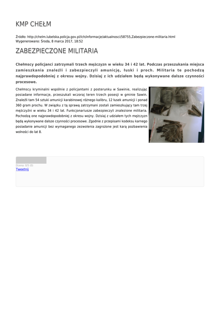 KMP CHEŁM Źródło: http://chelm.lubelska.policja.gov.pl/lch/informacje/aktualnosci/58755,Zabezpieczone-militaria.html Wygenerowano: Środa, 8 marca 2017, 18:52 ZABEZPIECZONE MILITARIA Chełmscy policjanci zatrzymali trzech mężczyzn w wieku 34 i 42 lat. Podczas przeszukania miejsca zamieszkania znaleźli i zabezpieczyli amunicję, łuski i proch. Militaria te pochodzą najprawdopodobniej z okresu wojny. Dzisiaj z ich udziałem będą wykonywane dalsze czynności procesowe. Chełmscy kryminalni wspólnie z policjantami z posterunku w Sawinie, realizując posiadane informacje, przeszukali wczoraj teren trzech posesji w gminie Sawin. Znaleźli tam 54 sztuki amunicji karabinowej różnego kalibru, 12 łusek amunicji i ponad 360 gram prochu. W związku z tą sprawą zatrzymani zostali zamieszkujący tam trzej mężczyźni w wieku 34 i 42 lat. Funkcjonariusze zabezpieczyli znalezione militaria. Pochodzą one najprawdopodobniej z okresu wojny. Dzisiaj z udziałem tych mężczyzn będą wykonywane dalsze czynności procesowe. Zgodnie z przepisami kodeksu karnego posiadanie amunicji bez wymaganego zezwolenia zagrożone jest karą pozbawienia wolności do lat 8. Ocena: 0/5 (0) Tweetnij