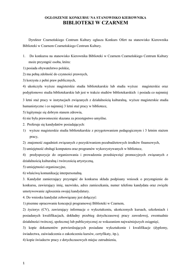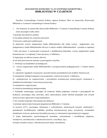 OGŁOSZENIE KONKURSU NA STANOWISKO KIEROWNIKA BIBLIOTEKI W CZARNEM Dyrektor Czarneńskiego Centrum Kultury ogłasza Konkurs Ofert na stanowisko Kierownika Biblioteki w Czarnem Czarneńskiego Centrum Kultury. 1. Do konkursu na stanowisko Kierownika Biblioteki w Czarnem Czarneńskiego Centrum Kultury może przystąpić osoba, która: 1) posiada obywatelstwo polskie, 2) ma pełną zdolność do czynności prawnych, 3) korzysta z pełni praw publicznych, 4) ukończyła wyższe magisterskie studia bibliotekarskie lub studia wyższe magisterskie oraz podyplomowe studia bibliotekarskie lub jest w trakcie studiów bibliotekarskich i posiada co najmniej 3 letni staż pracy w instytucjach związanych z działalnością kulturalną, wyższe magisterskie studia humanistyczne i co najmniej 3 letni staż pracy w bibliotece, 5) legitymuje się dobrym stanem zdrowia, 6) nie była prawomocnie skazana za przestępstwo umyślne. 2. Preferuje się kandydatów posiadających: 1) wyższe magisterskie studia bibliotekarskie z przygotowaniem pedagogicznym i 3 letnim stażem pracy, 2) znajomość zagadnień związanych z pozyskiwaniem pozabudżetowych środków finansowych, 3) umiejętność obsługi komputera oraz programów wykorzystywanych w bibliotece, 4) predyspozycje do organizowania i prowadzenia przedsięwzięć promocyjnych związanych z działalnością kulturalną i twórczością artystyczną, 5) umiejętności organizacyjne, 6) właściwą komunikację interpersonalną. 3. Kandydat zamierzający przystąpić do konkursu składa podpisany wniosek o przystąpienie do konkursu, zawierający imię, nazwisko, adres zamieszkania, numer telefonu kandydata oraz zwięzłe umotywowanie zgłoszenia swojej kandydatury. 4. Do wniosku kandydat zobowiązany jest dołączyć: 1) pisemne opracowanie koncepcji programowej Biblioteki w Czarnem, 2) życiorys (CV), zawierający informacje o wykształceniu, ukończonych kursach, szkoleniach i posiadanych kwalifikacjach, dokładny przebieg dotychczasowej pracy zawodowej, ewentualnie działalności twórczej, społecznej lub publicystycznej ze wskazaniem najważniejszych osiągnięć, 3) kopie dokumentów potwierdzających posiadane wykształcenie i kwalifikacje (dyplomy, świadectwa, zaświadczenia o zakończeniu kursów, certyfikaty, itp.), 4) kopie świadectw pracy z dotychczasowych miejsc zatrudnienia, 1 5) oświadczenie o zdolności do pracy na stanowisku kierowniczym, wystawione przez lekarza medycyny pracy, 6) oświadczenie kandydata o korzystaniu z pełni praw publicznych i o niekaralności za przestępstwo popełnione umyślnie, 7) oświadczenie kandydata o wyrażeniu zgody na przetwarzanie danych osobowych zawartych w zgłoszeniu na potrzeby postępowania konkursowego, 8) kopię dowodu osobistego. II 1. Postępowanie konkursowe rozpoczyna się z dniem ogłoszenia. 2. Ofertę o przystąpieniu do konkursu należy złożyć w Czarneńskim Centrum Kultury w godzinach pracy CCK lub przesłać pocztą. Rozpatrywane będą tylko oferty, które wpłyną do podanego terminu. 3. Wniosek wraz z załącznikami powinien zostać złożony w zamkniętej kopercie zaadresowanej do Dyrektora z dopiskiem: „Konkurs na Kierownika Biblioteki”. Kopertę z wnioskiem i załącznikami należy włożyć do drugiej koperty zaadresowanej Czarneńskie Centrum Kultury, 77-330 Czarne, ul. Kolejowa 14, w którą należy złożyć lub przesłać pocztą na adres CCK do dnia 22 czerwca 2016r. 4. Koperty złożone po terminie nie będą otwierane. 5. Rozstrzygnięcie konkursu przewiduje się na dzień 29 czerwca 2016r. 6. O wynikach konkursu zainteresowani zostaną powiadomieni telefonicznie lub pisemnie przez Dyrektora CCK. 7. Wszelkie dodatkowe informacje, w tym o warunkach organizacyjno – finansowych biblioteki można uzyskać osobiście lub telefonicznie u Dyrektora CCK pod nr (059) 83 32 911 lub 793 587 515 Dyrektor Czarneńskiego Centrum Kultury Marzena Kaczmarska 2