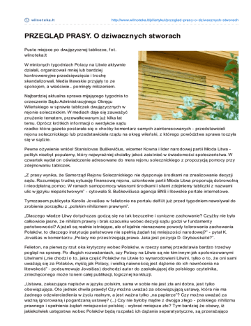 wilno t e ka.lt http://www.wilno teka.lt/pl/artykul/przeglad-prasy-o -dziwacznych-stwo rach PRZEGLĄD PRASY. O dziwacznych stworach Puste miejsce po dwujęzycznej tabliczce, f ot. wilnoteka.lt W minionych tygodniach Polacy na Litwie aktywnie działali, organizowali mniej lub bardziej kontrowersyjne przedsięwzięcia i trochę skandalizowali. Media litewskie przyjęły to ze spokojem, a właściwie... pominęły milczeniem. Najbardziej aktualna sprawa mijającego tygodnia to orzeczenie Sądu Administracyjnego Okręgu Wileńskiego w sprawie tabliczek dwujęzycznych w rejonie solecznickim. W mediach daje się zauważyć znużenie tematem, przewałkowanym już kilka lat temu. Oprócz krótkich inf ormacji o werdykcie sądu rzadko która gazeta postarała się o choćby komentarz samych zainteresowanych - przedstawicieli rejonu solecznickiego lub przedstawiciela rządu na okręg wileński, z którego powództwa sprawa toczyła się w sądzie. Pewne ożywienie wniósł Stanislovas Buškevičius, wicemer Kowna i lider narodowej partii Młoda Litwa polityk niezbyt popularny, który najwyraźniej chciałby jakoś zaistnieć w świadomości społeczeństwa. W czwartek wydał on oświadczenie adresowane do mera rejonu solecznickiego z propozycją pomocy przy zdejmowaniu tabliczek. „Z prasy wynika, że Samorząd Rejonu Solecznickiego nie dysponuje środkami na zrealizowanie decyzji sądu. Rozumiejąc trudną sytuację f inansową rejonu, członkowie partii Młoda Litwa proponują dobrowolną i nieodpłatną pomoc. W ramach samopomocy własnymi środkami i siłami zdejmiemy tabliczki z nazwami ulic w języku niepaństwowym” - cytowała S. Buškevičiusa agencja BNS i litewskie portale internetowe. Tymczasem publicysta Karolis Jovaišas w f elietonie na portalu delf i.lt już przed tygodniem nawoływał do zrobienia porządku z „polskim nihilizmem prawnym”. „Dlaczego władze Litwy dotychczas godzą się na tak bezczelne i cyniczne zachowanie? Czyżby nie było całkowicie jasne, że nihilizm prawny i brak szacunku wobec dezycji sądu godzi w f undamenty państwowości? A jeżeli są realnie istniejące, ale of icjalnie nienazwane powody tolerowania zachowania Polaków, to dlaczego instytucje państwowe nie spełnią żądań tej mniejszości narodowej?” - pytał K. Jovaišas w komentarzu „Polacy nie przestrzegają prawa. Jaka jest pozycja D. Grybauskaitė?”. Felieton, na pierwszy rzut oka krytyczny wobec Polaków, w rzeczy samej przedstawia bardzo trzeźwy pogląd na sprawę. Po długich rozważaniach, czy Polacy na Litwie są nie kim innym jak spolonizowanymi Litwinami („nie chodzi o to, jaka część Polaków na Litwie to wynarodowieni Litwini, tylko o to, że oni sami uważają się za Polaków, myślą jak Polacy, i wielką naiwnością jest dążenie do ich nawrócenia na litewskość” - podsumowuje Jovaišas) dochodzi autor do zaskakującej dla polskiego czytelnika, zniechęconego może tonem całej publikacji, logicznej konkluzji. „Ustawa, zakazująca napisów w języku polskim, sama w sobie nie jest zła ani dobra, jest tylko obowiązująca. Oto jednak chwila prawdy! Czy można uważać za obowiązującą ustawę, która nie ma żadnego odzwierciedlenia w życiu realnym, a jest ważna tylko „na papierze”? Czy można uważać za ważną ignorowaną i pogardzaną ustawę? (...) Czy nie byłoby mądre z dwojga złego - polskiego nihilizmu prawnego i spełnienia żądań mniejszości polskiej - wybrać mniejsze zło? Tym bardziej że obawy, iż jakiekolwiek ustępstwa wobec Polaków będą rozpalać ich dążania separatystyczne, są przerażająco naiwne” - pisze K. Jovaišas. Autor proponuje, by sprawy wzięła w swoje ręce prezydent Grybauskaitė, inicjując odpowiednie poprawki do ustawy, w myśl których polskie napisy stałyby się legalne. O tym, że problemy z nazewnictwem ulic i pisownią nazwisk muszą zostać rozwiązane, pisze także Andrius Bačiulis w tygodniku „Veidas”. W f elietonie „Z a parę tygodni pogodzimy się z Polską?” autor analizuje przyszłość stosunków międzypaństwowych. Z daniem Bačiulisa można liczyć na ocieplenie. „To, że odwilż rozpoczęła się zaledwie po upływie trzech miesięcy (od odmowy wzięcia udziału w obchodach Święta Niepodległości Polski przez Dalię Grybauskaitė - przyp. aut.) i że inicjatywę polepszenia stosunków bardziej okazuje Warszawa, jest naprawdę dobrą wiadomością”. Niżej dodaje jednak, że „bez rozwiązania problemu pisowni polskich nazwisk Warszawa nie będzie wchodziła w żadne poważne rozmowy nawet na tematy czysto ekonomiczne. W Polsce to już stało się kwestią zasadniczą i sprawą prestiżu państwa i żaden polityk - ani pragmatyczny Donald Tusk, ani powściągliwy Bronisław Komorowski - nie pójdą na ustępstwa w tej sprawie”. A normalne stosunki Litwy i Polski powinny się zasadzać nie tylko na pisowni nazwisk, także wspólnych interesów energetycznych - przypomina A. Bačiulis. Podczas gdy jedni publicyści patrzą w przyszłość, inni szukają pretekstów do pojednania w przeszłości. Ramūnas Bogdanas na Delf i.lt uderzył w ton poetycki w artykule „Postanie roku 1863: łączy nas z Polakami przelana krew”. „Stosunki Litwy z Polską w biegu historii pełne są upadków i wzlotów, braterstwa i złości. W żadnym okresie nie znajdziemy tylko wzajemnej obojętności. Jesteśmy jak dwa brzegi rzeki, które łączą upływające stulecia. Z przeciwnego brzegu rzeka wygląda inaczej, jest jednak wspólna, i to dzięki niej jesteśmy tacy, jacy jesteśmy”. Powstanie styczniowe wywołało w mediach także inne echa. Z okazji obchodów 150-lecia powstania styczniowego media pisały o wystawie prac Artura Grottgera, którą zorganizował Instytut Polski wspólnie z Litewskim Muzeum Sztuki. W otwarciu ekspozycji brali udział premier Litwy Algirdas Butkevičius i ambasador RP w Wilnie Janusz Skolimowski. Toteż w doniesieniach prasowych nie brakło ugr