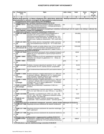 KOSZTORYS OFERTOWY WYKONAWCY Lp. Podstawa wyceny Opis Jedn. miary Wartość zł (5 x 6) 1 2 3 4 5 6 7 Budowa drogi gminnej - ul. Bema w Rydzynie CPV: 45233120-6, 45232130-2 /Roboty budowlane w zakresie budowy dróg, Roboty budowlane w zakresie rurociągów do odprowadzania wody burzowej/ 1 Przygotowanie terenu pod budowę CPV 45100000-8 1.1 Odtworzenie trasy i punktów wysokościowych D-01.01.01 1 KNNR 1 0111- Roboty pomiarowe przy liniowych robotach ziemnych - km 0.131 d.1. 01 trasa dróg w terenie równinnym. / obsługa geodezyjna i 1 inwentaryzacja powykonawcza / 2 Roboty budowlane w zakresie wznoszenia kompletnych obiektów budowlanych lub ich części oraz roboty w zakresie iŜynierii lądowej i wodnej CPV 45200000-9 2.1 Wykonanie wykopów w gruntach nieskalistych D-02.01.01 2 KNR 2-01 0206- Roboty ziemne wykon.koparkami podsiębiernymi o m3 916.682 d.2. 02 poj.łyŜki 0.40 m3 w gr.kat.III z transp.urobku 1 samochod.samowyładowczymi na odległość do 1 km korytowanie, wykop pod studnie, wpusty, kd 315, przykanaliki wraz z opłatą za składowanie - 90% robót ziemnych 3 KNR 2-01 0301- Ręczne roboty ziemne z transportem urobku samocho- m3 101.853 d.2. 02 dami samowyładowczymi (kat.gr.III) - 10 % robót ziem1 nych 4 KNR 2-01 0214- Nakłady uzupełn.za kaŜde dalsze rozp. 0.5 km transpor- m3 1018.535 d.2. 04 krotność 28 tu ponad 1 km samochodami samowyładowczymi po 1 drogach utwardzonych ziemi kat.III-IV ( razem 15 km ) 2.2 Kanalizacja deszczowa D-03.02.01 5 KNR 2-01 0322- Pełne umocnienie pionowych ścian wykopów liniowych o m2 436.8 d.2. 02 głębok.do 3.0 m wypraskami w grunt.suchych kat.III-IV 2 wraz z rozbiór. 6 KNNR 1 0605- Igłofiltry o średnicy do 50 mm wpłukiwane w grunt bez- szt. 91 d.2. 01 pośrednio bez obsypki do głębokości 4 m. - roboty od2 wodnieniowe 7 KNNR 1 0603- Pompowanie godz. 32 d.2. 01 2 8 KNR 2-28 0501- PodłoŜa z kruszyw naturalnych grubości 15 cm - podło- m2 54.35 d.2. 05 Ŝa pod studnie, kd 315, wpusty uliczne i przykanaliki 2 9 KNNR 4 1413- Płyta fundamentowa betonowa B15 pod studnie betono- m3 0.45 d.2. 08 we 2 10 KNNR 11 0405- Studnie rewizyjne z kręgów betonowych o śr. 1000 mm szt. 3 d.2. 03 w gotowym wykopie - głębokość do 2 m / studnie beto2 analogia nowe szczelne z włazem Ŝeliwnym typu cięŜkiego/ studnie S1-2,3m, S2-2,45m, S3-2,48m 11 KNNR 11 0405- Studnie rewizyjne z kręgów betonowych o śr. 1000 mm szt. 3 d.2. 04 w gotowym wykopie (bez murowania podstawy studni); 2 analogia za kaŜde nast. 0.5 m róŜnicy głębokości / - za dodatkowe 0,30m; 0,45m; 0,48m 12 KNR 2-18 0625- Wpust uliczny betonowy z osadnikiem fi 500 mm szt. 3 d.2. 02 analogia szczelny 2 13 KNR 2-28 0503- Rury kanalizacyjne z tworzyw sztucznych - kielichowe z m 91 d.2. 04 PVC o śr. nom. 300 mm ( śr. zew. 315 mm ) - rury SN 8 2 lite 14 KNR 2-28 0506- Przykanaliki z rur kielichowych z PVC o śr. nom. 150 m 12.5 d.2. 02 mm (śr. zew. 160 mm ) - połączenie studzienki ścieko2 wej ze studnią - rury SN 8 lite 15 KNR-W 2-01 Obsypanie i zasypka / studnie, kanalizacja, wpusty, m3 225.81 d.2. 0227-01 przykanaliki - wraz z dowozem piasku - wymiana gruntu 2 analogia / 2.3 Regulacja pionowa studzienek rewizyjnych, zaworów, pokryw studni kablowych D-03.02.01a 16 KNR 2-31 1406- Regulacja pionowa studzienek dla włazów kanałowych szt. 4 d.2. 03 3 17 KNR 2-31 1406- Regulacja pionowa studzienek dla zaworów wodociągo- szt. 19 d.2. 04 wych i gazowych 3 18 KNR 2-31 1406- Regulacja pionowa studzienek dla studzienek telefonicz- szt. 2 d.2. 05 nych 3 2.4 Koryto wraz z profilowaniem i zagęszczaniem podłoŜa D-04.01.01 19 KNNR 6 0103- Profilowanie i zagęszczanie podłoŜa wykonywane me- m2 1656.5 d.2. 03 chanicznie w gruncie kat. II-IV pod warstwy konstrukcyj4 ne nawierzchni 2.5 Podbudowa z gruntu stabilizowanego cementem D-04.05.01 -1- Norma PRO Wersja 4.01, Marzec 2003 r. Ilość Cena zł KOSZTORYS OFERTOWY WYKONAWCY Lp. Podstawa wyceny Opis Jedn. miary 1 2 3 4 20 KNNR 6 0109- Warstwa wzmacniająca - grunt stabilizowany cementem m2 d.2. 02 o Rm=2,5 MPa ( mieszanka z wytwórni ) gr. 15 cm 5 analogia 2.6 Podbudowa z kruszywa łamanego stabilizowanego mechanicznie D-04.04.02 21 KNNR 6 0113- Podbudowa z kruszywa łamanego stabilizowanego me- m2 d.2. 02 chanicznie uzyskana z przekruszenia skał naturalnych o 6 uziarnieniu ciągłym 0/31,5 mm gr. 20 cm 2.7 Nawierzchnia z betonowej kostki brukowej D-05.03.23a 22 KNR 2-31 0511- Nawierzchnie z kostki brukowej betonowej Domino sza- m2 d.2. 03 rej grub. 8 cm na podsypce cementowo-piaskowej gr. 4 7 cm 23 KNR 2-31 0511- Nawierzchnie z kostki brukowej betonowej Domino czer- m2 d.2. 03 wonej grub. 8 cm na podsypce cementowo-piaskowej 7 gr. 4 cm 24 kalkulacja PrzełoŜenie nawierzchni z kostki betonowej gr. 8 cm / m2 d.2. własna połączenie z ulicą Beniowskiego / 7 2.8 Elementy ulic D-08.00.00 2.8. KrawęŜniki betonowe D-08.01.01 1 25 KNNR 6 0403- KrawęŜniki betonowe wystające o wymiarach 15x30 cm m d.2. 03 z wykonaniem ław betonowych B15 w ilości 0,0675m3/ 8.1 mb na podsypce cementowo-piaskowej 26 KNNR 6 0403- KrawęŜniki betonowe na płask o wymiarach 15x30 cm z m d.2. 03 wykonaniem ław betonowych B15 w ilości 0,0675m3/mb 8.1 analogia na podsypce cementowo-piaskowej / zakończenie ulicy / 27 kalkulacja PrzełoŜenie krawęŜników betonowych 15x30x100 / połą- m d.2. własna czenie z ulicą Beniowskiego / 8.1 2.8. Betonowe obrzeŜa chodnikowe D-08.03.01 2 28 KNR 2-31 0402- Ława pod obrzeŜe 8x30 betonowa z oporem B15 w iloś- m3 d.2. 04 ci 0,045m3/mb 8.2 analogia 29 KNNR 6 0404- ObrzeŜa betonowe o wymiarach 30x8 cm na podsypce m d.2. 05 cementowo-piaskowej, spoiny wypełnione zaprawą ce8.2 mentową 2.8. Ścieki D-08.05.00 3 30 KNR AT-03 Ścieki uliczne z kostki betonowej Holland szarej gr. 8 cm m d.2. 0402-01 w dwóch rzędach na ławie betonowej B15 w ilości 0, 8.3 03m3/mb Wartość kosztorysowa robót bez podatku VAT Podatek VAT Ogółem wartość kosztorysowa robót Słownie: -2- Norma PRO Wersja 4.01, Marzec