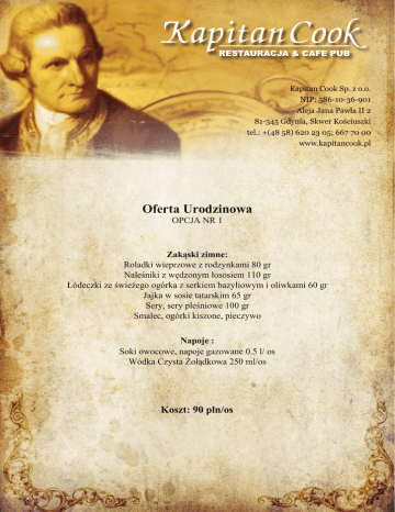 Kapitan Cook Sp. z o.o. NIP: 586-10-36-901 Aleja Jana Pawła II 2 81-345 Gdynia, Skwer Kościuszki tel.: +(48 58) 620 23 05; 667 70 00 www.kapitancook.pl Oferta Urodzinowa OPCJA NR 1 Zakąski zimne: Roladki wieprzowe z rodzynkami 80 gr Naleśniki z wędzonym łososiem 110 gr Łódeczki ze świeżego ogórka z serkiem bazyliowym i oliwkami 60 gr Jajka w sosie tatarskim 65 gr Sery, sery pleśniowe 100 gr Smalec, ogórki kiszone, pieczywo Napoje : Soki owocowe, napoje gazowane 0.5 l/ os Wódka Czysta Żołądkowa 250 ml/os Koszt: 90 pln/os Kapitan Cook Sp. z o.o. NIP: 586-10-36-901 Aleja Jana Pawła II 2 81-345 Gdynia, Skwer Kościuszki tel.: +(48 58) 620 23 05; 667 70 00 www.kapitancook.pl Oferta Urodzinowa OPCJA NR 2 Danie główne - do wyboru Karkówka w sosie borowikowym, Dorsz smażony z prażoną cebulką Ziemniaki zapiekane Bukiet surówek Zakąski zimne: Roladki wieprzowe z rodzynkami 80 gr Naleśniki z wędzonym łososiem 110 gr Łódeczki ze świeżego ogórka z serkiem bazyliowym i oliwkami 60 gr Jajka w sosie tatarskim 65 gr Sery, sery pleśniowe 100 gr Smalec, ogórki kiszone, pieczywo Napoje : Soki owocowe, napoje gazowane 0.5 l/ os Wódka Czysta Żołądkowa 250 ml/os Koszt: 110 pln/os Kapitan Cook Sp. z o.o. NIP: 586-10-36-901 Aleja Jana Pawła II 2 81-345 Gdynia, Skwer Kościuszki tel.: +(48 58) 620 23 05; 667 70 00 www.kapitancook.pl Oferta Urodzinowa OPCJA NR 3 Przystawka: Róża z łososia wędzonego na cytrynie z sosem pomarańczowym I Danie: Rosół królewski Danie główne - do wyboru Polędwiczki wieprzowe w sosie rokpolowym Dorsz smażony z prażoną cebulką Ziemniaki zapiekane Bukiet surówek Zakąski zimne: Roladki wieprzowe z rodzynkami 80 gr Naleśniki z wędzonym łososiem 110 gr Łódeczki ze świeżego ogórka z serkiem bazyliowym i oliwkami 60 gr Jajka w sosie tatarskim 65 gr Sery, sery pleśniowe 100 gr Smalec, ogórki kiszone, pieczywo Napoje: Soki owocowe, napoje gazowane 0.5 l/ os Wódka Czysta Żołądkowa 250 ml/os Koszt: 130 pln/os