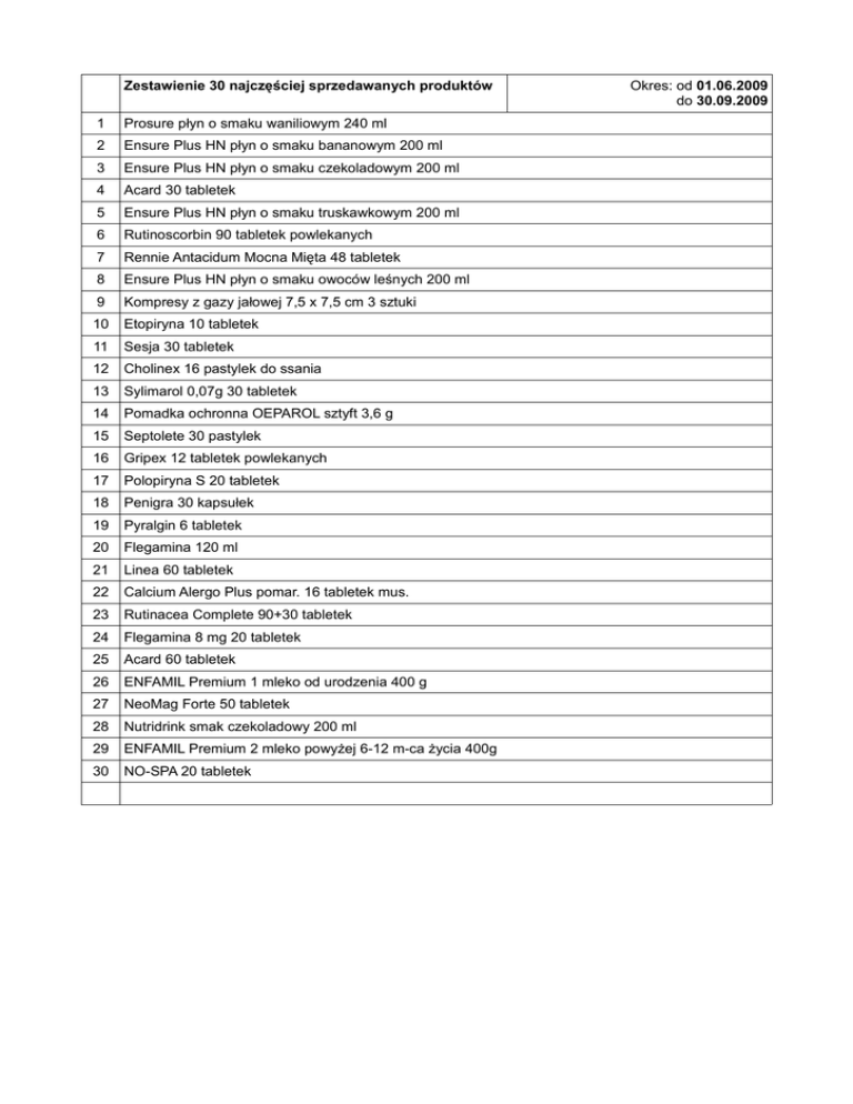 Zestawienie 30 najczęściej sprzedawanych produktów 1 Prosure płyn o smaku waniliowym 240 ml 2 Ensure Plus HN płyn o smaku bananowym 200 ml 3 Ensure Plus HN płyn o smaku czekoladowym 200 ml 4 Acard 30 tabletek 5 Ensure Plus HN płyn o smaku truskawkowym 200 ml 6 Rutinoscorbin 90 tabletek powlekanych 7 Rennie Antacidum Mocna Mięta 48 tabletek 8 Ensure Plus HN płyn o smaku owoców leśnych 200 ml 9 Kompresy z gazy jałowej 7,5 x 7,5 cm 3 sztuki 10 Etopiryna 10 tabletek 11 Sesja 30 tabletek 12 Cholinex 16 pastylek do ssania 13 Sylimarol 0,07g 30 tabletek 14 Pomadka ochronna OEPAROL sztyft 3,6 g 15 Septolete 30 pastylek 16 Gripex 12 tabletek powlekanych 17 Polopiryna S 20 tabletek 18 Penigra 30 kapsułek 19 Pyralgin 6 tabletek 20 Flegamina 120 ml 21 Linea 60 tabletek 22 Calcium Alergo Plus pomar. 16 tabletek mus. 23 Rutinacea Complete 90+30 tabletek 24 Flegamina 8 mg 20 tabletek 25 Acard 60 tabletek 26 ENFAMIL Premium 1 mleko od urodzenia 400 g 27 NeoMag Forte 50 tabletek 28 Nutridrink smak czekoladowy 200 ml 29 ENFAMIL Premium 2 mleko powyżej 6-12 m-ca życia 400g 30 NO-SPA 20 tabletek Okres: od 01.06.2009 do 30.09.2009