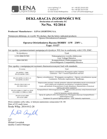 DEKLARACJA ZGODNOŚCI WE Declaration of conformity EC Nr/No. 92/2014 Producent/ Manufacturer : LENA LIGHTING S.A. Niniejszym deklaruje, że wyrób/ We declare, that the below indicated products: Oprawa Oświetleniowa/Luminarie Oprawa Oświetleniowa Ręczna HOBBY 11W 230V~, Typy: 11127 Jest zgodny z postanowieniami następujących dyrektyw WE/Are in conformity with LVD, EMC: Nr dyrektywy Tytuł LVD 2006/95/WE Niskonapięciowe wyroby elektryczne Low Voltage Directive Kompatybilność Elektromagnetyczna ElectroMagnetic Compatibility Directive 2004/108/WE Oraz zgodny z następującymi normami zharmonizowanymi/And with standards: Nr normy EN-60598-1: 2008 PN-EN 60598-1:2011 PN-EN 60598-2-8:2013-12 EN 60598-2-8:2013 PN-EN 55015:2013-10 EN 55015:2013 PN-EN 61000-3-2:2007/A1:2010 EN 61000-3-2:2006/A1:2009 PN-EN 61547:2009 EN 61547:2009 Tytuł Oprawy oświetleniowe Wymagania ogólne i badania Luminaries – Part 1: General requirements and tests Oprawy oświetleniowe - Wymagania szczegółowe - Oprawy oświetleniowe ręczne Luminaries. Particular requirements. Handlamps. Dopuszczalne poziomy i metody pomiarów zaburzeń radioelektrycznych wytwarzanych przez elektryczne urządzenia oświetleniowe i urządzenia podobne Limits and methods of measurement of radio disturbance characteristics of electrical lighting and similar equipment Kompatybilność elektromagnetyczna EMC. Dopuszczalne poziomy emisji harmonicznych prądu. Limit for harmonic currents emission. Sprzęt do ogólnych celów oświetleniowych. Wymagania dotyczące kompatybilności elektromagnetycznej. Equipment for general lighting purposes – EMC immunity requirements Dwie ostatnie cyfry roku, w którym naniesiono oznaczenie CE: 04 Date of CE mark issue: Środa Wlkp. 2014-012-28 Podpis Sign Michał Czwojdrak Quality Control Manager