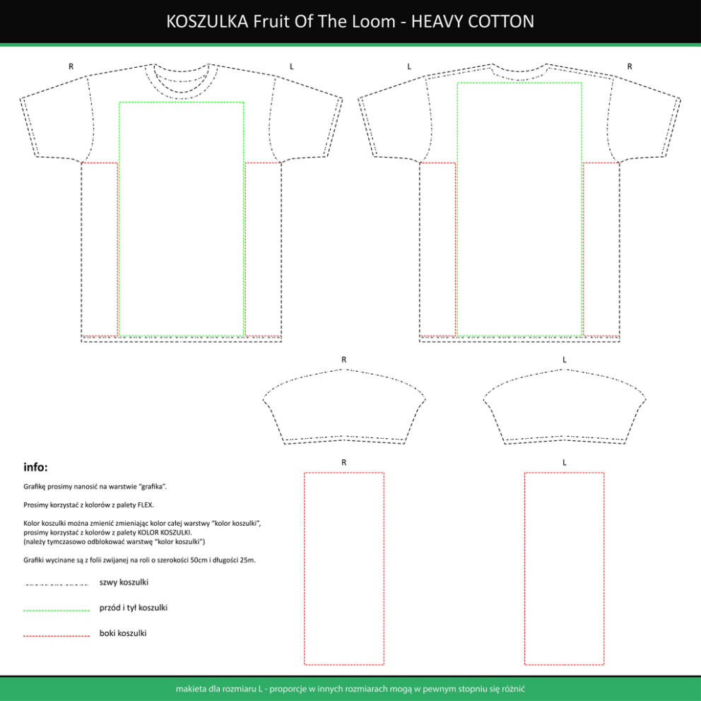 KOSZULKA Fruit Of The Loom - HEAVY COTTON R L info: L R R L R L Grafikę prosimy nanosić na warstwie “grafika”. Prosimy korzystać z kolorów z palety FLEX. Kolor koszulki można zmienić zmieniając kolor całej warstwy “kolor koszulki”, prosimy korzystać z kolorów z palety KOLOR KOSZULKI. (należy tymczasowo odblokować warstwę “kolor koszulki”) Grafiki wycinane są z folii zwijanej na roli o szerokości 50cm i długości 25m. szwy koszulki przód i tył koszulki boki koszulki makieta dla rozmiaru L - proporcje w innych rozmiarach mogą w pewnym stopniu się różnić