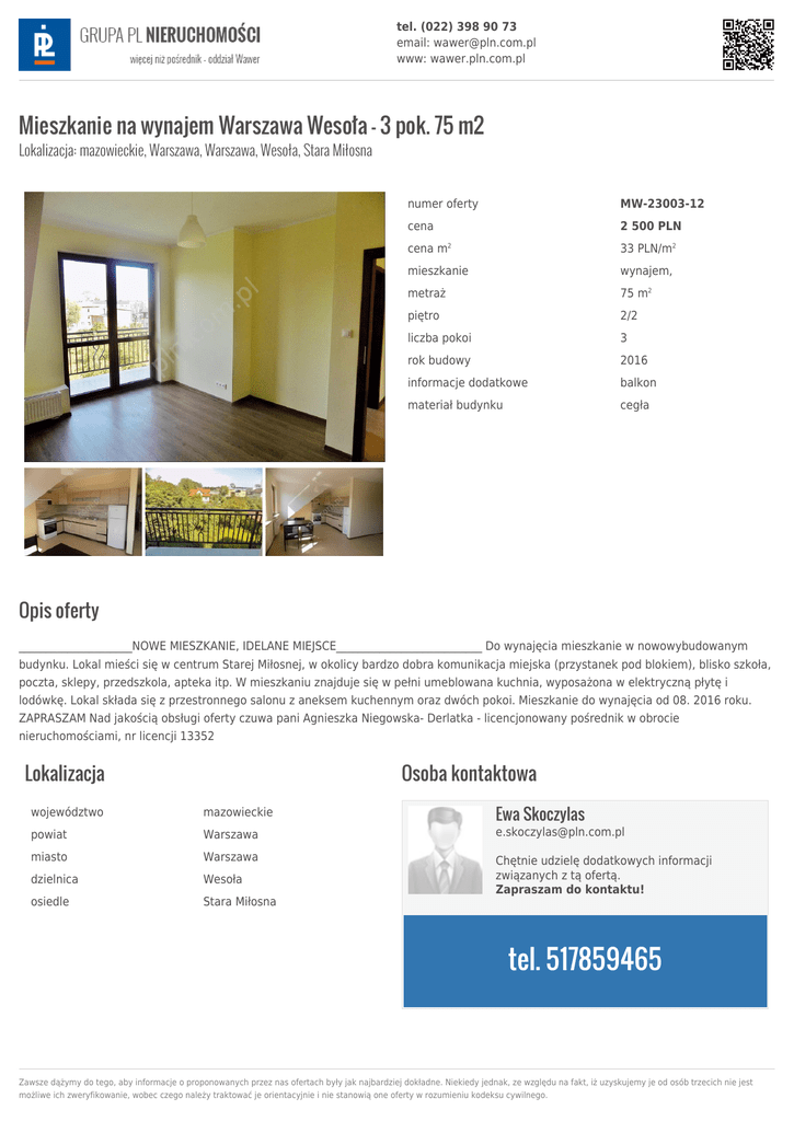 tel. (022) 398 90 73 email: [email protected] www: wawer.pln.com.pl Mieszkanie na wynajem Warszawa Wesoła - 3 pok. 75 m2 Lokalizacja: mazowieckie, Warszawa, Warszawa, Wesoła, Stara Miłosna numer oferty MW-23003-12 cena 2 500 PLN cena m 33 PLN/m2 mieszkanie wynajem, metraż 75 m2 piętro 2/2 liczba pokoi 3 rok budowy 2016 informacje dodatkowe balkon materiał budynku cegła 2 Opis oferty _____________________NOWE MIESZKANIE, IDELANE MIEJSCE___________________________ Do wynajęcia mieszkanie w nowowybudowanym budynku. Lokal mieści się w centrum Starej Miłosnej, w okolicy bardzo dobra komunikacja miejska (przystanek pod blokiem), blisko szkoła, poczta, sklepy, przedszkola, apteka itp. W mieszkaniu znajduje się w pełni umeblowana kuchnia, wyposażona w elektryczną płytę i lodówkę. Lokal składa się z przestronnego salonu z aneksem kuchennym oraz dwóch pokoi. Mieszkanie do wynajęcia od 08. 2016 roku. ZAPRASZAM Nad jakością obsługi oferty czuwa pani Agnieszka Niegowska- Derlatka - licencjonowany pośrednik w obrocie nieruchomościami, nr licencji 13352 Lokalizacja Osoba kontaktowa Ewa Skoczylas województwo mazowieckie powiat Warszawa [email protected] miasto Warszawa dzielnica Wesoła osiedle Stara Miłosna Chętnie udzielę dodatkowych informacji związanych z tą ofertą. Zapraszam do kontaktu! tel. 517859465 Zawsze dążymy do tego, aby informacje o proponowanych przez nas ofertach były jak najbardziej dokładne. Niekiedy jednak, ze względu na fakt, iż uzyskujemy je od osób trzecich nie jest możliwe ich zweryfikowanie, wobec czego należy traktować je orientacyjnie i nie stanowią one oferty w rozumieniu kodeksu cywilnego.