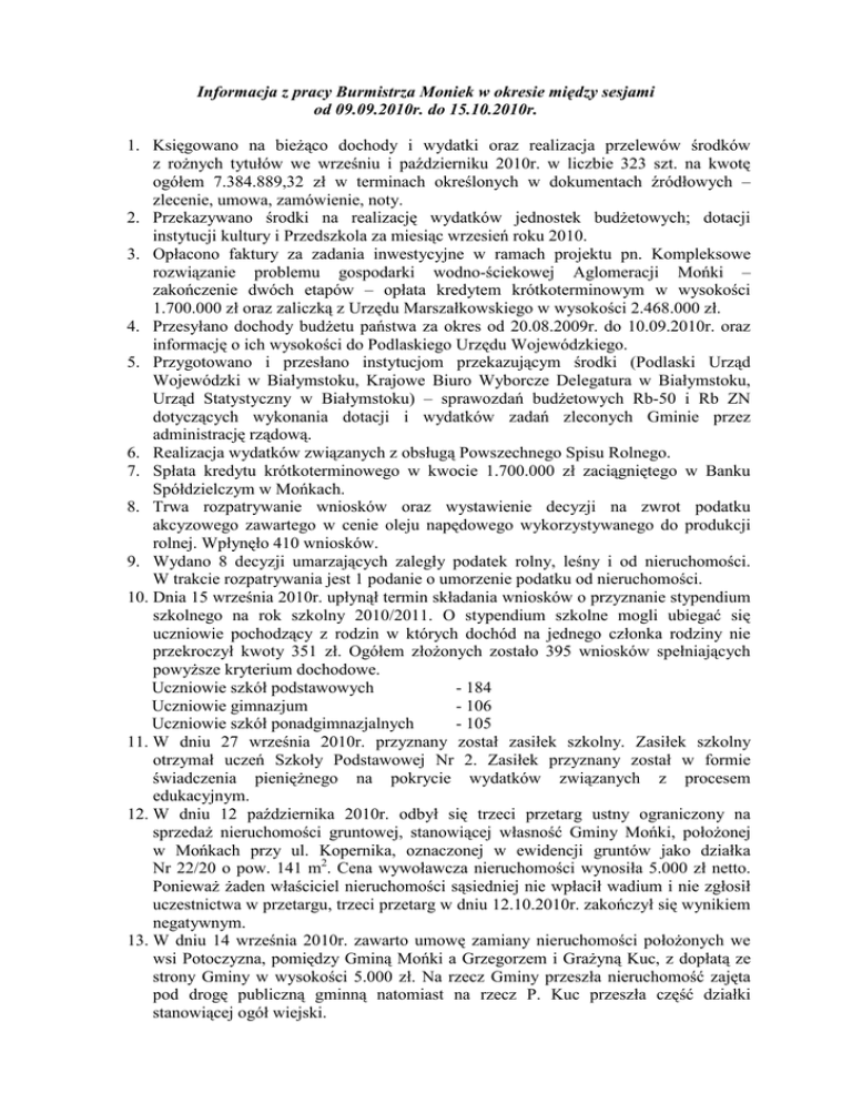 Informacja z pracy Burmistrza Moniek w okresie między sesjami od 09.09.2010r. do 15.10.2010r. 1. Księgowano na bieŜąco dochody i wydatki oraz realizacja przelewów środków z roŜnych tytułów we wrześniu i październiku 2010r. w liczbie 323 szt. na kwotę ogółem 7.384.889,32 zł w terminach określonych w dokumentach źródłowych – zlecenie, umowa, zamówienie, noty. 2. Przekazywano środki na realizację wydatków jednostek budŜetowych; dotacji instytucji kultury i Przedszkola za miesiąc wrzesień roku 2010. 3. Opłacono faktury za zadania inwestycyjne w ramach projektu pn. Kompleksowe rozwiązanie problemu gospodarki wodno-ściekowej Aglomeracji Mońki – zakończenie dwóch etapów – opłata kredytem krótkoterminowym w wysokości 1.700.000 zł oraz zaliczką z Urzędu Marszałkowskiego w wysokości 2.468.000 zł. 4. Przesyłano dochody budŜetu państwa za okres od 20.08.2009r. do 10.09.2010r. oraz informację o ich wysokości do Podlaskiego Urzędu Wojewódzkiego. 5. Przygotowano i przesłano instytucjom przekazującym środki (Podlaski Urząd Wojewódzki w Białymstoku, Krajowe Biuro Wyborcze Delegatura w Białymstoku, Urząd Statystyczny w Białymstoku) – sprawozdań budŜetowych Rb-50 i Rb ZN dotyczących wykonania dotacji i wydatków zadań zleconych Gminie przez administrację rządową. 6. Realizacja wydatków związanych z obsługą Powszechnego Spisu Rolnego. 7. Spłata kredytu krótkoterminowego w kwocie 1.700.000 zł zaciągniętego w Banku Spółdzielczym w Mońkach. 8. Trwa rozpatrywanie wniosków oraz wystawienie decyzji na zwrot podatku akcyzowego zawartego w cenie oleju napędowego wykorzystywanego do produkcji rolnej. Wpłynęło 410 wniosków. 9. Wydano 8 decyzji umarzających zaległy podatek rolny, leśny i od nieruchomości. W trakcie rozpatrywania jest 1 podanie o umorzenie podatku od nieruchomości. 10. Dnia 15 września 2010r. upłynął termin składania wniosków o przyznanie stypendium szkolnego na rok szkolny 2010/2011. O stypendium szkolne mogli ubiegać się uczniowie pochodzący z rodzin w których dochód na jednego członka rodziny nie przekroczył kwoty 351 zł. Ogółem złoŜonych zostało 395 wniosków spełniających powyŜsze kryterium dochodowe. Uczniowie szkół podstawowych - 184 Uczniowie gimnazjum - 106 Uczniowie szkół ponadgimnazjalnych - 105 11. W dniu 27 września 2010r. przyznany został zasiłek szkolny. Zasiłek szkolny otrzymał uczeń Szkoły Podstawowej Nr 2. Zasiłek przyznany został w formie świadczenia pienięŜnego na pokrycie wydatków związanych z procesem edukacyjnym. 12. W dniu 12 października 2010r. odbył się trzeci przetarg ustny ograniczony na sprzedaŜ nieruchomości gruntowej, stanowiącej własność Gminy Mońki, połoŜonej w Mońkach przy ul. Kopernika, oznaczonej w ewidencji gruntów jako działka Nr 22/20 o pow. 141 m2. Cena wywoławcza nieruchomości wynosiła 5.000 zł netto. PoniewaŜ Ŝaden właściciel nieruchomości sąsiedniej nie wpłacił wadium i nie zgłosił uczestnictwa w przetargu, trzeci przetarg w dniu 12.10.2010r. zakończył się wynikiem negatywnym. 13. W dniu 14 września 2010r. zawarto umowę zamiany nieruchomości połoŜonych we wsi Potoczyzna, pomiędzy Gminą Mońki a Grzegorzem i GraŜyną Kuc, z dopłatą ze strony Gminy w wysokości 5.000 zł. Na rzecz Gminy przeszła nieruchomość zajęta pod drogę publiczną gminną natomiast na rzecz P. Kuc przeszła część działki stanowiącej ogół wiejski. 14. W dniu 22 września 2010r. oddano w uŜyczenie na okres 3 lat Monieckiemu Ośrodkowi Kultury nieruchomość oznaczoną w ewidencji gruntów jako działka Nr 93/1 o pow. 0,85 ha, zabudowaną budynkiem świetlicy wiejskiej we wsi Kropiwnica wraz z boiskiem wiejskim. 15. W dniu 8 października 2010r. zawarto akt notarialny w sprawie nabycia w drodze darowizny od Parafii Rzymskokatolickiej w Kuleszach na rzecz Gminy Mońki nieruchomości o pow. 260 m2 połoŜonej we wsi Kulesze pod budowę parkingu. 16. Przeprowadzono negocjację z P. Lechem Grądzkim w sprawie nabycia gruntów zajętych na cele publiczne – odprowadzanie oczyszczonych ścieków oraz na potrzeby eksploatacji separatora. P. Grądzki wyraził zgodę na sprzedaŜ gruntów po 1 zł/1m2 zajętych na cele związane odprowadzanie ścieków z oczyszczalni oraz po 12 zł/1m2 za grunty pod separator. 17. W dniu 15 września 2010r. odbyło się posiedzenie Społecznej Komisji Mieszkaniowej, na którym Komisja zaopiniowała pozytywnie przydział lokalu socjalnego nr 7 w Hornostajach 20. Burmistrz wydał skierowanie na zawarcie umowy najmu tego lokalu. 18. W związku z wyrokiem sądu orzekającym eksmisję oraz przyznającym prawo do lokalu socjalnego Kancelaria Radców Prawnych w Białymstoku działająca w imieniu właściciela lokalu wystąpiła do Gminy Mońki o przedstawienie osobie eksmitowanej oferty najmu lokalu socjalnego. W przypadkach orzeczenia przez sąd o uprawnieniach do lokalu socjalnego umowę na lokal socjalny zawiera się w pierwszej kolejności. Dlatego do osoby eksmitowanej skierowano ofertę najmu na lokal socjalny nr 5 w Dziękoniach 28. 19. W dniu 22 września 2010r. odbył się przetarg ustny ograniczony do mieszkańców wsi Mejły, na oddanie w dzierŜawę na okres 3 lat nieruchomości gruntowej, połoŜonej we wsi Mejły, stanowiącej mienie gminne – ogół wiejski, oznaczonej w ewidencji gruntów jako działka Nr 109/2 o pow. 0,3300 ha. Do przetargu zgłosił się i został dopuszczony 1 mieszkaniec wsi Mejły. W wyniku przetargu uzyskano cenę 3,72 zł za 100 m2 powierzchni. W dniu 8 października 2010r. zawarto na okres 3 lat umowę dzierŜawy z osobą, która wygrała przetarg. 20. W dniu 28 września 2010r. podpisano protokół rokowań na sprzedaŜ lokalu mieszkalnego nr 22 przy ul. Tysiąclecia 12a. Ponadto przygotowano protokoły rokowań na sprzedaŜ następujących lokali mieszkalnych: nr 17 przy ul. Tysiąclecia 12a, nr 16 przy Al. Niepodległości 8 oraz nr 9 przy u