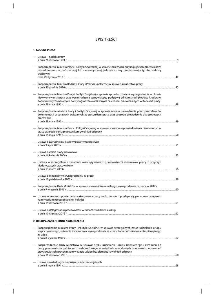 SPIS TREŚCI 1. KODEKS PRACY — Ustawa – Kodeks pracy z dnia 26 czerwca 1974 r. ........................................................................................................................................................................................ 9 — Rozporządzenie Ministra Pracy i Polityki Społecznej w sprawie należności przysługujących pracownikowi zatrudnionemu w państwowej lub samorządowej jednostce sfery budżetowej z tytułu podróży służbowej dnia 29 stycznia 2013 r ............................................................................................................................................................................................42 — Rozporządzenie Ministra Rodziny, Pracy i Polityki Społecznej w sprawie świadectwa pracy z dnia 30 grudnia 2016 r. ...................................................................................................................................................................................... 45 — Rozporządzenie Ministra Pracy i Polityki Socjalnej w sprawie sposobu ustalania wynagrodzenia w okresie niewykonywania pracy oraz wynagrodzenia stanowiącego podstawę odliczania odszkodowań, odpraw, dodatków wyrównawczych do wynagrodzenia oraz innych należności przewidzianych w Kodeksie pracy z dnia 29 maja 1996 r ...............................................................................................................................................................................................48 — Rozporządzenie Ministra Pracy i Polityki Socjalnej w sprawie zakresu prowadzenia przez pracodawców dokumentacji w sprawach związanych ze stosunkiem pracy oraz sposobu prowadzenia akt osobowych pracownika z dnia 28 maja 1996 r ...............................................................................................................................................................................................49 — Rozporządzenie Ministra Pracy i Polityki Socjalnej w sprawie sposobu usprawiedliwiania nieobecności w pracy oraz udzielania pracownikom zwolnień od pracy z dnia 15 maja 1996 r ...............................................................................................................................................................................................50 — Ustawa o zatrudnianiu pracowników tymczasowych z dnia 9 lipca 2003 r ..................................................................................................................................................................................................51 — Ustawa o czasie pracy kierowców z dnia 16 kwietnia 2004 r ........................................................................................................................................................................................53 — Ustawa o szczególnych zasadach rozwiązywania z pracownikami stosunków pracy z przyczyn niedotyczących pracowników z dnia 13 marca 2003 r.............................................................................................................................................................................................56 — Ustawa o minimalnym wynagrodzeniu za pracę z dnia 10 października 2002 r ...............................................................................................................................................................................58 — Rozporządzenie Rady Ministrów w sprawie wysokości minimalnego wynagrodzenia za pracę w 2017 r z dnia 9 września 2016 r .........................................................................................................................................................................................60 — Ustawa o skutkach powierzania wykonywania pracy cudzoziemcom przebywającym wbrew przepisom na terytorium Rzeczypospolitej Polskiej z dnia 15 czerwca 2012 r.........................................................................................................................................................................................61 — Ustawa o delegowaniu pracowników w ramach świadczenia usług z dnia 10 czerwca 2016 r. .......................................................................................................................................................................................62 2. URLOPY, ZASIŁKI I INNE ŚWIADCZENIA — Rozporządzenie Ministra Pracy i Polityki Socjalnej w sprawie szczególnych zasad udzielania urlopu wypoczynkowego, ustalania i wypłacania wynagrodzenia za czas urlopu oraz ekwiwalentu pieniężnego za urlop z dnia 8 stycznia 1997 r ...........................................................................................................................................................................................67 — Rozporządzenie Rady Ministrów w sprawie trybu udzielania urlopu bezpłatnego i zwolnień od pracy pracownikom pełniącym z wyboru funkcje w związkach zawodowych oraz zakresu uprawnień przysługujących pracownikom w czasie urlopu bezpłatnego i zwolnień od pracy z dnia 11 czerwca 1996 r.........................................................................................................................................................................................68 — Ustawa o zakładowym funduszu świadczeń socjalnych z dnia 4 marca 1994 r ...............................................................................................................................................................................................68 — Rozporządzenie Ministra Pracy i Polityki Społecznej w sprawie sposobu ustalania przeciętnej liczby zatrudnionych w celu naliczania odpisu na zakładowy fundusz świadczeń socjalnych z dnia 9 marca 2009 r ..........................................................................................................................................................................