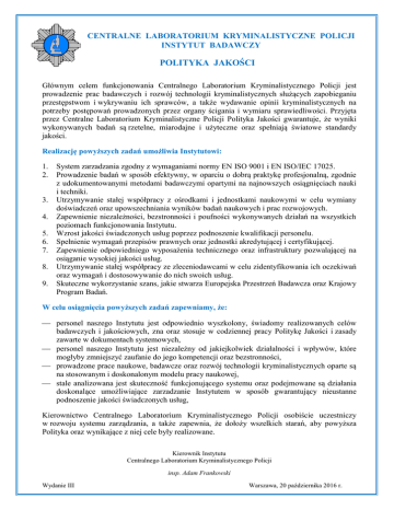CENTRALNE LABORATORIUM KRYMINALISTYCZNE POLICJI INSTYTUT BADAWCZY POLITYKA JAKOŚCI Głównym celem funkcjonowania Centralnego Laboratorium Kryminalistycznego Policji jest prowadzenie prac badawczych i rozwój technologii kryminalistycznych służących zapobieganiu przestępstwom i wykrywaniu ich sprawców, a także wydawanie opinii kryminalistycznych na potrzeby postępowań prowadzonych przez organy ścigania i wymiaru sprawiedliwości. Przyjęta przez Centralne Laboratorium Kryminalistyczne Policji Polityka Jakości gwarantuje, że wyniki wykonywanych badań są rzetelne, miarodajne i użyteczne oraz spełniają światowe standardy jakości. Realizację powyższych zadań umożliwia Instytutowi: 1. 2. 3. 4. 5. 6. 7. 8. 9. System zarzadzania zgodny z wymaganiami normy EN ISO 9001 i EN ISO/IEC 17025. Prowadzenie badań w sposób efektywny, w oparciu o dobrą praktykę profesjonalną, zgodnie z udokumentowanymi metodami badawczymi opartymi na najnowszych osiągnięciach nauki i techniki. Utrzymywanie stałej współpracy z ośrodkami i jednostkami naukowymi w celu wymiany doświadczeń oraz upowszechniania wyników badań naukowych i prac rozwojowych. Zapewnienie niezależności, bezstronności i poufności wykonywanych działań na wszystkich poziomach funkcjonowania Instytutu. Wzrost jakości świadczonych usług poprzez podnoszenie kwalifikacji personelu. Spełnienie wymagań przepisów prawnych oraz jednostki akredytującej i certyfikującej. Zapewnienie odpowiedniego wyposażenia technicznego oraz infrastruktury pozwalającej na osiąganie wysokiej jakości usług. Utrzymywanie stałej współpracy ze zleceniodawcami w celu zidentyfikowania ich oczekiwań oraz wymagań i dostosowywanie do nich swoich usług. Skuteczne wykorzystanie szans, jakie stwarza Europejska Przestrzeń Badawcza oraz Krajowy Program Badań. W celu osiągnięcia powyższych zadań zapewniamy, że: personel naszego Instytutu jest odpowiednio wyszkolony, świadomy realizowanych celów badawczych i jakościowych, zna oraz stosuje w codziennej pracy Politykę Jakości i zasady zawarte w dokumentach systemowych, personel naszego Instytutu jest niezależny od jakiejkolwiek działalności i wpływów, które mogłyby zmniejszyć zaufanie do jego kompetencji oraz bezstronności, prowadzone prace naukowe, badawcze oraz rozwój technologii kryminalistycznych oparte są na stosowanym i doskonalonym modelu pracy naukowej, stale analizowana jest skuteczność funkcjonującego systemu oraz podejmowane są działania doskonalące umożliwiające zarzadzanie Instytutem w sposób gwarantujący nieustanne podnoszenie jakości świadczonych usług, Kierownictwo Centralnego Laboratorium Kryminalistycznego Policji osobiście uczestniczy w rozwoju systemu zarządzania, a także zapewnia, że dołoży wszelkich starań, aby powyższa Polityka oraz wynikające z niej cele były realizowane. Kierownik Instytutu Centralnego Laboratorium Kryminalistycznego Policji insp. Adam Frankowski Wydanie III Warszawa, 20 października 2016 r.
