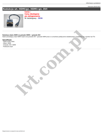 Informacje o produkcie Utworzono 08-03-2017 Redukcja wt. HDMI/gn. HDMI+gn. DVI Cena : Ceny dostępne po zalogowaniu Nr katalogowy : 3036 m .p lv t. co Specyfikacja: - Kabel audio-video - Wtyki: HDMI - Gniazda: DVI i HDMI - Pozłacane styki l Redukcja wtyku HDMI na gniazdo HDMI + gniazdo DVI Kabel posiadający wtyk HDMI męski oraz gniazdo DVI i gniazdo HDMI przez co umożliwia podłączenie dodatkowego urządzenia (np. monitor lub TV) Wygenerowano w programie www.oscGold.com