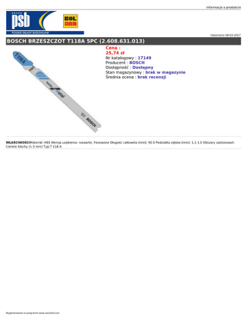 Informacje o produkcie Utworzono 08-03-2017 BOSCH BRZESZCZOT T118A 5PC (2.608.631.013) Cena : 25,74 zł Nr katalogowy : 17149 Producent : BOSCH Dostępność : Dostępny Stan magazynowy : brak w magazynie Średnia ocena : brak recenzji WŁAŚCIWOŚCIMateriał: HSS Wersja uzębienia: rozwarte, frezowane Długość całkowita [mm]: 92.0 Podziałka zębów [mm]: 1,1-1,5 Obszary zastosowań: Cienkie blachy (1-3 mm) Typ:T 118 A Wygenerowano w programie www.oscGold.com