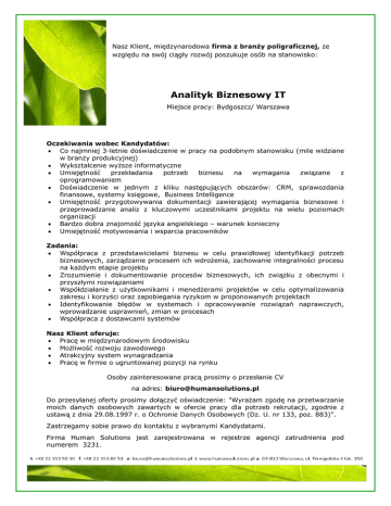 Nasz Klient, międzynarodowa firma z branży poligraficznej, ze względu na swój ciągły rozwój poszukuje osób na stanowisko: Analityk Biznesowy IT Miejsce pracy: Bydgoszcz/ Warszawa Oczekiwania wobec Kandydatów: Co najmniej 3-letnie doświadczenie w pracy na podobnym stanowisku (mile widziane w branży produkcyjnej) Wykształcenie wyższe informatyczne Umiejętność przekładania potrzeb biznesu na wymagania związane z oprogramowaniem Doświadczenie w jednym z kliku następujących obszarów: CRM, sprawozdania finansowe, systemy księgowe, Business Intelligence Umiejętność przygotowywania dokumentacji zawierającej wymagania biznesowe i przeprowadzanie analiz z kluczowymi uczestnikami projektu na wielu poziomach organizacji Bardzo dobra znajomość języka angielskiego – warunek konieczny Umiejętność motywowania i wsparcia pracowników Zadania: Współpraca z przedstawicielami biznesu w celu prawidłowej identyfikacji potrzeb biznesowych, zarządzanie procesem ich wdrożenia, zachowanie integralności procesu na każdym etapie projektu Zrozumienie i dokumentowanie procesów biznesowych, ich związku z obecnymi i przyszłymi rozwiązaniami Współdziałanie z użytkownikami i menedżerami projektów w celu optymalizowania zakresu i korzyści oraz zapobiegania ryzykom w proponowanych projektach Identyfikowanie błędów w systemach i opracowywanie rozwiązań naprawczych, wprowadzanie usprawnień, zmian w procesach Współpraca z dostawcami systemów Nasz Klient oferuje: Pracę w międzynarodowym środowisku Możliwość rozwoju zawodowego Atrakcyjny system wynagradzania Pracę w firmie o ugruntowanej pozycji na rynku Osoby zainteresowane pracą prosimy o przesłanie CV na adres: [email protected] Do przesyłanej oferty prosimy dołączyć oświadczenie: "Wyrażam zgodę na przetwarzanie moich danych osobowych zawartych w ofercie pracy dla potrzeb rekrutacji, zgodnie z ustawą z dnia 29.08.1997 r. o Ochronie Danych Osobowych (Dz. U. nr 133, poz. 883)". Zastrzegamy sobie prawo do kontaktu z wybranymi Kandydatami. Firma Human Solutions jest zarejestrowana w rejestrze agencji zatrudnienia pod numerem 3231.