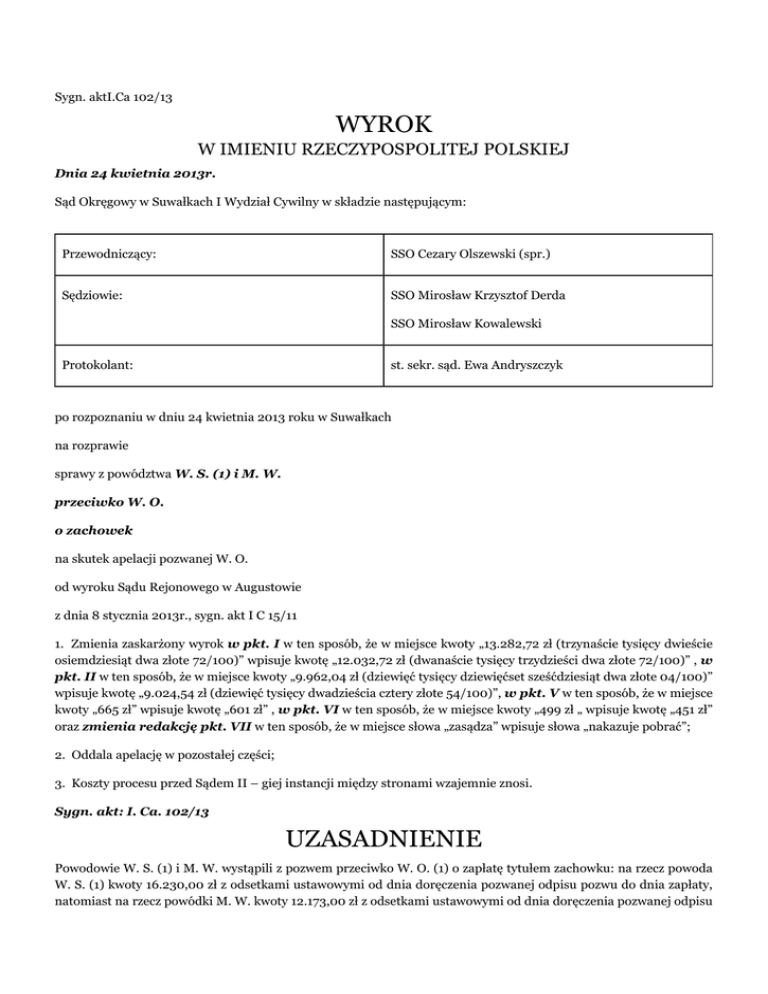 Sygn. aktI.Ca 102/13 WYROK W IMIENIU RZECZYPOSPOLITEJ POLSKIEJ Dnia 24 kwietnia 2013r. Sąd Okręgowy w Suwałkach I Wydział Cywilny w składzie następującym: Przewodniczący: SSO Cezary Olszewski (spr.) Sędziowie: SSO Mirosław Krzysztof Derda SSO Mirosław Kowalewski Protokolant: st. sekr. sąd. Ewa Andryszczyk po rozpoznaniu w dniu 24 kwietnia 2013 roku w Suwałkach na rozprawie sprawy z powództwa W. S. (1) i M. W. przeciwko W. O. o zachowek na skutek apelacji pozwanej W. O. od wyroku Sądu Rejonowego w Augustowie z dnia 8 stycznia 2013r., sygn. akt I C 15/11 1. Zmienia zaskarżony wyrok w pkt. I w ten sposób, że w miejsce kwoty „13.282,72 zł (trzynaście tysięcy dwieście osiemdziesiąt dwa złote 72/100)” wpisuje kwotę „12.032,72 zł (dwanaście tysięcy trzydzieści dwa złote 72/100)” , w pkt. II w ten sposób, że w miejsce kwoty „9.962,04 zł (dziewięć tysięcy dziewięćset sześćdziesiąt dwa złote 04/100)” wpisuje kwotę „9.024,54 zł (dziewięć tysięcy dwadzieścia cztery złote 54/100)”, w pkt. V w ten sposób, że w miejsce kwoty „665 zł” wpisuje kwotę „601 zł” , w pkt. VI w ten sposób, że w miejsce kwoty „499 zł „ wpisuje kwotę „451 zł” oraz zmienia redakcję pkt. VII w ten sposób, że w miejsce słowa „zasądza” wpisuje słowa „nakazuje pobrać”; 2. Oddala apelację w pozostałej części; 3. Koszty procesu przed Sądem II – giej instancji między stronami wzajemnie znosi. Sygn. akt: I. Ca. 102/13 UZASADNIENIE Powodowie W. S. (1) i M. W. wystąpili z pozwem przeciwko W. O. (1) o zapłatę tytułem zachowku: na rzecz powoda W. S. (1) kwoty 16.230,00 zł z odsetkami ustawowymi od dnia doręczenia pozwanej odpisu pozwu do dnia zapłaty, natomiast na rzecz powódki M. W. kwoty 12.173,00 zł z odsetkami ustawowymi od dnia doręczenia pozwanej odpisu pozwu do dnia zapłaty. Jednocześnie domagali się zasądzenia od pozwanej na swoją rzecz kosztów postępowania, w tym kosztów zastępstwa procesowego według norm przepisanych. W uzasadnieniu wskazali, iż postanowieniem z dnia 22 lutego 2008 r. w sprawie o sygn. akt: I Ns 44/08 Sąd Rejonowy w Augustowie stwierdził nabycie spadku po zmarłej dnia 24 stycznia 2008 r. D. M. S., na podstawie testamentu na rzecz pozwanej W. O.. Z ustawowych spadkobierców zmarła pozostawiła męża W. S. (1) oraz córki M. W., U. P. i M. O.. Podnieśli, iż gdyby doszło do dziedziczenia ustawowego, każdy ze spadkobierców otrzymałby po ¼ części spadku. Wywiedli, iż powód W. S. (1) od 1996 r. jest inwalidą. Inwalidztwo zostało ustalone orzeczeniem Sądu Okręgowego w Białymstoku w sprawie VI 3293/96, określone jako III grupa inwalidzka, z uwagi na wadę wzroku. Wskazali, iż udział spadkowy powoda W. S. (1) wynosi 8/48 masy spadkowej, natomiast powódki M. W. wynosi 6/48. W skład masy spadkowej wchodzi nieruchomość rolna oznaczona numerem geodezyjnym (...), położona w miejscowości S. gmina S., o łącznej powierzchni 5,2300 ha o wartości 97.379,00 zł. Pozwana W. O. (2) uznała powództwo do kwoty 8.333,00 zł na rzecz powoda W. S. (2), natomiast na rzecz powódki M. W. uznała powództwo do kwoty 6.250,00 zł. W pozostałej części domagała się oddalenia powództwa. Jednocześnie domagała się obciążenia strony powodowej kosztami procesu. Wyrokiem z dnia 8 stycznia 2013 r. w sprawie o sygn. akt: I. C. 15/11 Sąd Rejonowy w Augustowie zasądził od pozwanej W. O. na rzecz powoda W. S. (1) kwotę 13.282,72 zł wraz z ustawowymi odsetkami od dnia 22 lutego 2011 r. i zasądził od pozwanej na rzecz powódki M. W. kwotę 9.962,04 zł wraz z ustawowymi odsetkami od dnia 22 lutego 2011 r., a w pozostałym zakresie oddalił powództwo. Ponadto zniósł wzajemnie koszty zastępstwa procesowego pomiędzy stronami, zasądził od pozwanej na rzecz powoda W. S. (1) kwotę 665,00 zł tytułem zwrotu kosztów procesu, zasądził od pozwanej na rzecz powódki M. W. kwotę 499,00 zł tytułem zwrotu kosztów procesu oraz zasądził od pozwanej na rzecz Skarbu Państwa (kasy Sądu Rejonowego w Augustowie) kwotę 98,80 zł tytułem brakującej zaliczki na opinię biegłego. Wydanie wyroku poprzedziły następujące ustalenia faktyczne oraz prawne: Postanowieniem z dnia 22 lutego 2008 r. w sprawie o sygn. akt: I Ns 44/08 Sąd Rejonowy w Augustowie stwierdził, że spadek po D. S. na podstawie testamentu notarialnego z dnia 26 kwietnia 2005 r. nabyła w całości wnuczka W. O. (2). Do kręgu spadkobierców ustawowych po D. S. należą jej mąż W. S. (2) oraz dzieci: M. O., M. W. i U. P.. W skład spadku po D. S. wchodzi nieruchomość rolna zalesiona oznaczona numerem geodezyjnym (...), położona w miejscowości S. gmina S., o łącznej powierzchni 5,2300 ha. Z pisemnej opinii T. T. biegłej z zakresu wyceny nieruchomości wynika, iż wartość rynkowa w/w nieruchomości z uwzględnieniem gruntu oraz drzewostanu stanowi kwotę 112.768,00 zł. W latach 2002-2008 dokonano zrywki drewna na kwotę 39.359,00 zł oraz pozyskano czyszczenie odsłaniające, z którego pozyskano drewno opałowe. Wartość nieruchomości leśnej według stanu na dzień oględzin i cen na dzień wyceny stanowi kwotę 72.946,00 zł. Sąd ocenił, iż powyższą opinię biegłej T. T. jako niekompletną, albowiem dokonywała ona ustaleń w zakresie wartości drzewostanu, nie posiadając w przedmiotowej materii specjalistycznej wiedzy. W kolejnej opinii uzupełniającej biegła T. T. wskazała, iż do szczegółowej wyceny drzewostanu na pniu celowym uzasadnionym jest powołanie biegłego z zakresu leśnictwa. W związku z tym Sąd uznał za celowe dopuszczenie dowodu z opinii kolejnych biegłych, a mianowicie biegłej z zakresu szacowania nieruchomości K. T. na okoliczność wartości działki gruntu oraz biegłego z zakresu leśnictwa J. F. na okoliczność wartości drzewostanu na przedmiotowej działce. Z pisemnej opinii K. T. wynika, iż wartość działki gruntu wynosi kwotę 37.000,00 zł, bez
