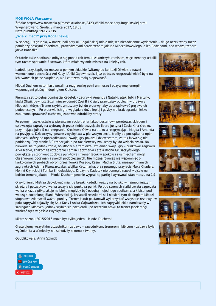 MOS WOLA Warszawa Źródło: http://www.moswola.pl/mos/aktualnosci/8423,Wielki-mecz-przy-Rogalinskiej.html Wygenerowano: Środa, 8 marca 2017, 18:53 Data publikacji 19.12.2015 „Wielki mecz” przy Rogalińskiej W sobotę, 19 grudnia, w naszej hali przy ul. Rogalińskiej miało miejsce niecodzienne wydarzenie – długo oczekiwany mecz pomiędzy naszymi Kadetkami, prowadzonymi przez trenera Jakuba Miecznikowskiego, a ich Rodzinami, pod wodzą trenera Jacka Banasika. Ostatnie takie spotkanie odbyło się ponad rok temu i zakończyło remisem, więc trenerzy ustalili tym razem spotkanie 3-setowe, które miało wyłonić mistrza na kolejny rok. Kadetki przystąpiły do meczu w pełnym składzie (witamy po kontuzji Oliwię), a nawet wzmocnione obecnością Ani Kusy i Aniki Gajowniczek, i już podczas rozgrzewki widać było na ich twarzach pełne skupienie, ale i zarazem małą niepewność. Młodzi Duchem natomiast weszli na rozgrzewkę pełni animuszu i pozytywnej energii, wspomagani głośnym dopingiem Kibiców. Pierwszy set to pełna dominacja Kadetek – zagrywki Amandy i Natalki, ataki Julki i Martyny, kiwki Oliwii, pewność Zuzi i niezawodność Zosi B i K siały prawdziwy poploch w drużynie Młodych, których Trener szybko zmuszony był do przerwy, aby uporządkować grę swoich podopiecznych. Po przerwie ich gra wyglądała dużo lepiej i gdyby nie brak zgrania i lekko zaburzona sprawność ruchowa J zapewne odrobiliby straty. Po pewnym zwycięstwie w pierwszym secie trener Jakub postanowił porotować składem i dziewczęta zagrały na wybranych przez siebie pozycjach: libero Justyna i Zosia K na środku, przyjmująca Julka S na rozegraniu, środkowa Oliwia na ataku a rozgrywające Magda i Amanda na przyjęciu. Dziewczyny, pewne zwycięstwa w pierwszym secie, trafiły od początku na opór Młodych, którzy po uporządkowaniu swojej gry pokazali dziewczętom, że tak łatwo się nie poddadzą. Przy stanie 8:0 trener Jakub po raz pierwszy zmuszony był do wzięcia czasu. Na niewiele się to jednak zdało, bo Młodzi nie zamierzali zmieniać swojej gry – punktowe zagrywki Arka Marka, znakomite rozegranie Kamila Kaczmarka i ataki Rocha Gruszczyńskiego powiększały stopniowo zdobycz punktową i Trener Jacek w spokoju i z uśmiechem mógł obserwować poczynania swoich podopiecznych. Nie można również nie wspomnieć o karkołomnych próbach obron przez Tomka Kusego, Kasię i Maćka Siuta, niezapomnianych zagrywkach Adama Piwowarczyka, Wojtka Kaczmarka, oraz pewnego przyjęcia Maxa Chadały, Moniki Krynickiej i Tomka Bindulaskiego. Drużynie Kadetek nie pomogło nawet wejście na boisko trenera Jakuba – Młodzi Duchem pewnie wygrali tę partię i wyrównali stan meczu na 1:1. O wyłonieniu Mistrza decydować miał tie break. Kadetki weszły na boisko w najmocniejszym składzie i początkowo walka toczyła się punkt za punkt. Po obu stronach siatki trwała zagorzała walka o każdą piłkę, akcje na bloku mogłyby być ozdobą niejednego spotkania, a kibice, pod wodzą nieocenionej Blanki Wierzbickej, krzyczeli resztkami sił i niesieni tym dopingiem Młodzi stopniowo zdobywali ważne punkty. Trener Jakub postanowił wykorzystać wszystkie rezerwy i w polu zagrywki pojawiły się Ania Kusy i Anika Gajowniczek. Ich zagrywki lekko namieszały w szeregach Młodych, jednak szybko się pozbierali i po ostatnim ataku to trener Jacek mógł wznieść ręce w geście zwycięstwa. Mistrz sezonu 2015/2016 moze być tylko jeden – Młodzi Duchem! Gratulujemy wszystkim uczestnikom zabawy – zawodnikom, trenerom i kibicom – zabawa była wyśmienita a uśmiechy nie schodziły nikomu z twarzy. Opublikowała: Anna Szmidt Komentarz (0) dodaj komentarz Brak komentarzy dodaj komentarz