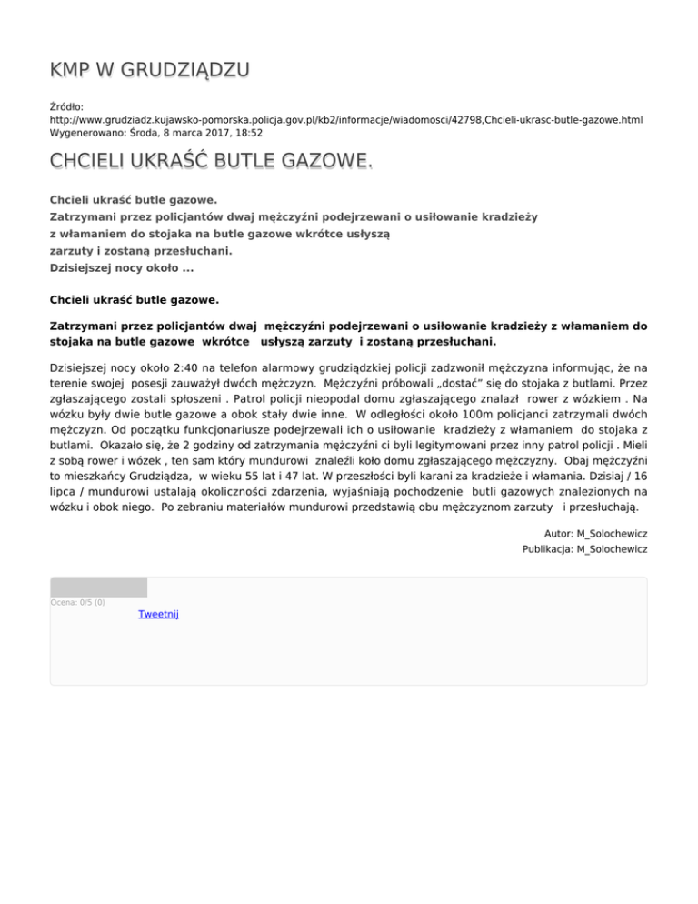 KMP W GRUDZIĄDZU Źródło: http://www.grudziadz.kujawsko-pomorska.policja.gov.pl/kb2/informacje/wiadomosci/42798,Chcieli-ukrasc-butle-gazowe.html Wygenerowano: Środa, 8 marca 2017, 18:52 CHCIELI UKRAŚĆ BUTLE GAZOWE. Chcieli ukraść butle gazowe. Zatrzymani przez policjantów dwaj mężczyźni podejrzewani o usiłowanie kradzieży z włamaniem do stojaka na butle gazowe wkrótce usłyszą zarzuty i zostaną przesłuchani. Dzisiejszej nocy około ... Chcieli ukraść butle gazowe. Zatrzymani przez policjantów dwaj mężczyźni podejrzewani o usiłowanie kradzieży z włamaniem do stojaka na butle gazowe wkrótce usłyszą zarzuty i zostaną przesłuchani. Dzisiejszej nocy około 2:40 na telefon alarmowy grudziądzkiej policji zadzwonił mężczyzna informując, że na terenie swojej posesji zauważył dwóch mężczyzn. Mężczyźni próbowali „dostać” się do stojaka z butlami. Przez zgłaszającego zostali spłoszeni . Patrol policji nieopodal domu zgłaszającego znalazł rower z wózkiem . Na wózku były dwie butle gazowe a obok stały dwie inne. W odległości około 100m policjanci zatrzymali dwóch mężczyzn. Od początku funkcjonariusze podejrzewali ich o usiłowanie kradzieży z włamaniem do stojaka z butlami. Okazało się, że 2 godziny od zatrzymania mężczyźni ci byli legitymowani przez inny patrol policji . Mieli z sobą rower i wózek , ten sam który mundurowi znaleźli koło domu zgłaszającego mężczyzny. Obaj mężczyźni to mieszkańcy Grudziądza, w wieku 55 lat i 47 lat. W przeszłości byli karani za kradzieże i włamania. Dzisiaj / 16 lipca / mundurowi ustalają okoliczności zdarzenia, wyjaśniają pochodzenie butli gazowych znalezionych na wózku i obok niego. Po zebraniu materiałów mundurowi przedstawią obu mężczyznom zarzuty i przesłuchają. Autor: M_Solochewicz Publikacja: M_Solochewicz Ocena: 0/5 (0) Tweetnij