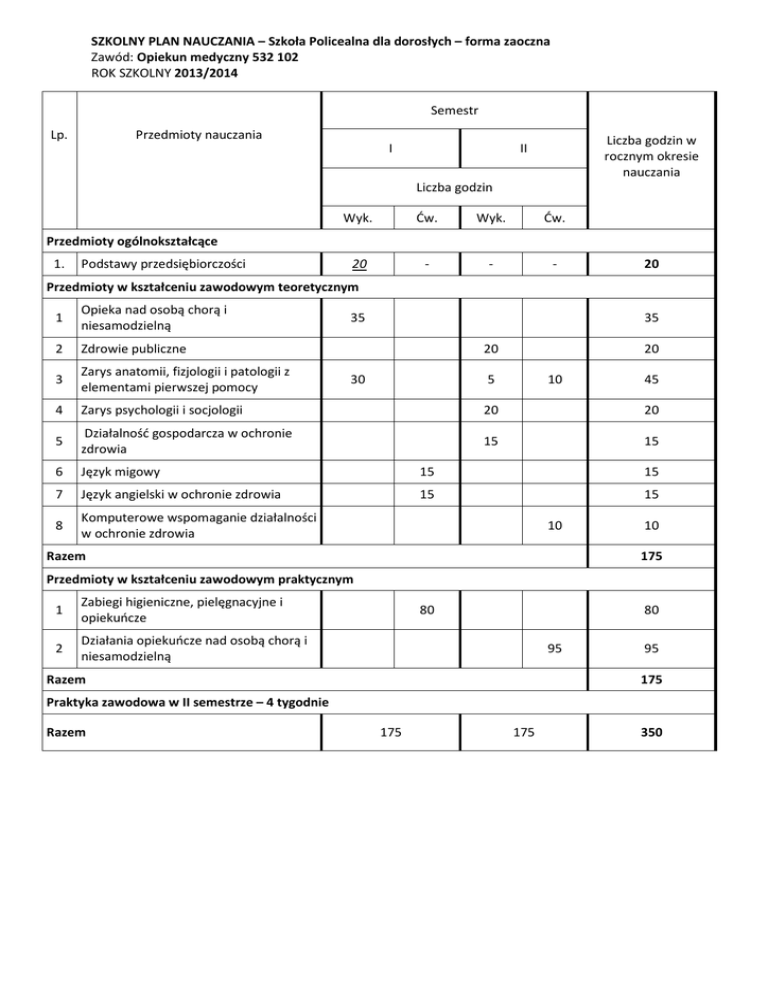 SZKOLNY PLAN NAUCZANIA – Szkoła Policealna dla dorosłych – forma zaoczna Zawód: Opiekun medyczny 532 102 ROK SZKOLNY 2013/2014 Semestr Lp. Przedmioty nauczania I Liczba godzin w rocznym okresie nauczania II Liczba godzin Wyk. Ćw. Wyk. Ćw. 20 - - - Przedmioty ogólnokształcące 1. Podstawy przedsiębiorczości 20 Przedmioty w kształceniu zawodowym teoretycznym 1 Opieka nad osobą chorą i niesamodzielną 2 Zdrowie publiczne 3 Zarys anatomii, fizjologii i patologii z elementami pierwszej pomocy 4 Zarys psychologii i socjologii 20 20 5 Działalność gospodarcza w ochronie zdrowia 15 15 6 Język migowy 15 15 7 Język angielski w ochronie zdrowia 15 15 8 Komputerowe wspomaganie działalności w ochronie zdrowia 35 35 20 30 20 5 10 10 Razem 45 10 175 Przedmioty w kształceniu zawodowym praktycznym 1 Zabiegi higieniczne, pielęgnacyjne i opiekuńcze 2 Działania opiekuńcze nad osobą chorą i niesamodzielną 80 80 95 Razem 95 175 Praktyka zawodowa w II semestrze – 4 tygodnie Razem 175 175 350