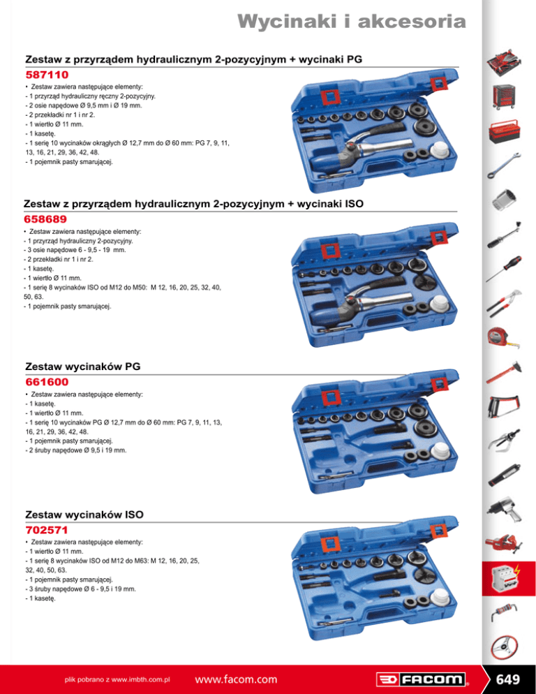 Wycinaki i akcesoria Zestaw z przyrządem hydraulicznym 2-pozycyjnym + wycinaki PG 587110 • Zestaw zawiera następujące elementy: - 1 przyrząd hydrauliczny ręczny 2-pozycyjny. - 2 osie napędowe Ø 9,5 mm i Ø 19 mm. - 2 przekładki nr 1 i nr 2. - 1 wiertło Ø 11 mm. - 1 kasetę. - 1 serię 10 wycinaków okrągłych Ø 12,7 mm do Ø 60 mm: PG 7, 9, 11, 13, 16, 21, 29, 36, 42, 48. - 1 pojemnik pasty smarującej. Zestaw z przyrządem hydraulicznym 2-pozycyjnym + wycinaki ISO 658689 • Zestaw zawiera następujące elementy: - 1 przyrząd hydrauliczny 2-pozycyjny. - 3 osie napędowe 6 - 9,5 - 19 mm. - 2 przekładki nr 1 i nr 2. - 1 kasetę. - 1 wiertło Ø 11 mm. - 1 serię 8 wycinaków ISO od M12 do M50: M 12, 16, 20, 25, 32, 40, 50, 63. - 1 pojemnik pasty smarującej. Zestaw wycinaków PG 661600 • Zestaw zawiera następujące elementy: - 1 kasetę. - 1 wiertło Ø 11 mm. - 1 serię 10 wycinaków PG Ø 12,7 mm do Ø 60 mm: PG 7, 9, 11, 13, 16, 21, 29, 36, 42, 48. - 1 pojemnik pasty smarującej. - 2 śruby napędowe Ø 9,5 i 19 mm. Zestaw wycinaków ISO 702571 • Zestaw zawiera następujące elementy: - 1 wiertło Ø 11 mm. - 1 serię 8 wycinaków ISO od M12 do M63: M 12, 16, 20, 25, 32, 40, 50, 63. - 1 pojemnik pasty smarującej. - 3 śruby napędowe Ø 6 - 9,5 i 19 mm. - 1 kasetę. plik pobrano z www.imbth.com.pl www.facom.com 649