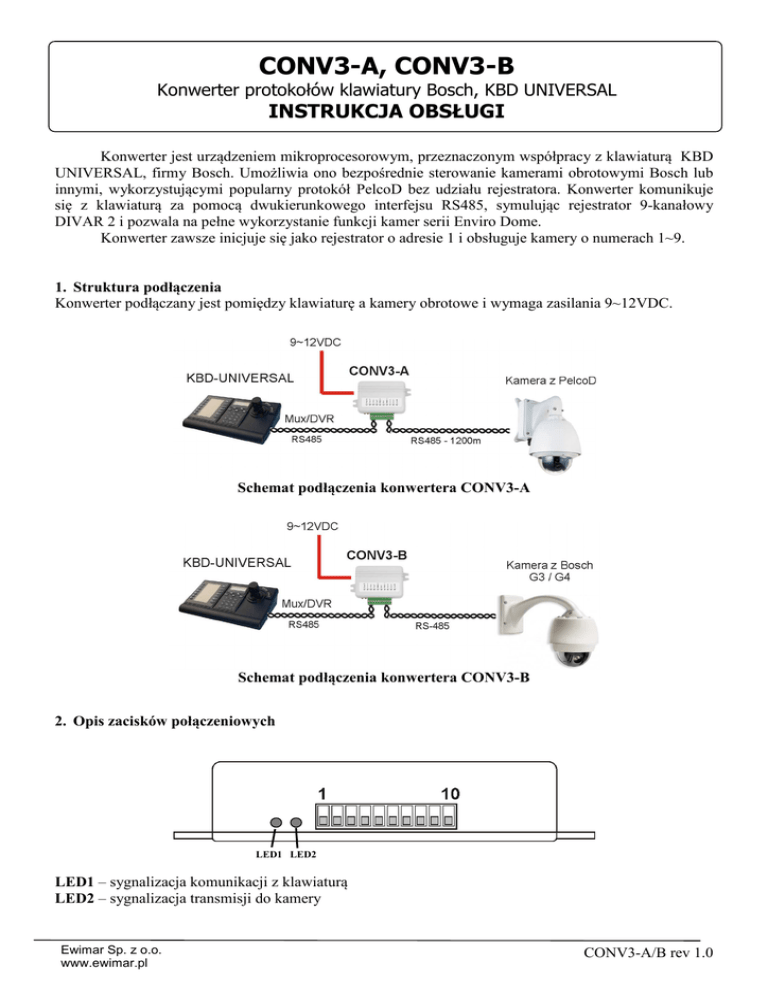 CONV3-A, CONV3-B Konwerter protokołów klawiatury Bosch, KBD UNIVERSAL INSTRUKCJA OBSŁUGI Konwerter jest urządzeniem mikroprocesorowym, przeznaczonym współpracy z klawiaturą KBD UNIVERSAL, firmy Bosch. Umożliwia ono bezpośrednie sterowanie kamerami obrotowymi Bosch lub innymi, wykorzystującymi popularny protokół PelcoD bez udziału rejestratora. Konwerter komunikuje się z klawiaturą za pomocą dwukierunkowego interfejsu RS485, symulując rejestrator 9-kanałowy DIVAR 2 i pozwala na pełne wykorzystanie funkcji kamer serii Enviro Dome. Konwerter zawsze inicjuje się jako rejestrator o adresie 1 i obsługuje kamery o numerach 1~9. 1. Struktura podłączenia Konwerter podłączany jest pomiędzy klawiaturę a kamery obrotowe i wymaga zasilania 9~12VDC. Schemat podłączenia konwertera CONV3-A Schemat podłączenia konwertera CONV3-B 2. Opis zacisków połączeniowych LED1 LED2 LED1 – sygnalizacja komunikacji z klawiaturą LED2 – sygnalizacja transmisji do kamery Ewimar Sp. z o.o. www.ewimar.pl CONV3-A/B rev 1.0 Zasilanie +/- - Służy do podłączenia zasilania 12VDC / 500mA Kamera – Interfejs RS-485, przeznaczony do podłączenia kamery Klawiatura – Interfejs RS485, przeznaczony do podłączenia klawiatury Interfejs RS-485, należy podłączać zawsze zgodnie z innymi urządzeniami A do A i B do B. Najbardziej korzystna topologia dla RS485 jest w postaci szeregowej, z załączonymi rezystorami terminującymi 120Ohm, załączanymi na dwóch końcach magistrali. Jeżeli warunki wymuszają topologię gwiazdy, należy dystrybutor RS485, na przykład EW-485/2/2 lub EW-485/4/1. zastosować Rysunek obok przedstawia sygnały interfejsu RS-485 w klawiaturze KBD UNIVERSAL. W celu ułatwienia instalacji, zalecane jest zastosowanie przewodu telefonicznego z wtykiem RJ11 oraz gniazdka telefonicznego, w którym należy wykonać podłączenie do konwertera CONV3 3. Opis przełączników SW1 – konfiguracja komunikacji z klawiaturą Przeł. 1~4 – zarezerwowane dla następnych wersji oprogramowania Przeł. 5 – filtrowanie pakietów: Przy wyłączonym wyłączniku, transmitowane są wszystkie pakiety danych klawiatury (wymagane dla protokołu Bosch). Po załączeniu, powtarzające się pakiety są blokowane (zalecane dla innych kamer) Przeł 6~7 – szybkość komunikacji. Klawiatura Bosch wymaga transmisji 19200 baud – przełącznik 6,7 w pozycji ON Przeł 8 – załączenie terminancji 120Ohm dla klawiatury SW2 – konfiguracja dla kamery Przeł. 1~4 – zarezerwowane dla następnych wersji oprogramowania Przeł. 5 – wybór protokołu wyjściowego kamery: OFF – Bosch RS485 (tryb CONV3-B) , ON – Pelco-D (Tryb CONV3-A) Przeł 6~7 – Szybkość transmisji dla portu RS-485 kamery: 2400Baud – 6,7 OFF, 4800baud – 6 ON, 7 OFF, 9600 baud – 6 ON, 7 OFF , 19200 baud – 6 ON, 7 ON Inne parametry: 8 bitów danych, 1 bit startu, 1 bit stopu, bez parzystości. Przeł 8 – załączenie terminancji 120Ohm dla RS485 kamery 4. Uruchomienie Po podłączeniu wszystkich przewodów, należy najpierw podłączyć zasilanie konwertera, następnie zasilanie klawiatury – klawiatura automatycznie zainicjuje urządzenie jako rejestrator o adresie 1. W przypadku odwrotnego podłączenia zasilania, należy na klawiaturze nacisnąć przycisk PROD, w celu wyszukania urządzeń na magistrali. Ewimar Sp. z o.o. www.ewimar.pl CONV3-A/B rev 1.0