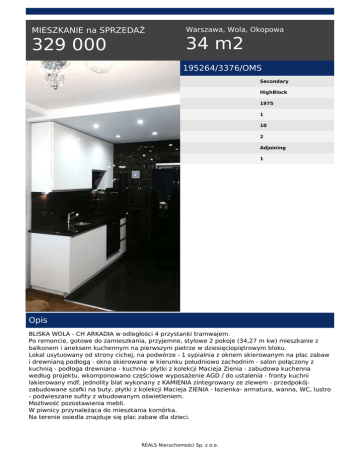 MIESZKANIE na SPRZEDAŻ 329 000 Warszawa, Wola, Okopowa 34 m2 195264/3376/OMS Secondary HighBlock 1975 1 10 2 Adjoining 1 Opis BLISKA WOLA - CH ARKADIA w odległości 4 przystanki tramwajem. Po remoncie, gotowe do zamieszkania, przyjemne, stylowe 2 pokoje (34,27 m kw) mieszkanie z balkonem i aneksem kuchennym na pierwszym pietrze w dziesięciopiętrowym bloku. Lokal usytuowany od strony cichej, na podwórze - 1 sypialnia z oknem skierowanym na płac zabaw i drewnianą podłogą - okna skierowane w kierunku południowo zachodnim - salon połączony z kuchnią - podłoga drewniana - kuchnia- płytki z kolekcji Macieja Zienia - zabudowa kuchenna według projektu, wkomponowano częściowe wyposażenie AGD / do ustalenia - fronty kuchni lakierowany mdf, jednolity blat wykonany z KAMIENIA zintegrowany ze zlewem - przedpokójzabudowane szafki na buty, płytki z kolekcji Macieja ZIENIA - łazienka- armatura, wanna, WC, lustro - podwieszane sufity z wbudowanym oświetleniem. Możliwość pozostawienia mebli. W piwnicy przynależąca do mieszkania komórka. Na terenie osiedla znajduje się plac zabaw dla dzieci. REALS Nieruchomości Sp. z o.o. Lokalizacja idealna dla osób ceniących wygodę i dobrą komunikację. W bliskim otoczeniu znajduje się supermarket oraz liczne sklepy samoobsługowe. Dobrą komunikację zapewnia niedalekie sąsiedztwo budującej się stacji Metra. Oddział Halina Władyka tel. 733 999 942 tel. 22 829 92 10 email: [email protected] REALS Nieruchomości Sp. z o.o. Powered by TCPDF (www.tcpdf.org)