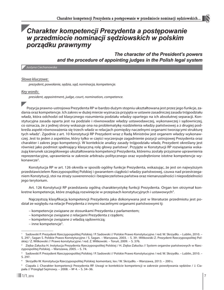 ȱȱ£¢ȱȱ¿ ȱ ȱ£ȱȱ¿£ ǯǯǯ &KDUDNWHUNRPSHWHQFML3UH]\GHQWDDSRVWĊSRZDQLH ZSU]HGPLRFLHQRPLQDFMLVĊG]LRZVNLFKZSROVNLP SRU]ąGNXSUDZQ\P\ 7KHFKDUDFWHURIWKH3UHVLGHQW¶VSRZHUV DQGWKHSURFHGXUHRIDSSRLQWLQJMXGJHVLQWKH3ROLVKOHJDOV\VWHP Justyna Ciechanowska Słowa kluczowe: prezydent, powołanie, sędzia, sąd, nominacja, kompetencje. Key words: president, appointment, judge, court, nomination, competence. Pozycja prawno-ustrojowa Prezydenta RP w bardzo dużym stopniu ukształtowana jest przez jego funkcje, zadania oraz kompetencje. Ich zakres w dużej mierze wyznacza przyjęta w ustawie zasadniczej zasada trójpodziału władz, która odchodzi od klasycznego rozumienia podziału władzy opartego na ich absolutnej separacji. Konstytucyjna zasada oparta jest na podziale i równowadze władzy ustawodawczej, wykonawczej i sądowniczej, co oznacza, że z jednej strony wskazuje ona na problematykę rozdzielenia władzy państwowej a z drugiej podkreśla aspekt równoważenia się trzech władz w relacjach pomiędzy naczelnymi organami tworzącymi strukturę tych władz1. Zgodnie z art. 10 Konstytucji RP Prezydent wraz z Radą Ministrów jest organem władzy wykonawczej. Jest to jeden z aspektów, który tylko w części wyczerpuje zagadnienie pozycji ustrojowej Prezydenta oraz charakter i zakres jego kompetencji. W kontekście analizy zasady trójpodziału władz, Prezydent określany jest również jako podmiot spełniający klasyczną rolę głowy państwa2. Przyjęte w Konstytucji RP rozwiązania wskazują kierunek szczegółowego ukształtowania kompetencji Prezydenta, któremu zostały przyznane uprawnienia reprezentacyjne, uprawnienia w zakresie arbitrażu politycznego oraz wyodrębnione istotne kompetencje wykonawcze3. Konstytucja RP w art. 126 określa w sposób ogólny funkcje Prezydenta, wskazując, że jest on najwyższym przedstawicielem Rzeczypospolitej Polskiej i gwarantem ciągłości władzy państwowej, czuwa nad przestrzeganiem Konstytucji, stoi na straży suwerenności i bezpieczeństwa państwa oraz nienaruszalności i niepodzielności jego terytorium. Art. 126 Konstytucji RP przedstawia ogólną charakterystykę funkcji Prezydenta. Organ ten otrzymał konkretne kompetencje, które znajdują rozwinięcie w przepisach konstytucyjnych i ustawowych4. Najczęstszą klasyfikacją kompetencji Prezydenta jaka dokonywana jest w literaturze przedmiotu jest podział ze względu na relacje Prezydenta z innymi naczelnymi organami państwowymi tj: – kompetencje związane ze stosunkami Prezydenta z parlamentem; – kompetencje związane z relacjami Prezydenta z rządem; – kompetencje związane z władzą sądowniczą; – inne kompetencje5. 1 Sadowski P. Prezydent Rzeczypospolitej Polskiej / P. Sadowski // Polskie Prawo Konstytucyjne / red. W. Skrzydło. – Lublin, 2010. – S. 297 ; Sagan S. Polskie Prawo Konstytucyjne / S. Sagan. – Warszawa, 2003. – S. 39 ; Witkowski Z. Prezydent Rzeczypospolitej Polskiej / Z. Witkowski // Prawo konstytucyjne / red. Z. Witkowski. – Toruń, 2009. – S. 376. 2 Zięba-Załucka H. Instytucja Prezydenta Rzeczypospolitej Polskiej / H. Zięba-Załucka // System organów państwowych w Rzeczypospolitej Polskiej. – Warszawa, 2005. – S. 74. 3 Sadowski P. Prezydent Rzeczypospolitej Polskiej / P. Sadowski // Polskie Prawo Konstytucyjne / red. W. Skrzydło. – Lublin, 2010. – S. 297. 4 Skrzydło W. Konstytucja Rzeczypospolitej Polskiej: komentarz, lex / W. Skrzydło. – Warszawa, 2013. – 200 s. 5 Ciapała J. Charakter kompetencji Prezydenta RP. Uwagi w kontekście kompetencji w zakresie powoływania sędziów / J. Ciapała // Przegląd Sejmowy. – 2008. – № 4. – S. 34–36. 1/1, 2016 7 Visegrad Journal on Human Rights Prezydenckie kompetencje są wykonywane w formie aktów urzędowych. Zgodnie z art. 144 Konstytucji RP można wyodrębnić dwie grupy. Pierwsza obejmuje akty podlegające kontrasygnacie Prezesa Rady Ministrów, druga zaś to tzw. prerogatywy, które Prezydent podejmuje dyskrecjonalnie, gdyż nie wymagają one kontrasygnaty6. Zakres włączeń spod wymogu kontrasygnaty wyznacza w pewnym sensie linię graniczną pomiędzy kompetencjami władzy wykonawczej, które powinny być realizowane przy współpracy rządu z prezydentem a sferą samodzielnej działalności głowy państwa. Można spotkać się z opiniami, że dają one Prezydentowi RP możliwość rządzenia w ramach władzy wykonawczej7. Powoływanie sędziów przez Prezydenta zostało unormowane w Konstytucji jako jedna z zasadniczych kompetencji głowy państwa, która zgodnie z art. 144 ust.3 pkt. 17 stanowi prerogatywę czyli uprawnienie osobiste, które dla swej ważności nie wymaga kontrasygnaty Prezesa Rady Ministrów. Biorąc pod uwagę powyższe, kompetencję w zakresie powoływania sędziów, należy postrzegać w powiązaniu z funkcją głowy państwa oraz organu, który zapewnia ciągłość władzy państwowej. Wskazuje ona również pozycję prawną organów państwowych działających w ramach władzy ustawodawczej, wykonawczej i sądowniczej oraz przedstawia na ile Prezydent jest swobodny w dokonywaniu danej czynności8. Prezydent RP posiada uprawnienie powoływania sędziów sądów powszechnych, administracyjnych, wojskowych oraz sędziów Sądu Najwyższego. Jeżeli chodzi o przepisy odnoszące się do ww. kompetencji, to w pierwszej kolejności należy wskazać na unormowania konstytucyjne. Zgodnie z art. 179 Konstytucji RP sędziowie są powoływani przez Prezydenta RP, na wniosek Krajowej Rady Sądownictwa (dalej KRS), na czas nie oznaczony. Dalsza konkretyzacja trybu wykonywania przez Prezydenta ww. uprawnienia zawarta jest w ustawach ustrojowych odnoszących się do wymiaru sprawiedliwości tj. ustawie Prawo o ustroju sądów powszechnych9, ustawie Prawo o ustroju sadów administracyjnych10, ustawie o Sądzie Najwyższym11, ustawie Prawo o ustroju sądów wojskowych12. Unormowania dotyczące powoływania sędziów zawarte w ww. aktach prawnych