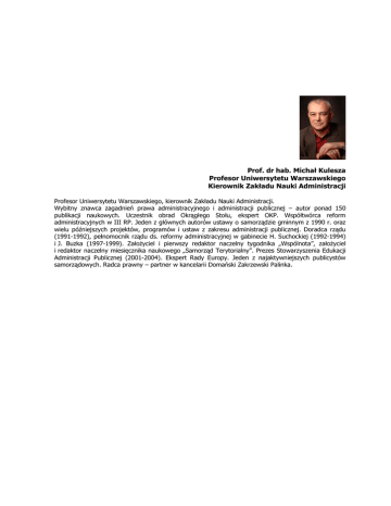 Prof. dr hab. Michał Kulesza Profesor Uniwersytetu Warszawskiego Kierownik Zakładu Nauki Administracji Profesor Uniwersytetu Warszawskiego, kierownik Zakładu Nauki Administracji. Wybitny znawca zagadnień prawa administracyjnego i administracji publicznej – autor ponad 150 publikacji naukowych. Uczestnik obrad Okrągłego Stołu, ekspert OKP. Współtwórca reform administracyjnych w III RP. Jeden z głównych autorów ustawy o samorządzie gminnym z 1990 r. oraz wielu późniejszych projektów, programów i ustaw z zakresu administracji publicznej. Doradca rządu (1991-1992), pełnomocnik rządu ds. reformy administracyjnej w gabinecie H. Suchockiej (1992-1994) i J. Buzka (1997-1999). Założyciel i pierwszy redaktor naczelny tygodnika „Wspólnota”, założyciel i redaktor naczelny miesięcznika naukowego „Samorząd Terytorialny”. Prezes Stowarzyszenia Edukacji Administracji Publicznej (2001-2004). Ekspert Rady Europy. Jeden z najaktywniejszych publicystów samorządowych. Radca prawny – partner w kancelarii Domański Zakrzewski Palinka.