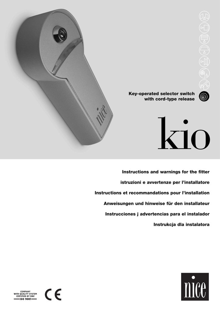 Key-operated selector switch with cord-type release kio Instructions and warnings for the fitter istruzioni e avvertenze per l’installatore Instructions et recommandations pour l’installation Anweisungen und hinweise für den installateur Instrucciones j advertencias para el instalador Instrukcja dla instalatora kio Spis: pag. pag. 1 Opis 24 6 Test odbiorczy 25 2 Wymiary Gabarytowe 24 7 Czynności konserwacyjne 25 3 Mocowanie 24 8 Utylizacja 25 4 Połączenia Elektryczne 25 9 Dane techniczne 25 5 Ruch Ręczny 25 PL Ostrzeżenie Niniejsza instrukcja przeznaczona jest wyłącznie dla technika instalatora z odpowiednimi kwalifikacjami. Żadna z informacji zawartych w niniejszej instrukcji nie służy użytkownikowi. Przed przystąpieniem do instalowania automatyki należy uważnie przeczytać całą instrukcję, ponieważ dostarcza ona ważnych informacji związanych z bezpieczeństwem, instalacją, użytkowaniem i czynnościami konserwacyjnymi. Inne czynności poza tymi zawartymi w niniejszej instrukcji nie są dozwolone. Niewłaściwe użytkowanie może być źródłem uszkodzeń i niebezpiecznych sytuacji. Siłownik RONDO nie jest przeznaczony do użytku w środowisku zagrożonym eksplozją. 23 1) Opis KIO służy jako selektor kluczowy ze światełkiem nocnym i jako ręczne wysprzęglenie. Przekręcając kluczem o kąt około 30 od pozycji poziomej będziemy mieć do dyspozycji dwa wyłączniki: jeden w kierunku zegarowym i drugi w kierunku przeciwnym. Kontynuując przekręcanie klucza (w dowolnym kierunku) uchwyt otworzymy i będzie można wykonać ruch wysprzęglenia. Maksymalna długość ruchu wodzika wewnątrz uchwytu wynosi 60mm. Ot Wysprzęglenie 1 2) Wymiary Gabarytowe 2 1. 2. 3. 4. 5. 6. Przekręcić kluczem o 90 w żądanym kierunku; Rys. 3 Przekręcić uchwyt wysprzęglenia o 90; Rys. 4 Odkręcić i wyciągnąć wkręt mocujący osłonę; Rys. 5 Odczepić sprężynę naciskającą osłonę; Rys. 6 Dosunąć do ściany selektor i zaznaczyć pozycję otworów; Wywiercić cztery otwory i przymocować selektor do ściany 4 wkrętami, pamiętając o założeniu podkładek; Rys. 7 7. Podłączyć do wysprzęglenia linkę stalową, której 20 mm ma wystawać z powłoki; 8. Delikatnie odczepić pokrywkę (A) i ustawić wodzik na pozycji wskazanej na rysunku, po czym odkręcić śrubkę; Rys. 8 9. Założyć stalową linkę i zablokować śrubką; DOKR CIĆ DO OPORU; Rys. 8b 10. Zarejestrować natężenie linki mając na uwadze, że w tej pozycji automatyka jest odblokowana; 11. Założyć pokrywkę, o której mowa w punkcie 7; 12. Założyć na miejsce sprężynkę i ustawić osłonę (B) I przykręcić wkrętem (C). Rys. 9 24 Za Wysprzęglenie 4) Połączenia Elektryczne Do sterowania waszego urządzenia należy zastosować odpowiednie kontakty. Nigdy nie stosować ich do bezpośredniego sterowania silnika. Rys. 10 OTWIERA ŚWIATEłKO OSTRZEGAWCZE ZAMYKA 10 5) Ruch Ręczny 1. Ruch ręczny należy wykonać przy bramie zamkniętej. 2. Całkowicie przekręcić kluczem uchwyt wysprzęgający pomagając sobie palcem; Rys. 11. 3. Otworzyć do 90 uchwyt wysprzęglenia. Rys. 12 W tym wypadku uzyska się wystarczającą długość ruchu linki do odblokowania automatyki RONDO. Gdy jednak do odblokowania automatyki wymagana jest dłuższa długość ruchu należy postąpić następująco; 4. Gdy uchwyt jest otwarty pociągnąć pokrętło w kierunku do siebie; Rys. 13 5. Przekręcić do oporu w kierunku zegarowym; Rys. 14 6. Otworzyć i zamknąć ręcznie bramę; 7. Aby zablokować siłownik przekręcić pokrętłem do oporu w kierunku przeciwnym; 8. Ponownie założyć pokrętło do uchwytu; 9. Zamknąć uchwyt lekkim naciśnięciem. Można zamknąć uchwyt nawet, gdy silnik jest odblokowany. PL 6) Test odbiorczy Test odbiorczy KIO wykonać według poniższej procedury: • Sprawdzić stan odlewow. • Sprawdzić czy zamek nie jest zardzewiały i czy klucz przekręca się swobodnie. • Sprawdzić czy ruch wysprzęglania odbywa się swobodnie. • • • • Sprawdzić czy wnętrze wyłącznika nie jest zabrudzone osadem. Sprawdzić stan połączeń elektrycznych. Sprawdzić stan połączeń śrubowych. Sprawdzić funkcjonowanie złączy. 7) Czynności konserwacyjne KIO nie wymaga specjalnej uwagi, ale należy wykonywać czynności konserwacyjne zaprogramowane co najmniej co 6 miesięcy należy wówczas sprawdzić jego stan (obecność wilgotności, osadów, itp.) i należy powtórzyć próby ostateczne. 8) Utylizacja KIO zbudowany jest z wielu rodzajów surowców, niektóre z nich można przerobić. Zapoznać się z obowiązującymi miejscowymi normami zbytu produktu. 9) Dane techniczne Typologia Zasilenia do światełka nocnego Stopień zabezpieczenia Temperatura funkcjonowania Maksymalne napięcie w kontaktach Maksymalny prąd w kontaktach Kody zamknięcia : : : : : : : Wyłącznik na klucz z linowym wysprzęglaniem Od 12V do 36Vdc, od 12V do 28Vac IP 55 Od -20 do + 55°C (bez zamrażania) 50Vac - Vdc 1A 250.000 Nice zastrzega sobie prawo do wprowadzenia zmian w produktach w każdym momencie, kiedy będzie uważała za niezbędne. 25 3 4 5 A 6 7 8 B C 8b 9 11 12 13 14 KIO 15 rif. mod. 1 2 3 4 5 6 7 8 9 10 11 12 13 14 15 16 17 18 19 20 21 22 23 24 25 26 27 28 29 30 31 32 BMG0796 BMG0798 BMM0797 PPD0805 PPD0802 PPD0824 PPD0823 PPD0799 PPD0803 PPD0800 PPD0801 PPD0804 PMD0806 PMD0807 V4x10-B V4.2x9 MO-0922 V3.5x25 V3.5x13 R05 PMCS42 G5x6 MO-0923 PMD0925 PMCSE8 MICROI-C GOR-E GOR-A 149-A CM-H MO-0924 MPTASS-A art. 34567 34567 34567 4540 4540 4540 4540 4540 4540 4540 4540 4540 4610 4610 5102 5101 2640 5101 5101 5120 4630 5123 2640 4610 4630 1617 5501 5501 8001 1630 2640 5101 Dichiarazione CE di conformità / EC declaration of conformity Numero / Number: 169/KIO Data / Date: 04/2003 Revisione / Revision: 0 Il sottoscritto Lauro Buoro, Amministratore Delegato, dichiara che il prodotto: The undersigned Lauro Buoro, General Manager, declares that the product: Nome produttore / Producer name: In