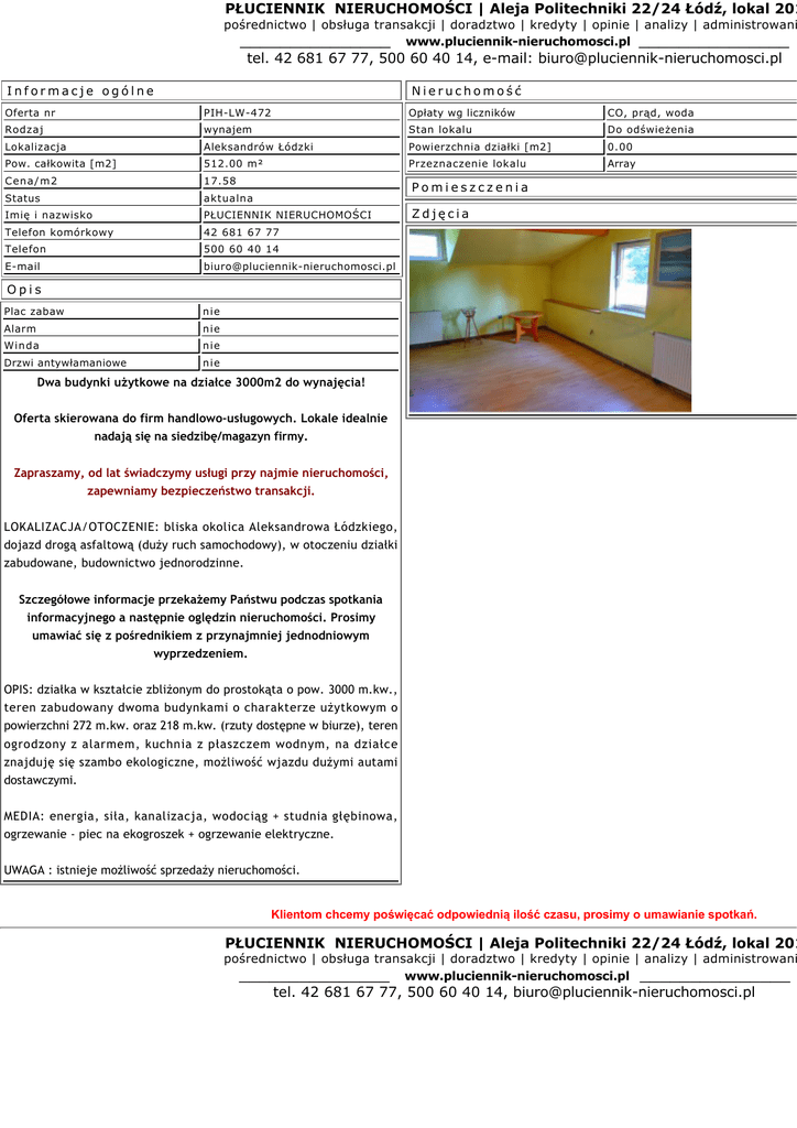 PŁUCIENNIK NIERUCHOMOŚCI | Aleja Politechniki 22/24 Łódź, lokal 201 pośrednictwo | obsługa transakcji | doradztwo | kredyty | opinie | analizy | administrowani _______________ www.pluciennik-nieruchomosci.pl _______________ tel. 42 681 67 77, 500 60 40 14, e-mail: [email protected] Informacje ogólne Nieruchomość Oferta nr PIH-LW-472 Opłaty wg liczników CO, prąd, woda Rodzaj wynajem Stan lokalu Do odświeżenia Lokalizacja Aleksandrów Łódzki Powierzchnia działki [m2] 0.00 Pow. całkowita [m2] 512.00 m² Przeznaczenie lokalu Array Cena/m2 17.58 Status aktualna Imię i nazwisko PŁUCIENNIK NIERUCHOMOŚCI Telefon komórkowy 42 681 67 77 Telefon 500 60 40 14 E-mail [email protected] Pomieszczenia Zdjęcia Opis Plac zabaw nie Alarm nie Winda nie Drzwi antywłamaniowe nie Dwa budynki użytkowe na działce 3000m2 do wynajęcia! Oferta skierowana do firm handlowo‐usługowych. Lokale idealnie nadają się na siedzibę/magazyn firmy. Zapraszamy, od lat świadczymy usługi przy najmie nieruchomości, zapewniamy bezpieczeństwo transakcji. LOKALIZACJA/OTOCZENIE: bliska okolica Aleksandrowa Łódzkiego, dojazd drogą asfaltową (duży ruch samochodowy), w otoczeniu działki zabudowane, budownictwo jednorodzinne. Szczegółowe informacje przekażemy Państwu podczas spotkania informacyjnego a następnie oględzin nieruchomości. Prosimy umawiać się z pośrednikiem z przynajmniej jednodniowym wyprzedzeniem. OPIS: działka w kształcie zbliżonym do prostokąta o pow. 3000 m.kw., teren zabudowany dwoma budynkami o charakterze użytkowym o powierzchni 272 m.kw. oraz 218 m.kw. (rzuty dostępne w biurze), teren ogrodzony z alarmem, kuchnia z płaszczem wodnym, na działce znajduję się szambo ekologiczne, możliwość wjazdu dużymi autami dostawczymi. MEDIA: energia, siła, kanalizacja, wodociąg + studnia głębinowa, ogrzewanie ‐ piec na ekogroszek + ogrzewanie elektryczne. UWAGA : istnieje możliwość sprzedaży nieruchomości. Klientom chcemy poświęcać odpowiednią ilość czasu, prosimy o umawianie spotkań. PŁUCIENNIK NIERUCHOMOŚCI | Aleja Politechniki 22/24 Łódź, lokal 201 pośrednictwo | obsługa transakcji | doradztwo | kredyty | opinie | analizy | administrowani _______________ www.pluciennik-nieruchomosci.pl _______________ tel. 42 681 67 77, 500 60 40 14, [email protected]