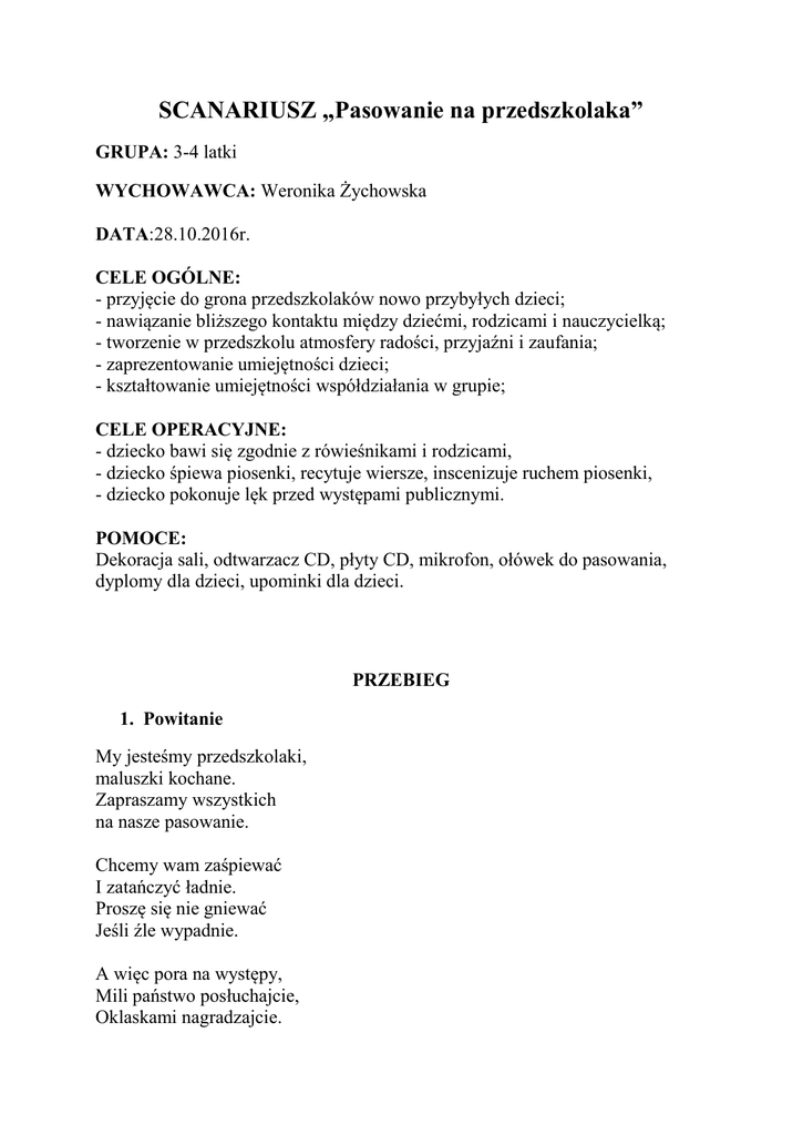 SCANARIUSZ „Pasowanie na przedszkolaka” GRUPA: 3-4 latki WYCHOWAWCA: Weronika Żychowska DATA:28.10.2016r. CELE OGÓLNE: - przyjęcie do grona przedszkolaków nowo przybyłych dzieci; - nawiązanie bliższego kontaktu między dziećmi, rodzicami i nauczycielką; - tworzenie w przedszkolu atmosfery radości, przyjaźni i zaufania; - zaprezentowanie umiejętności dzieci; - kształtowanie umiejętności współdziałania w grupie; CELE OPERACYJNE: - dziecko bawi się zgodnie z rówieśnikami i rodzicami, - dziecko śpiewa piosenki, recytuje wiersze, inscenizuje ruchem piosenki, - dziecko pokonuje lęk przed występami publicznymi. POMOCE: Dekoracja sali, odtwarzacz CD, płyty CD, mikrofon, ołówek do pasowania, dyplomy dla dzieci, upominki dla dzieci. PRZEBIEG 1. Powitanie My jesteśmy przedszkolaki, maluszki kochane. Zapraszamy wszystkich na nasze pasowanie. Chcemy wam zaśpiewać I zatańczyć ładnie. Proszę się nie gniewać Jeśli źle wypadnie. A więc pora na występy, Mili państwo posłuchajcie, Oklaskami nagradzajcie. 2. Piosenka „Jestem sobie przedszkolaczek” Jestem sobie przedszkolaczek Nie grymaszę i nie płaczę Na bębenku marsza gram ram, tam, tam 2x Mamy tu zabawek wiele Razem bawić się weselej Bo kolegów dobrych mam ram, tam, tam 2x Kto jest beksą i mazgajem Ten się do nas nie nadaje Niechaj w domu siedzi sam ram, tam, tam2x Mamy klocki, kredki, farby To są nasze wspólne skarby Bardzo dobrze tutaj nam ram, tam, tam 2x 3. Wiersz „Oto ja” Hopsasa, oto ja. Rączki dwie, nóżki dwie Hopsasa każdy wie. Głowa dwoje uszu ma, oczy, broda, usta, nos. No włosów całą moc. Hopsasa oto ja. 4. Wiersze Coś wam powiem w tajemnicy Wielki sekret zdradzę wam. Lubię chodzić do przedszkola Bo już latka swoje mam. W przedszkolu zabawek I książek bez liku. Każdy ma tam miejsce przy małym stoliku. Razem z naszą panią Pilnie się uczymy. Gdy czas na zabawę chętnie się bawimy. Dwa miesiące już się znamy, razem się bawimy. Razem też śpiewamy i razem broimy. Powiem wam coś jeszcze, nie mówcie nikomu. Że my się czujemy w przedszkolu jak w domu. 5. Piosenka „Wesołe przedszkole”. Kiedy słońce świeci i gdy deszczyk pada idzie do przedszkola wesoła gromada. Tupią małe nóżki tupu, tupu tup. Raźno do przedszkola idzie mały zuch. Klocki, misie lalki czekają od rana, Uśmiechem nas wita pani ukochana. Bawi się w zgodzie zawsze ty i ja. Tańczymy wesoło hopsa hopsasa. A gdy usiądziemy wszyscy na dywanie to nasze kółeczko zmienia się w słoneczko. Śpiewamy piosenki tralala lala Wesoło w przedszkolu zawsze mija czas. 6. Wiersz Już za chwilę na tej Sali będzie wielkie wydarzenie Każdy maluch dziś tu stanie i otrzyma pasowanie. 7. Uroczyste pasowanie przedszkolaków. 8. Wręczenie dyplomów i upominków. 9. Poczęstunek dla dzieci i rodziców.