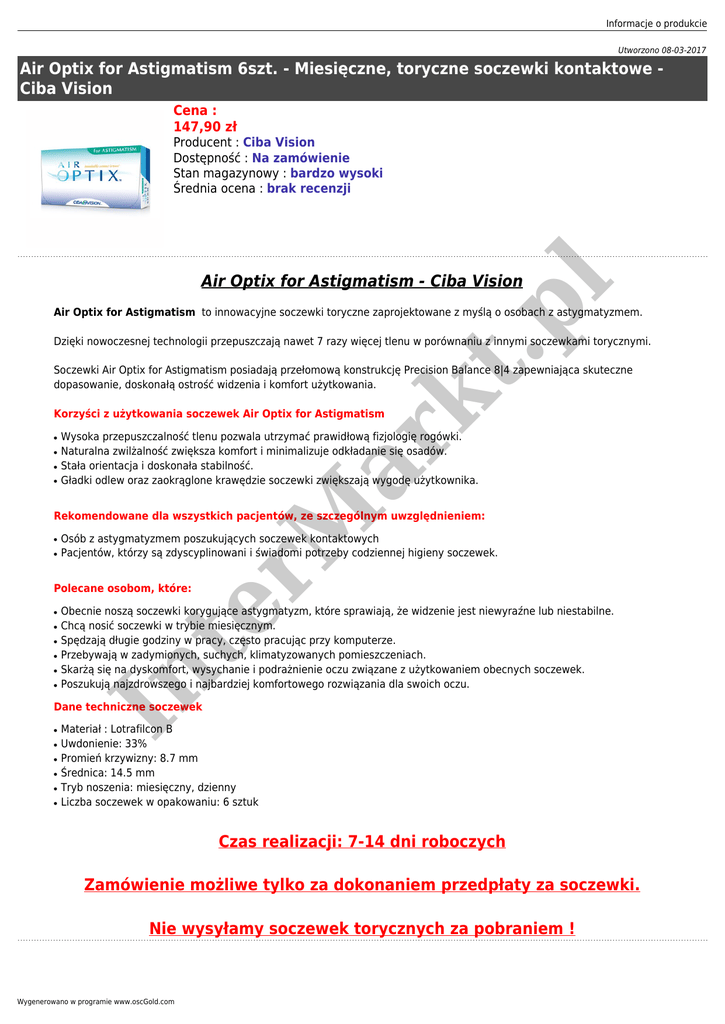 Informacje o produkcie Utworzono 08-03-2017 Air Optix for Astigmatism 6szt. - Miesięczne, toryczne soczewki kontaktowe Ciba Vision Cena : 147,90 zł Producent : Ciba Vision Dostępność : Na zamówienie Stan magazynowy : bardzo wysoki Średnia ocena : brak recenzji .p l Air Optix for Astigmatism - Ciba Vision Air Optix for Astigmatism to innowacyjne soczewki toryczne zaprojektowane z myślą o osobach z astygmatyzmem. Dzięki nowoczesnej technologii przepuszczają nawet 7 razy więcej tlenu w porównaniu z innymi soczewkami torycznymi. ar kt Soczewki Air Optix for Astigmatism posiadają przełomową konstrukcję Precision Balance 8|4 zapewniająca skuteczne dopasowanie, doskonałą ostrość widzenia i komfort użytkowania. Korzyści z użytkowania soczewek Air Optix for Astigmatism ● ● ● Wysoka przepuszczalność tlenu pozwala utrzymać prawidłową fizjologię rogówki. Naturalna zwilżalność zwiększa komfort i minimalizuje odkładanie się osadów. Stała orientacja i doskonała stabilność. Gładki odlew oraz zaokrąglone krawędzie soczewki zwiększają wygodę użytkownika. M ● Rekomendowane dla wszystkich pacjentów, ze szczególnym uwzględnieniem: ● Osób z astygmatyzmem poszukujących soczewek kontaktowych Pacjentów, którzy są zdyscyplinowani i świadomi potrzeby codziennej higieny soczewek. te r ● Polecane osobom, które: ● ● ● ● ● Obecnie noszą soczewki korygujące astygmatyzm, które sprawiają, że widzenie jest niewyraźne lub niestabilne. Chcą nosić soczewki w trybie miesięcznym. Spędzają długie godziny w pracy, często pracując przy komputerze. Przebywają w zadymionych, suchych, klimatyzowanych pomieszczeniach. Skarżą się na dyskomfort, wysychanie i podrażnienie oczu związane z użytkowaniem obecnych soczewek. Poszukują najzdrowszego i najbardziej komfortowego rozwiązania dla swoich oczu. In ● Dane techniczne soczewek ● ● ● ● ● ● Materiał : Lotrafilcon B Uwdonienie: 33% Promień krzywizny: 8.7 mm Średnica: 14.5 mm Tryb noszenia: miesięczny, dzienny Liczba soczewek w opakowaniu: 6 sztuk Czas realizacji: 7-14 dni roboczych Zamówienie możliwe tylko za dokonaniem przedpłaty za soczewki. Nie wysyłamy soczewek torycznych za pobraniem ! Wygenerowano w programie www.oscGold.com Dostępne opcje Air Optix for Astigmatism 6szt. - Miesięczne, toryczne soczewki kontaktowe - Ciba Vision » Wybierz moc soczewek (D): -10.0 D, -9.50 D, -9.00 D, -8.50 D, -8.00 D, -7.50 D, -7.00 D, -6.50 D, -6.00 D, -5.75 D, -5.50 D, In te r M ar kt .p l -5.25 D, -5.00 D, -4.75 D, -4.50 D, -4.25 D, -4.00 D, -3.75 D, -3.50 D, -3.25 D, -3.00 D, -2.75 D, -2.50 D, -2.25 D, -2.00 D, -1.75 D, -1.50 D, -1.25 D, -1.00 D, -0.75 D, -0.50 D, -0.25 D, 0 D ( PLANO ), +0.25 D, +0.50 D, +0.75 D, +1.00 D, +1.25 D, +1.50 D, +1.75 D, +2.00 D, +2.25 D, +2.50 D, +2.75 D, +3.00 D, +3.25 D, +3.50 D, +3.75 D, +4.00 D, +4.25 D, +4.50 D, +4.75 D, +5.00 D, +5.25 D, +5.50 D, +5.75 D, +6.00 D. » Cylinder: -0.75, -1.25, -1.75, -2.25. » Oś: 10, 20, 30, 40, 50, 60, 70, 70, 80, 90, 100, 110, 120, 130, 140, 150, 160, 170, 180. » BC ( krzywizna ): 8.7 mm. » DIA ( średnica ): 14.5 mm.