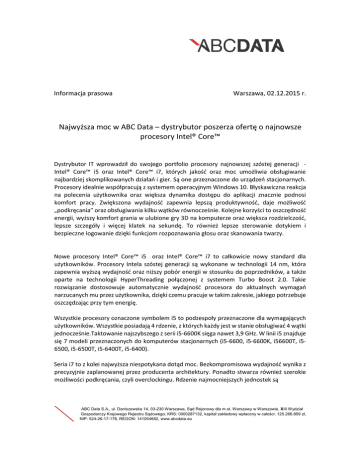 Informacja prasowa Warszawa, 02.12.2015 r. Najwyższa moc w ABC Data – dystrybutor poszerza ofertę o najnowsze procesory Intel® Core™ Dystrybutor IT wprowadził do swojego portfolio procesory najnowszej szóstej generacji Intel® Core™ i5 oraz Intel® Core™ i7, których jakość oraz moc umożliwia obsługiwanie najbardziej skomplikowanych działań i gier. Są one przeznaczone do urządzeń stacjonarnych. Procesory idealnie współpracują z systemem operacyjnym Windows 10. Błyskawiczna reakcja na polecenia użytkownika oraz większa dynamika dostępu do aplikacji znacznie podnosi komfort pracy. Zwiększona wydajność zapewnia lepszą produktywność, daje możliwość „podkręcania” oraz obsługiwania kilku wątków równocześnie. Kolejne korzyści to oszczędność energii, wyższy komfort grania w ulubione gry 3D na komputerze oraz większa rozdzielczość, lepsze szczegóły i więcej klatek na sekundę. To również lepsze sterowanie dotykiem i bezpieczne logowanie dzięki funkcjom rozpoznawania głosu oraz skanowania twarzy. Nowe procesory Intel® Core™ i5 oraz Intel® Core™ i7 to całkowicie nowy standard dla użytkowników. Procesory Intela szóstej generacji są wykonane w technologii 14 nm, która zapewnia wyższą wydajność oraz niższy pobór energii w stosunku do poprzedników, a także oparte na technologii HyperThreading połączonej z systemem Turbo Boost 2.0. Takie rozwiązanie dostosowuje automatycznie wydajność procesora do aktualnych wymagań narzucanych mu przez użytkownika, dzięki czemu pracuje w takim zakresie, jakiego potrzebuje oszczędzając przy tym energię. Wszystkie procesory oznaczone symbolem i5 to podzespoły przeznaczone dla wymagających użytkowników. Wszystkie posiadają 4 rdzenie, z których każdy jest w stanie obsługiwać 4 wątki jednocześnie.Taktowanie najszybszego z serii i5-6600K sięga nawet 3,9 GHz. W linii i5 znajduje się 7 modeli przeznaczonych do komputerów stacjonarnych (i5-6600, i5-6600K, i56600T, i56500, i5-6500T, i5-6400T, i5-6400). Seria i7 to z kolei najwyższa niespotykana dotąd moc. Bezkompromisowa wydajność wynika z precyzyjnie zaplanowanej przez producenta architektury. Ponadto stwarza również szerokie możliwości podkręcania, czyli overclockingu. Rdzenie najmocniejszych jednostek są ABC Data S.A., ul. Daniszewska 14, 03-230 Warszawa, Sąd Rejonowy dla m.st. Warszawy w Warszawie, XIII Wydział Gospodarczy Krajowego Rejestru Sądowego, KRS: 0000287132, kapitał zakładowy wpłacony w całości: 125.266.899 zł, NIP: 524-26-17-178, REGON: 141054682, www.abcdata.eu ośmiowątkowe, a taktowanie najszybszego z nich sięga 4,2 GHz. Siódemki mają 3 modele przeznaczone do zastosowań w komputerach stacjonarnych (i7-6700K, i7-6700T, i7-6700). Na uwagę zasługuje również najnowszy układ graficzny Intel Iris. Obsługuje on rozdzielczości na poziomie 4K i jest wystarczająco wydajny, aby sprostać najnowszym grom i programom, bez potrzeby wsparcia dodatkową kartą graficzną. To jednak nie koniec nowinek. Najbardziej obiecującą i trochę magiczną funkcją szóstej generacji procesorów Intel jest technologia RealSense. Jest to kamera, która pozwoli użytkownikowi na obsługę urządzeń i aplikacji za pomocą gestów. Możemy zatem odtworzyć sceny niczym z „Raportu mniejszości” w domowym zaciszu. Kamera RealSense potrafi zeskanować obiekty i stworzyć ich maski w 3D. W ten sposób możemy tworzyć modele rzeczy i ludzi, którymi podzielimy się w social media albo przy użyciu drukarki 3D odtworzymy w dowolnym czasie. O ABC Data S.A. ABC Data S.A. jest liderem rynku dystrybucji sprzętu IT i elektroniki użytkowej w Polsce oraz jedynym podmiotem działającym bezpośrednio w ośmiu państwach Europy Środkowej i Wschodniej (należących do UE). Firma od ponad 25 lat oferuje sprzęt komputerowy, oprogramowanie i elektronikę użytkową. ABC Data dysponuje największą na rynku ofertą ponad 100 tys. produktów ponad 430 renomowanych dostawców. W ostatnich miesiącach do portfolio produktowego włączone zostały nowe kategorie takie jak produkty smart, artykuły papiernicze i biurowe, zabawki oraz narzędzia i elektronarządzia. Dzięki systematycznemu rozwojowi i wieloletnim inwestycjom w internetowe platformy obsługi klientów, firma zajmuje czołową pozycję w zakresie sprzedaży on-line. W latach 2009 – 2014 ABC Data została pięciokrotnie wyróżniona nagrodą EMEA Channel Academy dla najlepszego dystrybutora regionu Europy Środkowo-Wschodniej. W 2015 roku spółka po raz kolejny zajęła pierwsze miejsce w głównym rankingu raportu Computerworld TOP 200 utrzymując status największej firmy informatycznej na rynku polskim. Jako pierwsza firma z Polski została członkiem GTDC, prestiżowego stowarzyszenia obejmującego 24 największych dystrybutorów IT na świecie. W 2010 roku ABC Data S.A. zadebiutowała na Giełdzie Papierów Wartościowych w Warszawie. Osoba do kontaktu: Agnieszka Forasińska ABC Data S.A. [email protected] +48 22 591 67 83 ABC Data S.A., ul. Daniszewska 14, 03-230 Warszawa, Sąd Rejonowy dla m.st. Warszawy w Warszawie, XIII Wydział Gospodarczy Krajowego Rejestru Sądowego, KRS: 0000287132, kapitał zakładowy wpłacony w całości: 125.266.899 zł, NIP: 524-26-17-178, REGON: 141054682, www.abcdata.eu