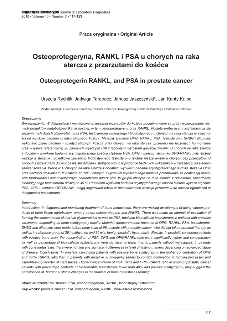 diagnostyka laboratoryjna Journal of Laboratory Diagnostics 2010 • Volume 46 • Number 2 • 117-123 Praca oryginalna • Original Article Osteoprotegeryna, RANKL i PSA u chorych na raka stercza z przerzutami do kośćca Osteoprotegerin RANKL, and PSA in prostate cancer Urszula Rychlik, Jadwiga Tarapacz, Janusz Jaszczyński*, Jan Kanty Kulpa Zakład Analityki i Biochemii Klinicznej, *Klinika Chirurgii Onkologicznej, Centrum Onkologii, Oddział w Krakowie Streszczenie Wprowadzenie: W diagnostyce i monitorowaniu leczenia przerzutów do kośćca poodejmowane są próby wykorzystania różnych produktów metabolizmu tkanki kostnej, w tym osteoprotegeryny oraz RANKL. Podjęto próbę oceny kształtowania się stężenia tych dwóch glikoprotein oraz PSA, testosteronu całkowitego i biodostępnego u chorych na raka stercza w zależności od wyników badania scyntygraficznego kośćca. Materiał: Badania OPG, RANKL, PSA, testosteronu, SHBG i albuminy wykonano przed badaniem scyntygraficznym kośćca u 95 chorych na raka stercza uprzednio nie leczonych hormonalnie oraz w grupie referencyjnej 26 zdrowych mężczyzn i 30 z łagodnym rozrostem gruczołu. Wyniki: U chorych na raka stercza z dodatnim wynikiem badania scyntygraficznego kośćca stężenie PSA, OPG i wartości stosunku OPG/RANKL były istotnie wyższe a stężenie i odsetkowa zawartość biodostępnego testosteronu istotnie niższe aniżeli u chorych bez przerzutów. U chorych z przerzutami do kośćca nie stwierdzano istotnych różnic w poziomie badanych wskaźników w zależności od stadium zaawansowania. Wnioski: U chorych na raka stercza z dodatnim wynikiem badania scyntygraficznego wyższe stężenia OPG oraz wartości stosunku OPG/RANKL aniżeli u chorych z ujemnym wynikiem tego badania przemawiają za dominacją procesów formowania i osteoblastycznym charakterem przerzutów. W grupie chorych na raka stercza z odsetkową zawartością biodostępnego testosteronu niższą od 49 % i dodatnim wynikiem badania scyntygraficznego kośćca istotnie wyższe stężenia PSA, OPG i wartości OPG/RANKL mogą sugerować udział w mechanizmach rozwoju przerzutów do kośćca ograniczeń w dostępności testosteronu. Summary Introduction: In diagnosis and monitoring treatment of bone metastases, there are making an attempts of using various products of bone tissue metabolism, among others osteoprotegerin and RANKL. There was made an attempt of evaluation of forming the concentration of this two glycoproteins as well as PSA, total and bioavailable testosterone in patients with prostatic carcinoma, depending on bone scintygraphy results. Material: Measurements: research of OPG, RANKL, PSA, testosterone, SHBG and albumins were made before bone scan at 95 patients with prostatic cancer, who did not take hormonal therapy as well as in reference group of 26 healthy men and 30 with benign prostatic hyperplasia. Results: In prostatic carcinoma patients with positive bone scan, the concentration of PSA, OPG and OPG/RANKL ratio were significantly higher and concentration as well as percentage of bioavailable testosterone were significantly lower than in patients without metastases. In patients with bone metastases there were not find any significant differences in level of testing markers depending on advanced stage of disease. Conclusions: In prostatic carcinoma patients with positive bone scintygraphy, the higher concentration of OPG and OPG/ RANKL ratio then in patients with negative scintygraphy seems to confirm domination of forming processes and osteoblastic character of metastases. Higher concentration of PSA, OPG and OPG/ RANKL ratio in group of prostatic cancer patients with percentage contents of bioavalilable testosterone lower than 49% and positive scintygraphy, may suggest the participation of hormonal status changes in mechanism of bone metastases forming. Słowa kluczowe:rak stercza, PSA, osteoprotegeryna, RANKL, biodostępny testosteron Key words:prostate cancer, PSA, osteoprotegerin, RANKL, bioavailable testosterone 117 Osteoprotegeryna, RANKL i PSA u chorych na raka stercza z przerzutami do kośćca Wstęp W Polsce podobnie jak w większości rozwiniętych krajów na świecie od szeregu lat obserwuje się tendencję do wzrostu liczby zachorowań na raka stercza. Stopniowe wydłużanie się w ostatnim pięćdziesięcioleciu średniej życia ludzi może w znacznym stopniu tłumaczyć wzrost liczby zachorowań; częstość zachorowań na raka stercza wzrasta wyraźnie wraz z wiekiem. Historia naturalna raka stercza różni się od innych nowotworów, zazwyczaj choroba rozwija się powoli, czas podwojenia liczby komórek nowotworowych oceniany jest na 2,4 ± 0,4 lat. W początkowym okresie nowotwór ograniczony jest do gruczołu, w dalszym etapie może przechodzić poza torebkę gruczołu, naciekać otaczające go tkanki w obrębie miednicy mniejszej, tworzyć przerzuty w węzłach chłonnych i odległych narządach, szczególnie w kościach [9, 23]. W diagnostyce jak i monitorowaniu przebiegu a także leczenia przerzutów nowotworowych do kośćca metodami z wyboru są różne techniki obrazowania, zwłaszcza zaś badania radiologiczne i scyntygraficzne. Czułość i swoistość diagnostyczna tych metod nie jest w pełni satysfakcjonująca, a ponadto koszt badań, konieczność posiadania pracowni spełniających wiele wymagań z zakresu ochrony przed promieniowaniem jonizującym, wysokospecjalistycznej aparatury oraz pewne ograniczenia odnośnie możliwości wielokrotnego powtarzania tego typu badań w stosunkowo krótkich odstępach czasu, skłaniają do poszukiwania innych wskaźników i metod diagnostycznych. Jedną z dziedzin oferującą potencjalnie znaczne możliwości w tym zakresie wydaje się być diagnostyka biochemiczna [5]. Przedmiotem szczególnego zainteresowania w diagnostyce przerzutów do kośćca u chorych na raka stercza była użyteczność wyników oznaczeń swoistego antygenu sterczowego (PSA). Badania zależno