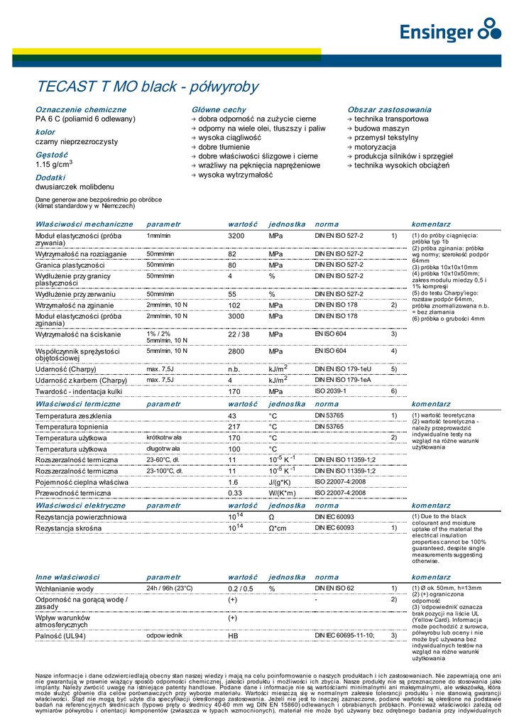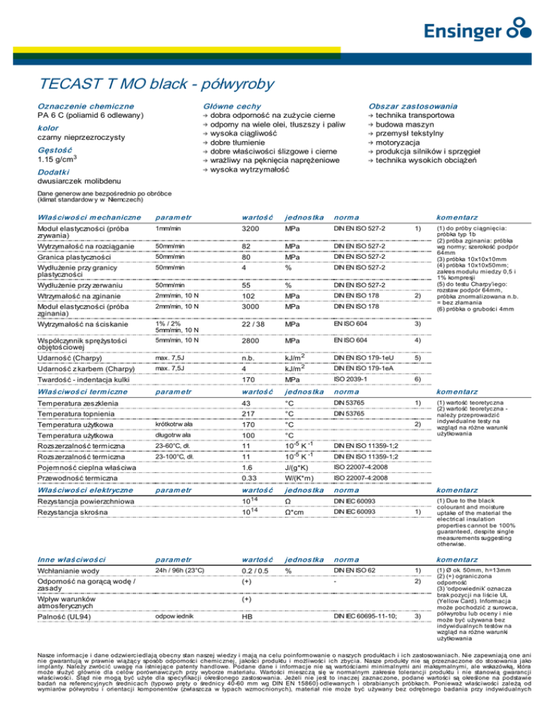 TECAST T MO black - półwyroby Oz nac z enie c hemic z ne PA 6 C (poliamid 6 odlewany) Główne c ec hy dobra odporność na zużycie cierne odporny na wiele olei, tłuszszy i paliw wysoka ciągliwość dobre tłumienie dobre właściwości ślizgowe i cierne wrażliwy na pęknięcia naprężeniowe wysoka wytrzymałość k olor czarny nieprzezroczysty Gęs t oś ć 1.15 g/cm3 Dodat k i dwusiarczek molibdenu Obs z ar z as t os owania technika transportowa budowa maszyn przemysł tekstylny motoryzacja produkcja silników i sprzęgieł technika wysokich obciążeń Dane generow ane bezpośrednio po obróbce (klimat standardow y w Niemczech) Wł a ś ci w o ś ci m e ch a n i czn e p a ra m e tr Moduł elastyczności (próba zrywania) 1mm/min Wytrzymałość na rozciąganie Granica plastyczności j e d n o s tka n o rm a 3200 MPa DIN EN ISO 527-2 50mm/min 82 MPa DIN EN ISO 527-2 50mm/min 80 MPa DIN EN ISO 527-2 Wydłużenie przy granicy plastyczności 50mm/min 4 % DIN EN ISO 527-2 Wydłużenie przy zerwaniu 50mm/min 55 % DIN EN ISO 527-2 Wtrzymałość na zginanie 2mm/min, 10 N 102 MPa DIN EN ISO 178 Moduł elastyczności (próba zginania) 2mm/min, 10 N 3000 MPa DIN EN ISO 178 Wytrzymałość na ściskanie 1% / 2% 5mm/min, 10 N 22 / 38 MPa EN ISO 604 3) Współczynnik sprężystości objętościowej 5mm/min, 10 N 2800 MPa EN ISO 604 4) Udarność (Charpy) max. 7,5J n.b. kJ/m 2 DIN EN ISO 179-1eU 5) Udarność z karbem (Charpy) max. 7,5J 4 kJ/m 2 DIN EN ISO 179-1eA 170 MPa ISO 2039-1 w a rto ś ć j e d n o s tka n o rm a 43 °C DIN 53765 DIN 53765 Twardość - indentacja kulki Wł a ś ci w o ś ci te rm i czn e p a ra m e tr Temperatura zeszklenia Temperatura topnienia w a rto ś ć 217 °C Temperatura użytkowa krótkotrw ała 170 °C Temperatura użytkowa długotrw ała 100 °C Rozszerzalność termiczna 23-60°C, dł. 11 10 -5 K -1 DIN EN ISO 11359-1;2 DIN EN ISO 11359-1;2 11 Pojemność cieplna właściwa 1.6 J/(g*K) ISO 22007-4:2008 Przewodność termiczna 0.33 W/(K*m) ISO 22007-4:2008 Wł a ś ci w o ś ci e l e ktryczn e 23-100°C, dł. p a ra m e tr 2) w a rto ś ć j e d n o s tka n o rm a Rezystancja powierzchniowa 10 14 Ω DIN IEC 60093 Rezystancja skrośna 10 14 Ω*cm DIN IEC 60093 ko m e n ta rz 1) 1) p a ra m e tr w a rto ś ć j e d n o s tka n o rm a Wchłanianie wody 24h / 96h (23°C) 0.2 / 0.5 % DIN EN ISO 62 1) - 2) DIN IEC 60695-11-10; 3) (+) Wpływ warunków atmosferycznych (+) Palność (UL94) odpow iednik HB (1) wartość teoretyc zna (2) wartość teoretyc zna należy przeprowadzić indywidualne testy na wzgląd na różne warunki użytkowania ko m e n ta rz In n e w ł a ś ci w o ś ci Odporność na gorącą wodę / zasady (1) do próby c iągnięc ia: próbka typ 1b (2) próba zginania: próbka wg normy; szerokość podpór 64mm (3) próbka 10x10x10mm (4) próbka 10x10x50mm; zakres modułu miedzy 0,5 i 1% kompresji (5) do testu Charpy’iego: rozstaw podpór 64mm, próbka znormalizowana n.b. = bez złamania (6) próbka o grubośc i 4mm 6) 2) 10 -5 K -1 Rozszerzalność termiczna ko m e n ta rz 1) (1) Due to the blac k c olourant and moisture uptake of the material the elec tric al insulation properties c annot be 100% guaranteed, despite single measurements suggesting otherwise. ko m e n ta rz (1) Ø ok. 50mm, h=13mm (2) (+) ogranic zona odporność (3) ‘odpowiednik’ oznac za brak pozyc ji na liśc ie UL (Yellow Card). Informac ja może poc hodzić z surowc a, półwyrobu lub oc eny i nie może być używana bez indywidualnyc h testów na wzgląd na różne warunki użytkowania Nasze informac je i dane odzwierc iedlają obec ny stan naszej wiedzy i mają na c elu poinformowanie o naszyc h produktac h i ic h zastosowaniac h. Nie zapewniają one ani nie gwarantują w prawnie wiążąc y sposób odpornośc i c hemic znej, jakośc i produktu i możliwośc i ic h zbyc ia. Nasze produkty nie są przeznac zone do stosowania jako implanty. Należy zwróc ić uwagę na istniejąc e patenty handlowe. Podane dane i informac je nie są wartośc iami minimalnymi ani maksymalnymi, ale wskazówką, która może służyć głównie dla c elów porównawc zyc h przy wyborze materiału. Wartośc i mieszc zą się w normalnym zakresie toleranc ji produktu i nie stanowią gwaranc ji właśc iwośc i. Stąd nie mogą być użyte dla spec yfikac ji określonego zastosowania. Jeżeli nie jest to inac zej zaznac zone, podane wartośc i są określone na podstawie badań na referenc yjnyc h średnic ac h (typowo pręty o średnic y 40-60 mm wg DIN EN 15860) odlewanyc h i obrabianyc h próbkac h. Ponieważ właśc iwośc i zależą od wymiarów półwyrobu i orientac ji komponentów (zwłaszc za w typac h wzmoc nionyc h), materiał nie może być używany bez odrębnego badania przy indywidualnyc h warunkac h Karty materiałowe podlegają okresowemu przeglądowi. Najbardziej aktualne wersje można znaleźć na stronie internetowej www.ensinger-online.c om. Zmiany tec hnic zne zastrzeżone. Ensinger Polska Sp.z o.o. ul. Geodetów 2 64-100 Leszno Tel +48 65 529 5810 Fax +48 65 529 5811 w w w .ensinger.pl Data: 2011/11/29 Wersja: AA