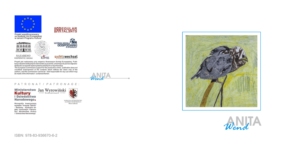 Prezentacja projektu Irregular Talents to dwuletni projekt z zakresu kultury (2013-2015) dofinansowany przez EACEA w ramach Programu Kultura 2007-2013. Jest on realizowany przez konsorcjum składające się z partnerów europejskich: Nazareno Societa Cooperativa Sociale (Nazareno-Włochy), Międzynarodowe Centrum Zarządzania Informacją The International Center for Information Management Systems and Services (ICIMSS - Polska), Wyższa Szkoła Gospodarki w Bydgoszczy (WSG-Poland), Verein Integrative Kulturarbeit (VIK-Austria). Celem Irregular Talents jest stworzenie możliwości naukowej oceny wartości artystycznych dokonań dwunastu artystów, którym los mniej sprzyjał. Ich prace poddane zostały ocenie ze względu na ich walory artystyczne, nie ze względu na historie ich twórców. W trakcie trwania projektu eksperci z Austrii, Polski i Włoch zajmowali się selekcją i analizą prac wyb- Presentation of the project Irregular Talents is a two-year intercultural project (20132015), co-financed by EACEA under the Programme Culture 2007-2013. It is organized by a consortium of European partners made by: Nazareno Societa Cooperativa Sociale (Nazareno-Italy), Międzynarodowe Centrum Zarządzania Informacją The International Center for Information Management Systems and Services (ICIMSS Poland), Wyższa Szkoła Gospodarki w Bydgoszczy (WSG-Poland), Verein Integrative Kulturarbeit (VIKAustria). Irregular Talents aims to create the opportunity for twelve so called “irregular artists” to be studied from a scientific point of view, with artistic criteria. ranych artystów. Efektem tych działań są monografie prezentujące wieloaspektowe dokonania każdego z artystów. Jednocześnie, pod kierunkiem koordynatora eksperci pracowali nad przygotowaniem wystawy, której ekspozycje zaplanowano we Włoszech, Polsce i Austrii. Na wystawach tych prezentowane są dzieła wybranych zgodnie z kryteriami projektu artystów, którym towarzyszą prace twórców z uznanymi już osiągnięciami. Ideą przewodnią było nawiązanie dialogu między artystami, których dzieła korespondują ze sobą bez względu na doświadczenia autorów czy jakiekolwiek ograniczenia. Projekt skupia się bowiem na wartości artystycznej prac, stwarzając pośrednio autentyczną możliwość międzykulturowego włączenia społecznego. Projekt został objęty opieką kuratorską następujących ekspertów: Luca Farulli (Włochy), Alicja SaarKozłowska (Polska), Peter Assmann (Austria) (Tłumaczenie / Translation Maria Śliwińska) Their work has been taken into consideration because of its artistic value, and not for the stories of their authors. During the project, in Austria, Poland and Italy art experts select and study the artworks of these artists in order to realize a monograph about the poetic of every artists. At the same time, the art experts, under the supervision of the coordinator, have worked at the organization of the itinerant art exhibition, which is expected to move from Italy to Poland and to Austria, showing the works of the selected artist, together with the artworks of other wellknown artists. The idea is to create a dialogue among all these artists on the same theme, no matters the story of the authors or the initial limitation of someone. The focus is on the artistic value itself which, of course, indirectly creates an authentic opportunity for intercultural social inclusion. The curatorship of the project is entrusted to the following experts: Luca Farulli (Italy), Alicja Saar-Kozlowska (Poland), Peter Assmann (Austria) Międzynarodowe Centrum Zarządzania Informacją The International Center for Information Management Systems and Services T O R U Ń 2 0 1 5 Barbara Momot, Anna Szary: Anita WEND – „ w Pracowni mogłam się twórczo rozwijać” Anita Wend „The Laboratory enabled me to develop my creativity" 2 Alicja Saar-Kozłowska Anity Wend świat ruszony z posad Anita Wend's world set in motion 20 Udział w wystawach Participation in exhibition 38 Katalog Works 41 Anita WEND – „ w Pracowni mogłam się twórczo rozwijać” by Barbara Momot and Anna Szary Anita Wend „The Laboratory enabled me to develop my creativity" 2 1 Lubię rysować i malować, To moja pasja, Że umiem rysować i malować to jest racja Kiedy się skończyło zawodówkę, To się rysowało i malowało ciurkiem, I też w domu kiedy czas się miało, A rysowałam zwierzęta, ludzi i drzewa, Odkąd pamiętam, Krajobrazy, na płótnie obrazy, Też na dużej kartce zamki lub pejzaże, Lubię sztukę i się nią interesuję, I też interesują mnie malarze, Przy rysowaniu trzeba się skupić, Czasem muszę nowe fajne kredki kupić, Albo farby plakatowe, Żeby powstały piękne prace kolorowe, Ale lepiej i ciekawiej, Tłustą pastelą np. szarością i bielą, Rysowanie węglem rysunkowym Rysunek nie musi być kolorowy, Rysunek też ołówkiem, Trzeba mieć tylko dobrą temperówkę. (Anita Wend) I enjoy painting and drawing This is my passion When I graduated vocational school I drew and painted at a stretch When I had some time at home I drew animals, men and plants Ever since I remember Landscapes and pictures on canvas Big-format landscapes and castles I love art and I keen on it Painters do interest me as well When I draw I need to focus Sometimes buy some new wicked crayons Or maybe poster paints So my works are colorful But it is better and interesting Using greasy pastel, grey and white Using drawing coal Drawing does not need to be colorful In order to draw with pencil All you need is a fine sharpener Biografia Anita Wend urodziła się 3maja 1982 roku. Do 2010 roku mieszkała w Toruniu razem z rodzicami i dwojgiem rodzeństwa. Obecnie mieszka w Tucznie k. Inowrocławia. Ukończyła szkołę podstawową, następnie specjalną szkołę zawodową o profilu gastronomicznym. Mimo zdobycia zawodu nie pracowała, bo w sytuacji niepełnosprawności nie było łatwo uzyskać zatrudnienie. Nadal jeszcze, chociaż istnie
