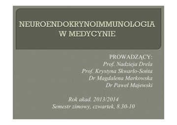 PROWADZĄCY: Prof. Nadzieja Drela Prof. Krystyna Skwarło-Sońta Dr Magdalena Markowska Dr Paweł Majewski Rok akad. 2013/2014 Semestr zimowy, czwartek, 8.30-10 Tydzień Data Temat wykładu Prowadz 1 03.10.13 Podstawy funkcjonowania układu odpornościowego i neuroendokrynowego - mechanizmy odbioru i przekazywania informacji przez układ odpornościowy i neuroendokrynowy KSS 2 10.10.13 Neuroendokrynoimmunologia: nowa dziedzina badań interdyscyplinarnych - podstawowe szlaki komunikacji między układem odpornościowym i neuroendokrynowym, rola neuroprzekaźników, neuropeptydów, hormonów i cytokin w przekazywaniu informacji między układami i regulacji aktywności układu odpornościowego KSS 3 17.10.13 OUN w rozwoju i regulacji układu odpornościowego. Rola głównych osi regulacyjnych: HPA, HPG i HPT. podwzgórze-przysadka nadnercza, Prezentacja antygenów w ośrodkowym układzie nerwowym: weryfikacja poglądów o immunologicznym uprzywilejowaniu mózgu KSS 4 24.10.13 Rola regulacji neuroendokrynowej w utrzymywaniu homeostazy w układzie odpornościowym w warunkach zależnych i niezależnych od aktywacji antygenowej. Udział hormonów, neuroprzekaźników, neuropeptydów i cytokin w utrzymaniu homeostazy układu odpornościowego i tolerancji na własne antygeny w warunkach niezależnych od antygenów obcych oraz w przebiegu infekcji ND 5 31.10.13 Stan zapalny: rola w rozwoju prawidłowej odpowiedzi immunologicznej, regulacja przez układ neuroendokrynowy, chroniczny stan zapalny. Charakterystyka stanu zapalnego i jego rola w rozwoju prawidłowej i patologicznej odpowiedzi immunologicznej (przykłady chorób związanych z chronicznym stanem zapalnym) PM 6 07.11.13 Odpowiedź organizmu na stres – wpływ stresu na odpowiedź immunologiczną. Definicja stresu i przebieg reakcji stresowej, skutki działania stresu ostrego i chronicznego na odporność MM 7 14.11.13 Rola hormonów w aktywności układu odpornościowego w przebiegu ciąży. Zmiany profilu hormonalnego w przebiegu ciąży, przydatność parametrów immunologicznych do śledzenia prawidłowości przebiegu ciąży, rola hormonów i cytokin w regulacji odporności w przebiegu ciąży ND 8 21.11.13 Plastyczność interakcji między układem odpornościowym i neuroendokrynowym, ich rola w patogenezie stanu zapalnego i chorób związanych z chronicznym stresem. Interakcje układu neuroendokrynowego i odpornościowego w życiu płodowym i noworodkowym i ich skutki w odporności w życiu dorosłym MM 9 28.11.13 Regulacja neuroendokrynowa w chorobach infekcyjnych, alergii, chorobach autoimmunizacyjnych i nowotworowych, wpływ zmian okołodobowych i sezonowych aktywności układu odpornościowego na objawy kliniczne chorób MM 10 5.12.13 Rola zegara biologicznego w synchronizacji procesów odpornościowych: rytmy biologiczne w organizmie człowieka, rozwój rytmów okołodobowych u człowieka, rola hormonów w dobowych zmianach zachodzących w układzie odpornościowym KSS 11 12.12.13 Interakcje między układem odpornościowym i neuroendokrynowym w przebiegu starzenia: przejawy i mechanizmy starzenia się układu odpornościowego, osie HPG i HPA w regulacji mechanizmów odpornościowych w procesie starzenia ND 12 19.12.13 Modelowe oddziaływania między układem neuroendokrynowym i odpornościowym. Rozwój psychoneuroimmunologii, najczęściej stosowane modele doświadczalne in vitro oraz z wykorzystaniem zwierząt laboratoryjnych, układ odpornościowy w depresji PM 13 09.01.14 Metody badania zmian zachodzących w układzie odpornościowym pod wpływem hormonów, neuroprzekaźników i neuropeptydów. Testy biologiczne w badaniach laboratoryjnych i diagnostyce klinicznej ND 14 16.01.14 Wykorzystanie syntetycznych hormonów w terapii chorób alergicznych, autoimmunizacyjnych oraz związanych z chronicznym stanem zapalnym. Syntetyczne glukokortykoidy: mechanizm działania, wrażliwość na glukokortykoidy zależna od wieku i płci ND 15 23.01.14 Najnowsze problemy neuroendokrynoimmunologii. Osiągnięcia i postępy w dziedzinie neuroendokrynoimmunologii i psychoneuroimmunologii PM 16 30.01.14 Egzamin pisemny Krystyna Skwarło-Sońta Zakład Fizjologii Zwierząt [email protected] Wykład 1., 3.10.2013 Wykład 2., 10.10.2013 HEMATOLOGIA – NAUKA O KRWI I O CHOROBACH KRWI Bursa Fabrycjusza lub jej odpowiednik Grasica Limfocyty T Limfocyty B Odpowiedź humoralna Odpowiedź komórkowa Szpik kostny linia mieloidalna komórki pnia linia limfoidalna (ukierunkowanie) POCHODZENIE LIMFOCYTÓW BiT (dojrzewanie) prekursor LiT dojrzały LiB grasica kontakt z antygenem wtórne narządy limfoidalne komórki plazmatyczne przeciwciała kontakt z antygenem (dojrzewanie) dojrzały LiTh dojrzały LiTc kontakt z antygenem limfocyt w mikroskopie świetlnym limfocyt cytotoksyczny w mikroskopie skaningowym limfocyt B w mikroskopie elektronowym Działanie komórek odpornościowych własne tkanki własne własne Obce MHC klasy I występują na powierzchni wszystkich komórek w organizmie prezentują antygeny pochodzenia endogennego np. białka wirusowe lub zmienione białka własne współdziałają z limfocytami Tc MHC klasy II występują na powierzchni komórek prezentujących antygen (APC) prezentują antygeny pochodzenia egzogennego współdziałają z limfocytami Th Pierwotnie: substancja powodująca powstawanie przeciwciał (ang. antibody generating) Obecnie: czynniki wywołujące aktywację układu odpornościowego, czyli takie (nonself), przeciw którym kierowana jest odpowiedź odpornościowa Epitopy albo determinanty antygenowe to struktury powierzchniowe antygenu, odpowiedzialne za immunogenność antygenu Niekompletne antygeny to hapteny Pierwotne narządy (gruczoły) limfoidalne: grasica i szpik kostny (analog bursy Fabrycjusza ) – ŚRODOWISKO DOJRZEWANIA LIMFOCYTÓW Wtórne narządy (gruczoły) limfoidalne: śledziona, węzły i grudki chłonne – MIEJSCA KONTAKTU LIMFOCYTÓW Z ANTYGENAMI Komórki odpornościowe: leukocyty i produkowane pr