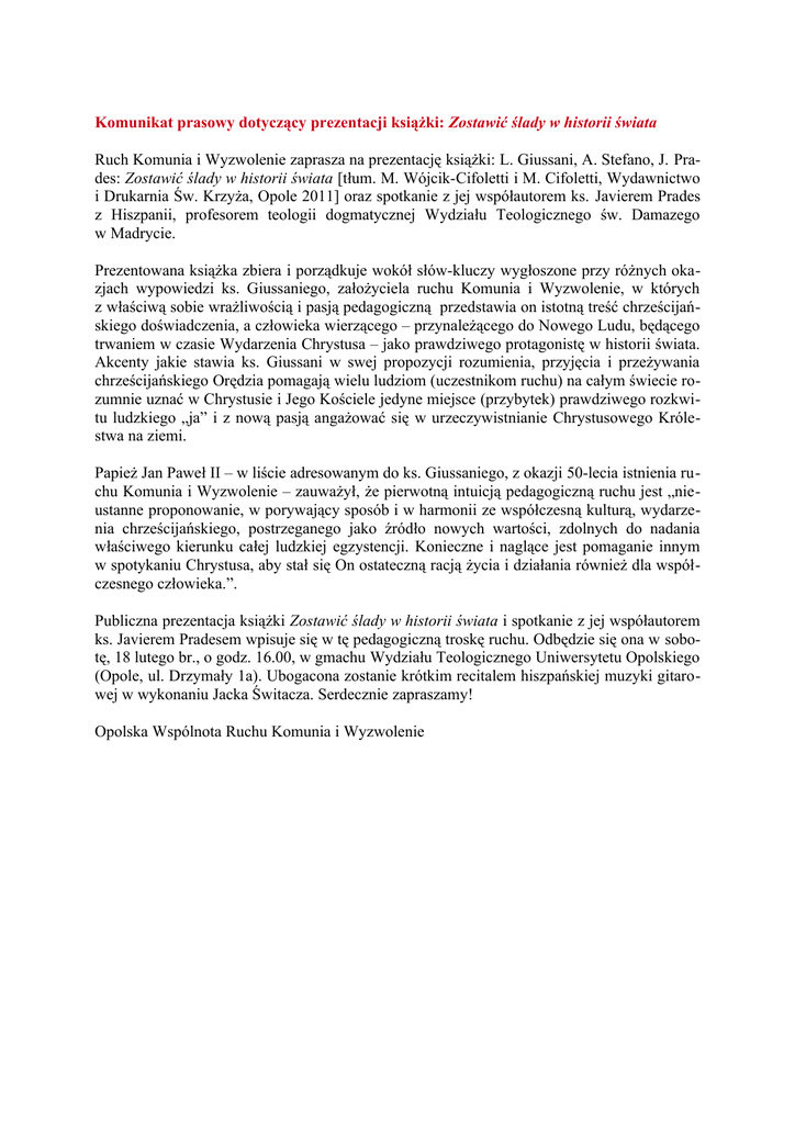 Komunikat prasowy dotyczący prezentacji książki: Zostawić ślady w historii świata Ruch Komunia i Wyzwolenie zaprasza na prezentację książki: L. Giussani, A. Stefano, J. Pra des: Zostawić ślady w historii świata [tłum. M. WójcikCifoletti i M. Cifoletti, Wydawnictwo i Drukarnia Św. Krzyża, Opole 2011] oraz spotkanie z jej współautorem ks. Javierem Prades z Hiszpanii, profesorem teologii dogmatycznej Wydziału Teologicznego św. Damazego w Madrycie. Prezentowana książka zbiera i porządkuje wokół słówkluczy wygłoszone przy różnych oka zjach wypowiedzi ks. Giussaniego, założyciela ruchu Komunia i Wyzwolenie, w których z właściwą sobie wrażliwością i pasją pedagogiczną przedstawia on istotną treść chrześcijań skiego doświadczenia, a człowieka wierzącego – przynależącego do Nowego Ludu, będącego trwaniem w czasie Wydarzenia Chrystusa – jako prawdziwego protagonistę w historii świata. Akcenty jakie stawia ks. Giussani w swej propozycji rozumienia, przyjęcia i przeżywania chrześcijańskiego Orędzia pomagają wielu ludziom (uczestnikom ruchu) na całym świecie ro zumnie uznać w Chrystusie i Jego Kościele jedyne miejsce (przybytek) prawdziwego rozkwi tu ludzkiego „ja” i z nową pasją angażować się w urzeczywistnianie Chrystusowego Króle stwa na ziemi. Papież Jan Paweł II – w liście adresowanym do ks. Giussaniego, z okazji 50lecia istnienia ru chu Komunia i Wyzwolenie – zauważył, że pierwotną intuicją pedagogiczną ruchu jest „nie ustanne proponowanie, w porywający sposób i w harmonii ze współczesną kulturą, wydarze nia chrześcijańskiego, postrzeganego jako źródło nowych wartości, zdolnych do nadania właściwego kierunku całej ludzkiej egzystencji. Konieczne i naglące jest pomaganie innym w spotykaniu Chrystusa, aby stał się On ostateczną racją życia i działania również dla współ czesnego człowieka.”. Publiczna prezentacja książki Zostawić ślady w historii świata i spotkanie z jej współautorem ks. Javierem Pradesem wpisuje się w tę pedagogiczną troskę ruchu. Odbędzie się ona w sobo tę, 18 lutego br., o godz. 16.00, w gmachu Wydziału Teologicznego Uniwersytetu Opolskiego (Opole, ul. Drzymały 1a). Ubogacona zostanie krótkim recitalem hiszpańskiej muzyki gitaro wej w wykonaniu Jacka Świtacza. Serdecznie zapraszamy! Opolska Wspólnota Ruchu Komunia i Wyzwolenie