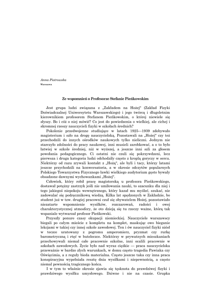 Anna Piotrowska Warszawa Ze wspomnień o Profesorze Stefanie Pieńkowskim Jest grupa ludzi związana z „Zakładem na Hożej" (Zakład Fizyki Doświadczalnej Uniwersytetu Warszawskiego) i jego twórcą i długoletnim kierownikiem profesorem Stefanem Pieńkowskim, o której niewiele się słyszy. Bo i cóż o niej mówić? Co jest do powiedzenia o wielkiej, ale cichej i skromnej rzeszy nauczycieli fizyki w szkołach średnich? Pokolenie przedwojenne studiujące w latach 1925—1939 zdobywało magisterium i szło na drogę nauczycielską. Pozostawali na „Hożej" czy też przechodzili do innych ośrodków naukowych tylko nieliczni. Jednym nie starczyło zdolności do pracy naukowej, inni musieli zarobkować, a o to było łatwiej w szkole średniej, niż w wyższej, a jeszcze inni szli za głosem powołania pedagogicznego. Ci ostatni nie czuli się pokrzywdzeni, lecz pierwsza i druga kategoria ludzi odchodziły często z kroplą goryczy w sercu. Niektórzy od razu zrywali kontakt z „Hożą", ale byli i tacy, którzy latami jeszcze przychodzili na konwersatoria, a w okresie odczytów popularnych Polskiego Towarzystwa Fizycznego ławki wielkiego audytorium gęsto bywały obsadzone dawnymi wychowankami „Hożej". Człowiek, który robił pracę magisterską u profesora Pieńkowskiego, dostawał potężny zastrzyk jeśli nie umiłowania nauki, to szacunku dla niej i tego jakiegoś niepokoju wewnętrznego, który kazał mu myśleć, szukać, nie zadowalać się podręcznikową wiedzą. Kilka lat spędzonych w Zakładzie, bo student już w tzw. drugiej pracowni czuł się obywatelem Hożej, pozostawiało niezatarte wspomnienie wysiłków, rozczarowań, radości i owej charakterystycznej atmosfery, że oto dzieją się tu rzeczy ważne, którą tak wspaniale wytwarzał profesor Pieńkowski. Przyszły ponure czasy okupacji niemieckiej. Nauczyciele warszawscy biegali po całym mieście z kompletu na komplet, maskując owo bieganie lekcjami w takiej czy innej szkole zawodowej. Ten i ów nauczyciel fizyki niósł w teczce uratowany z pogromu amperomierz, pryzmat czy rurkę barometryczną i rtęć w buteleczce. Niektórzy w prywatnych mieszkaniach przechowywali niemal całe pracownie szkolne, inni ocalili pracownie w szkołach zawodowych. Życie było nad wyraz ciężkie — praca nauczycielska przeważnie w bardzo złych warunkach, w domu często tragedia Pawiaka czy Oświęcimia, a z reguły bieda materialna. Często jeszcze taka czy inna praca konspiracyjna wypełniała resztę dnia wysiłkami i niepewnością, a często niemal pewnością tragicznego końca. I w tym to właśnie okresie zjawia się tęsknota do prawdziwej fizyki i prawdziwego wysiłku umysłowego. Dziwne i nie na czasie. Grupka 2 A. PIOTROWSKA nauczycielek, wychowanek „Hożej", zwraca się do profesora Pieńkowskiego z prośbą o wykłady o nowych zdobyczach fizyki na nauczycielskim komplecie. Wykłady oczywiście będą płatne, jak wiele wykładów profesorów wyższych uczelni w owym czasie — słuchaczki są gotowe zdobyć się na ten wysiłek finansowy. Profesor inicjatywę podchwytuje, ale projekt zmienia w sposób zasadniczy i niezmiernie dla jego stylu charakterystyczny. Nie wykłady, ale seminarium, na którym uczestnicy sami będą referować zagadnienia przez Profesora wysunięte i przy jego pomocy przygotowane. O żadnych „honorariach" nie może być mowy. Następuje konsternacja: łatwiej zdobyć parę złotych, niż czas na samodzielną poważną robotę, z którą większość od dłuższego czasu nie miała do czynienia. Że ta robota musi być poważna nikt nie ma wątpliwości — przecież przed profesorem nie można się „kompromitować". Ten i ów wycofuje się, ale grupa 6 osób (5 kobiet i 1 mężczyzna) tworzy zespół, który w ciągu blisko 2 lat pracuje w tym samym składzie i niemal zawsze w pełnym składzie na zebraniach. Przygotowanie referatów nie było rzeczą łatwą — przede wszystkim zasadniczą trudność stanowił brak bibliotek, a więc dostępu do źródeł. Profesor dawał swoje książki i czasopisma, które zdołał ocalić, a niekiedy mówił: „To by powinien mieć ... ten i ten — niech się pani dowie". Rozpoczynałyśmy poszukiwania, atakując ludzi znanych lub nieznanych bezpośrednio, posługując się wspólnymi znajomymi. Nie mogliśmy powoływać się na prof. Pieńkowskiego, bo przecież całe życie polskie było jedną wielką konspiracją i seminarium tego rodzaju należało również do przestępstw pohtycznych. Ten i ów uśmiechał się pobłażliwie i tłumaczył, że do pracy naukowej potrzebne są warunki, których nie ma obecnie, ale byli i tacy, którzy nie pytając wiele wyciągali co mieli i dawali z zaufaniem w ręce mało znanego człowieka. Pozostała mi we wspomnieniach wizyta u znanego chemika prof. Zawadzkiego, dziś już nie żyjącego, który z prostotą i życzliwością powiedział: „Nie mogę dać pani tej książki do domu, bo sam z niej stale korzystam, ale niech pani przychodzi tu do mnie, to będziemy razem pracować nie przeszkadzając sobie nawzajem". Czytaliśmy w tramwaju, w zimnym mieszkaniu czekając na zbierający się komplet uczniów. Robiliśmy tablice i wykresy (np. węglem na papierze pakowym, co okazało się dobrym sposobem i przyjęło się tu i ówdzie po okupacji), no i denerwowaliśmy się przed referatem. Trudno już dziś odtworzyć pełną listę referatów. Podaję zestawienie tych tematów, które udało się zebrać: 1. Metody rozdzielania izotopów, 2. Współczesne poglądy na zjawiska ferromagnetyczne (referowane na 2 zebraniach), 3. Nadsubtelna budowa widm fluorescencji, 4. Fosforescencja kryształów, 5. Promieniowanie kwadrupolowe, WSPOMNIENIE O PROFESORZE PIEŃKOWSKIM 3 6. Budowa warstw powierzchniowych, 7. Ultradźwięki (referowane na 2 zebraniach), 8. Rozszczepienie jądra — nowe pierwiastki. Zebranie w gabinecie Profesora na Hożej było odświętnym wydarzeniem w naszym twardym życiu: przestro