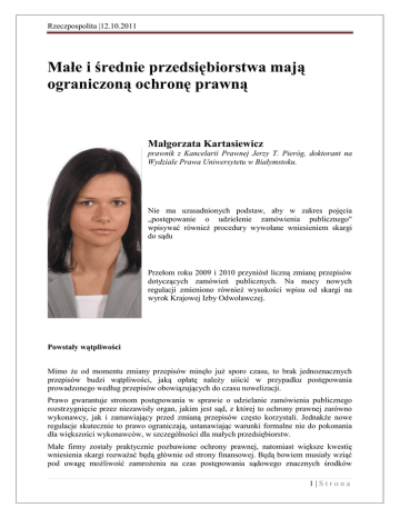 Rzeczpospolita |12.10.2011 Małe i średnie przedsiębiorstwa mają ograniczoną ochronę prawną Małgorzata Kartasiewicz prawnik z Kancelarii Prawnej Jerzy T. Pieróg, doktorant na Wydziale Prawa Uniwersytetu w Białymstoku. Nie ma uzasadnionych podstaw, aby w zakres pojęcia „postępowanie o udzielenie zamówienia publicznego" wpisywać również procedury wywołane wniesieniem skargi do sądu Przełom roku 2009 i 2010 przyniósł liczną zmianę przepisów dotyczących zamówień publicznych. Na mocy nowych regulacji zmieniono również wysokości wpisu od skargi na wyrok Krajowej Izby Odwoławczej. Powstały wątpliwości Mimo że od momentu zmiany przepisów minęło już sporo czasu, to brak jednoznacznych przepisów budzi wątpliwości, jaką opłatę należy uiścić w przypadku postępowania prowadzonego według przepisów obowiązujących do czasu nowelizacji. Prawo gwarantuje stronom postępowania w sprawie o udzielanie zamówienia publicznego rozstrzygnięcie przez niezawisły organ, jakim jest sąd, z której to ochrony prawnej zarówno wykonawcy, jak i zamawiający przed zmianą przepisów często korzystali. Jednakże nowe regulacje skutecznie to prawo ograniczają, ustanawiając warunki formalne nie do pokonania dla większości wykonawców, w szczególności dla małych przedsiębiorstw. Małe firmy zostały praktycznie pozbawione ochrony prawnej, natomiast większe kwestię wniesienia skargi rozważać będą głównie od strony finansowej. Będą bowiem musiały wziąć pod uwagę możliwość zamrożenia na czas postępowania sądowego znacznych środków 1|Strona Rzeczpospolita |12.10.2011 finansowych, również liczyć się z ewentualną przegraną, co wiąże się z utratą kilkuset tysięcy a niekiedy kilku milionów złotych. W większości przypadków wykonawca nie zdecyduje się na podjęcie ryzyka wniesienia skargi do sądu, bo będzie przerażony wielkością wpisu. Z uwagi na tak duże opłaty wśród wykonawców starających się o uzyskanie zamówienia publicznego wszczętego jeszcze przed zmianą przepisów pojawiały się pytania, które przepisy należy stosować. Brak precyzyjnej regulacji otworzył furtkę do obejścia nowej opłaty. Przepis art. 3 ust. 1 ustawy z 5 listopada 2009 o zmianie ustawy Prawo zamówień publicznych oraz ustawy o kosztach sądowych w sprawach cywilnych (DzU z 2009 r. nr 206, poz. 1591; nowelizacja pzp z 5 listopada 2009), która weszła w życie 22 grudnia 2009, wprowadził zapis, że do postępowań o udzielenie zamówienia publicznego oraz konkursów wszczętych przed dniem wejścia w życie niniejszej ustawy stosuje się przepisy dotychczasowe. Wnioskować więc można, że wysokość opłaty od skargi wnoszonej na wyrok KIO ustalana powinna być według przepisu art. 34 ust. 2 ustawy z 28 lipca 2005 o kosztach sadowych w sprawach cywilnych (tekst jedn. DzU z 2010 r. nr 90, poz. 594; ustawa o kosztach) w brzmieniu obowiązującym przed 22 grudnia 2009. Rozbieżne orzeczenia W doktrynie przez długi, niestety, czas wykładnia tego przepisu nie była do końca jednoznaczna, a samo orzecznictwo w tym zakresie skrajnie rozbieżne. Część sądów stała na stanowisku, że wniesienie skargi należy do czynności postępowania przed sądem, a nie do czynności w ramach postępowania o udzielenie zamówienia publicznego. Argumentacja odnosiła się do definicji „postępowania o udzielenie zamówienia publicznego” zawartej w art. 2 pkt 7a ustawy z 29 stycznia 2004 Prawo zamówień publicznych (tekst jedn. DzU z 2010 r. nr 113, poz. 759 z późn. zm.; ustawa pzp). Zgodnie z nim postępowanie w sprawie o udzielenie zamówienia publicznego kończy się wraz z wyborem najkorzystniejszej oferty, a jego początkiem jest publiczne ogłoszenie lub przesłanie zaproszenia do wykonawcy. Tak określone ramy procedury o udzielenie zamówienia publicznego dotyczą czynności związanych z wyborem najkorzystniejszej oferty, natomiast wniesienie skargi do sądu powszechnego służy jedynie skontrolowaniu prawidłowości wyroku wydawanego przez KIO i, mimo że dotyczy ona prowadzonego przez zamawiającego postępowania o udzielenie zamówienia publicznego, sama do postępowania tego nie należy. Nasuwał się więc wniosek, że do czynności wniesienia i opłacenia skargi stosować należy przepisy ustawy o kosztach sądowych w sprawach cywilnych w brzmieniu nowym, ustalonym w nowelizacji pzp z 5 listopada 2009. Stanowisko to potwierdzało postanowienie Sądu Okręgowego w Warszawie V Wydział Cywilny – Odwoławczy z 13 maja 2010 (V Ca 719/10), w którym stwierdził jednoznacznie, że powoływany przepis art. 3 ust. 1 nowelizacji pzp z 5 listopada 2009 nie dotyczy zmiany wprowadzonej w ustawie o kosztach. Jednak jak wskazuje praktyka, wnosząc do sądu skargę na wyrok KIO dotyczący postępowań o zamówienie publiczne wszczętych przed wejściem w życie nowelizacji pzp z 5 listopada 2009 wykonawcy nadal posiłkując się szeroką wykładnią przepisu art. 3 ust. 1 tej ustawy, stosowali przepisy poprzednie, wnosząc opłatę od skargi w wysokości 3 tys. zł. I pomimo 2|Strona Rzeczpospolita |12.10.2011 podnoszenia zarzutu braku możliwości stosowania tego przepisu sądy niejednokrotnie w rozstrzygnięciach nie uwzględniały ich, przyjmując opłatę w tej wysokości za prawidłową. W praktyce odrzucenie skargi ze względu na nienależycie dokonany wpis raczej nie miało miejsca. Wręcz przeciwnie, sądy stały na stanowisku, że do postępowań wszczętych przed datą wejścia w życie przepisów ustawy zmieniającej zastosowanie mają przepisy poprzednie, co oznacza, że należna od skargi opłata wynosi 3 tys. zł. Podstawę argumentacji stanowił pogląd, że co prawda ustawa pzp w art. 2 ust. 7a zamieszcza definicję postępowania o udzielenie zamówienia publicznego, to jest to jedynie określenie początku postępowania, a nie jego zakończenie. Postępowanie sądowe jest bowiem kontynuacją postępowania o zamówienie publ