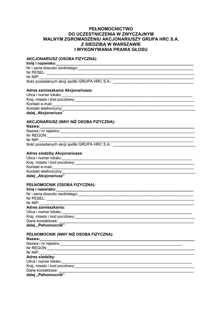 PEŁNOMOCNICTWO DO UCZESTNICZENIA W ZWYCZAJNYM WALNYM ZGROMADZENIU AKCJONARIUSZY GRUPA HRC S.A. Z SIEDZIBĄ W WARSZAWIE I WYKONYWANIA PRAWA GŁOSU AKCJONARIUSZ (OSOBA FIZYCZNA): Imię i nazwisko:_______________________________________________________________ Nr i seria dowodu osobistego:_____________________________________________________ Nr PESEL: ____________________________________________________________________ Nr NIP:_______________________________________________________________________ Ilość posiadanych akcji spółki GRUPA HRC S.A.: _____________________________________ Adres zamieszkania Akcjonariusza: Ulica i numer lokalu:____________________________________________________________ Kraj, miasto i kod pocztowy:_______________________________________________________ Kontakt e-mail:_________________________________________________________________ Kontakt telefoniczny:_____________________________________________________________ dalej „Akcjonariusz” AKCJONARIUSZ (INNY NIŻ OSOBA FIZYCZNA): Nazwa:_______________________________________________________________________ Nazwa i nr rejestru:______________________________________________________________ Nr REGON:____________________________________________________________________ Nr NIP:_______________________________________________________________________ Ilość posiadanych akcji spółki GRUPA HRC S.A.: ______________________________________ Adres siedziby Akcjonariusza: Ulica i numer lokalu:____________________________________________________________ Kraj, miasto i kod pocztowy:_______________________________________________________ Kontakt e-mail:_________________________________________________________________ Kontakt telefoniczny:_____________________________________________________________ dalej „Akcjonariusz” PEŁNOMOCNIK (OSOBA FIZYCZNA): Imię i nazwisko:_______________________________________________________________ Nr i seria dowodu osobistego:_____________________________________________________ Nr PESEL: ____________________________________________________________________ Nr NIP:_______________________________________________________________________ Adres zamieszkania: Ulica i numer lokalu:____________________________________________________________ Kraj, miasto i kod pocztowy:_______________________________________________________ Dane kontaktowe: ______________________________________________________________ dalej „Pełnomocnik” PEŁNOMOCNIK (INNY NIŻ OSOBA FIZYCZNA): Nazwa:_______________________________________________________________________ Nazwa i nr rejestru:________________________________________________________ Nr REGON:____________________________________________________________________ Nr NIP:_______________________________________________________________________ Adres siedziby: Ulica i numer lokalu:____________________________________________________________ Kraj, miasto i kod pocztowy:_______________________________________________________ Dane kontaktowe: ______________________________________________________________ dalej „Pełnomocnik” Działając jako Akcjonariusz/sze* Spółki GRUPA HRC S.A. z siedzibą w Warszawie, (dalej „Spółka”) niniejszym upoważniam/upoważniamy* Pełnomocnika do reprezentowania Akcjonariusza na Zwyczajnym Walnym Zgromadzeniu Spółki, które zostało zwołane na dzień 29 lipca 2013 roku na godz. 12.00. Pełnomocnik uprawniony jest do wykonywania wszelkich uprawnień Akcjonariusza wynikających z posiadanych przez Akcjonariusza akcji w trakcie wyżej wskazanego Zwyczajnego Walnego Zgromadzenia Spółki GRUPA HRC S.A., a w szczególności do udziału w Zgromadzeniu i zabierania głosu w jego toku, do podpisania listy obecności oraz do wykonywania prawa głosu w imieniu Akcjonariusza. Pełnomocnictwo jest ważne do dnia zakończenia Zwyczajnego Walnego Zgromadzenia Spółki, które zostało zwołane na dzień 29 lipca 2013 roku na godz. 12.00. Pełnomocnik może/ nie może udzielać dalszych pełnomocnictw. Uwagi: 1) liczba akcji, z których wykonywane będzie prawo głosu:___________________________ 2) numer telefonu oraz adres e-mail Akcjonariusza, a także numer telefonu i adres e-mail Pełnomocnika, za pośrednictwem których Spółka będzie mogła komunikować się z Akcjonariuszem i Pełnomocnikiem w celu weryfikacji ważności pełnomocnictwa udzielonego w postaci elektronicznej oraz identyfikacji Akcjonariusza i Pełnomocnika a) dla Akcjonariusza: _____________________________________________________ b) dla Pełnomocnika: _____________________________________________________ 3) data i miejsce na które zostało zwołane Walne Zgromadzenie:______________________ _______________________________________________________________________ ________________________________________________________________________ data, miejscowość i podpis akcjonariusza lub osób reprezentujących akcjonariusza (*niewłaściwe skreślić) DODATKOWE INFORMACJE DLA AKCJONARIUSZA W celu identyfikacji Akcjonariusza udzielającego pełnomocnictwa, pełnomocnictwa powinny zostać załączone następujące dokumenty: do niniejszego a) w przypadku Akcjonariusza będącego osobą fizyczną: kopia dowodu osobistego, paszportu lub innego urzędowego dokumentu potwierdzającego tożsamość Akcjonariusza; b) w przypadku Akcjonariusza nie będącego osobą fizyczną: kopia odpisu z właściwego rejestru (np. KRS) lub innego dokumentu potwierdzającego upoważnienie osoby fizycznej (lub osób fizycznych) do reprezentowania Akcjonariusza na Walnym Zgromadzeniu (np. nieprzerwany ciąg pełnomocnictw). W przypadku wątpliwości co do prawdziwości kopii wyżej wymienionych dokumentów, Zarząd Spółki zastrzega sobie prawo do żądania od Pełnomocnika okazania przy sporządzaniu listy obecności oryginałów IDENTYFIKACJA PEŁNOMOCNIKA W celu identyfikacji pełnomocnika, Zarząd Spółki zastrzega sobie prawo do żądania od pełnomocnika okazania przy sporządzaniu listy obecności: