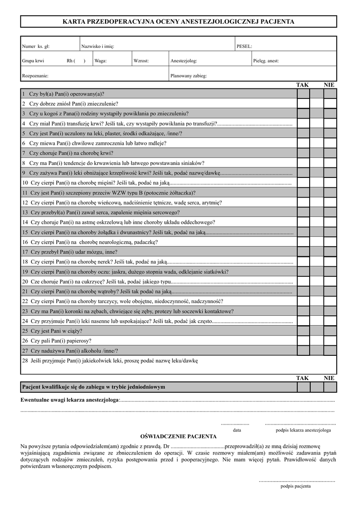 karta przedoperacyjna oceny anestezjologicznej pacjenta